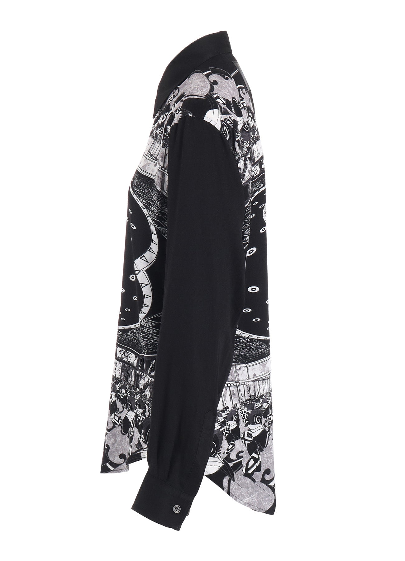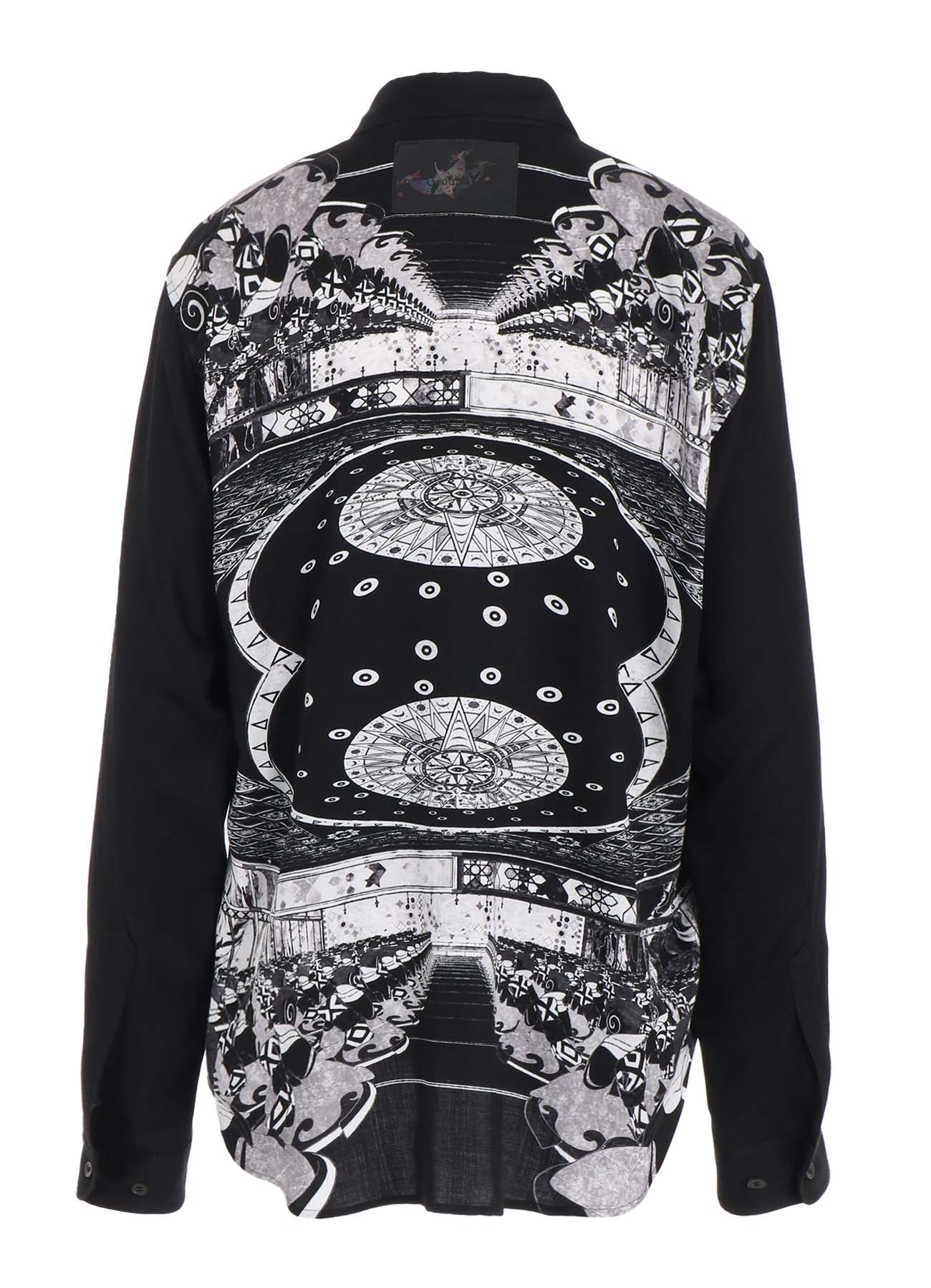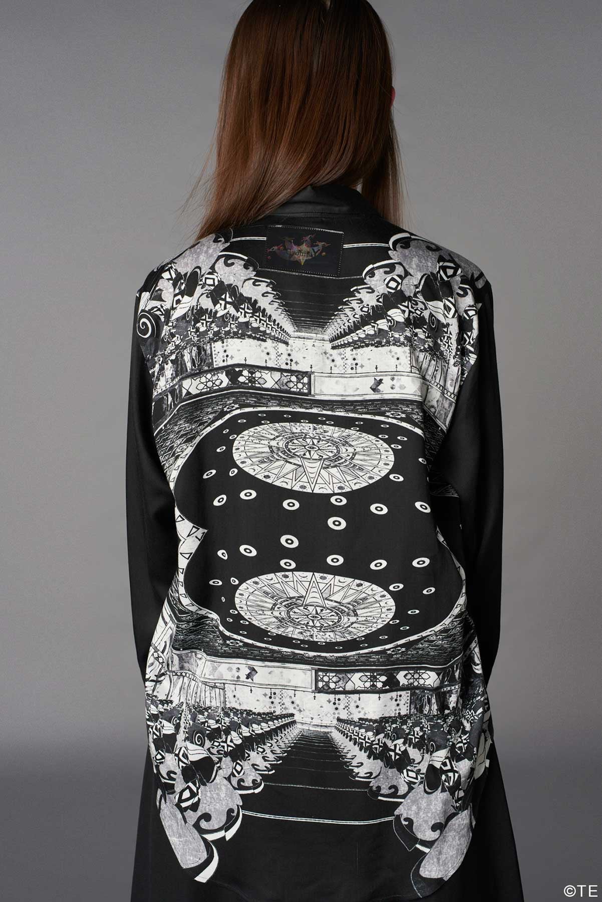 - 人造絲緞襯衫展示“Mononoke”電影中的大廳圖案。