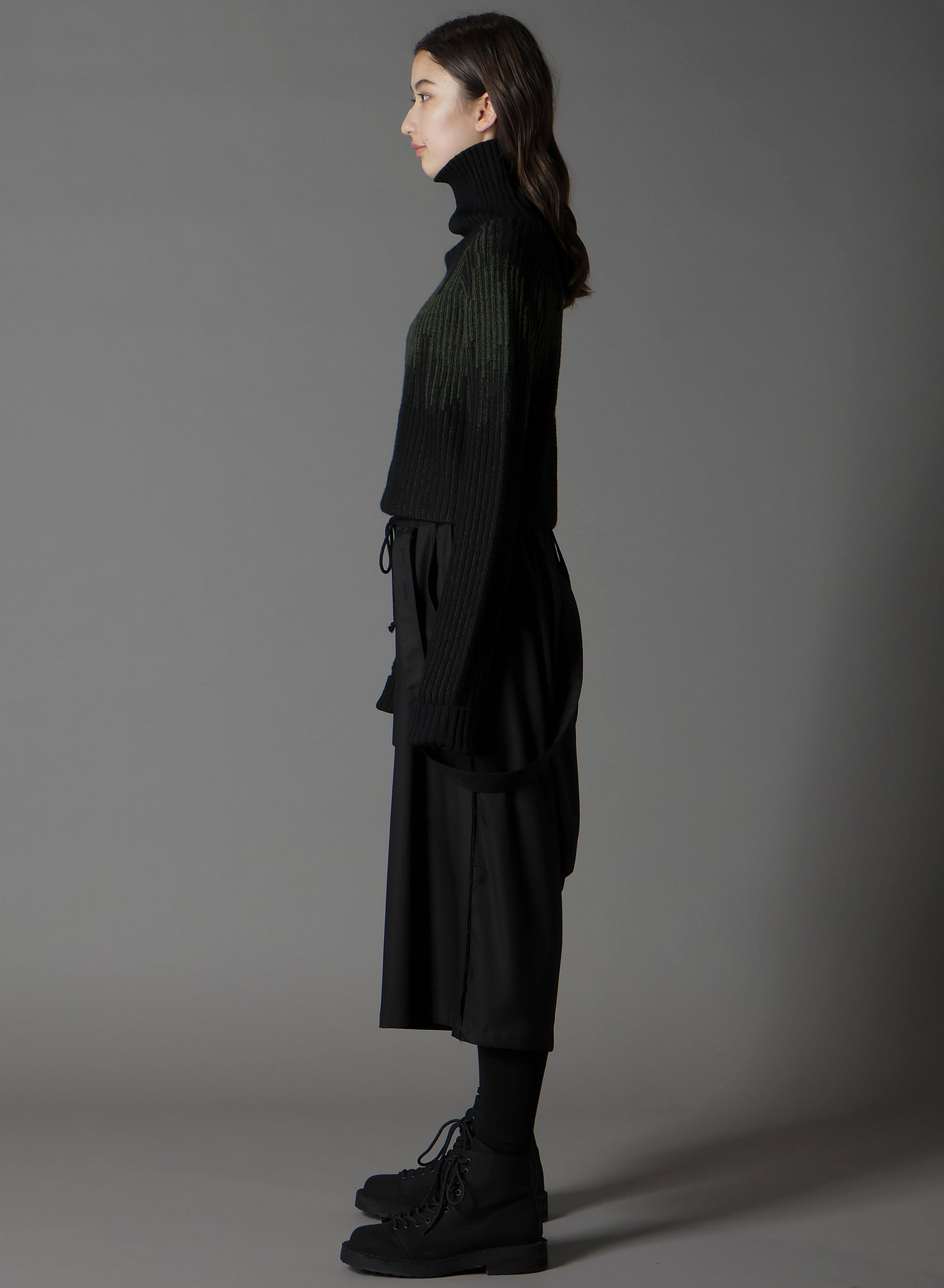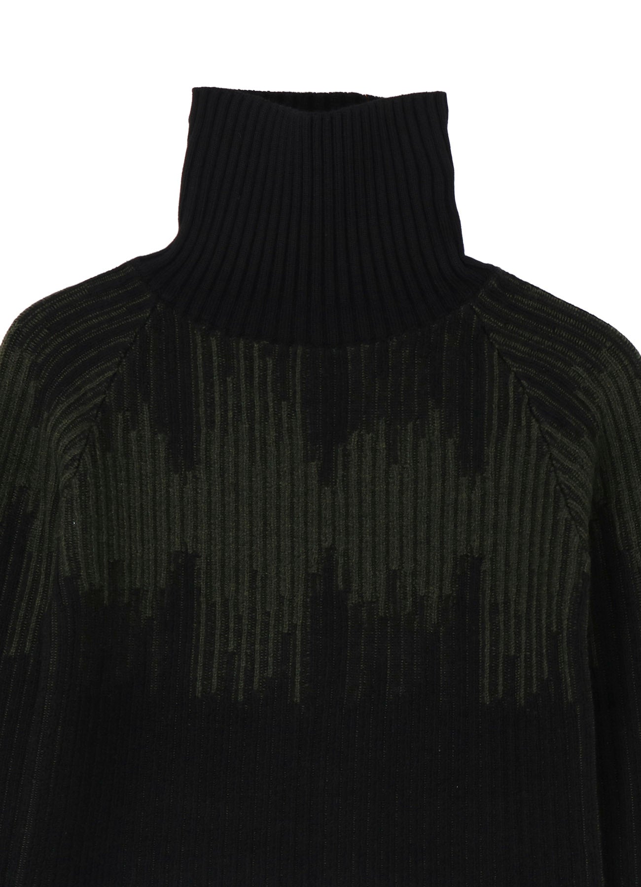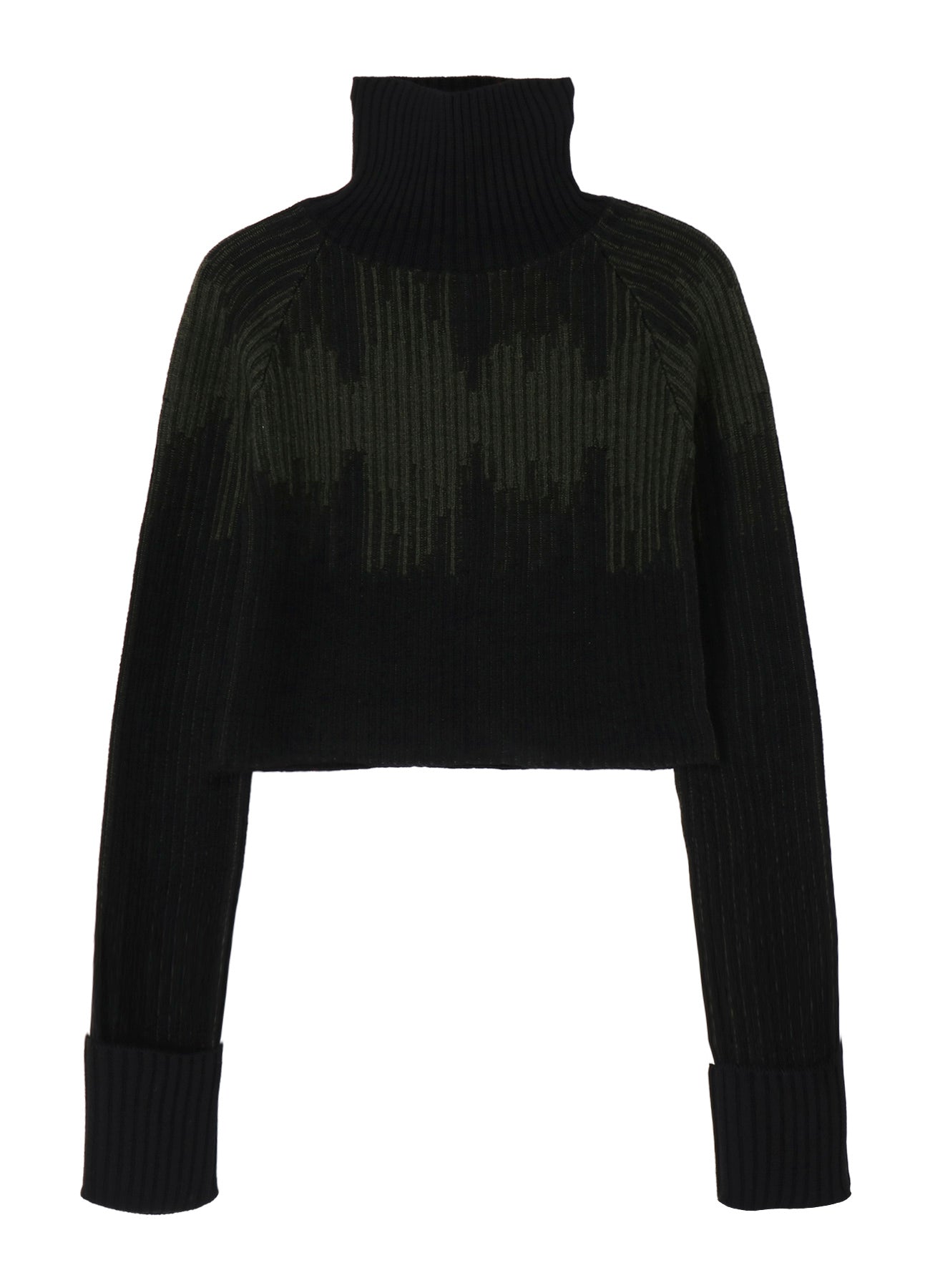 This short-length turtleneck knit from the Ground Y 2025-26 Autumn/Winter Collection is crafted using high-quality ultra-fine wool and Italian spinning techniques. It's known for its lightweight and fluffy texture. The unique jacquard-inspired knitting creates a striking bicolor diamond-esque pattern. Sleeves are designed to be worn folded to add volume.