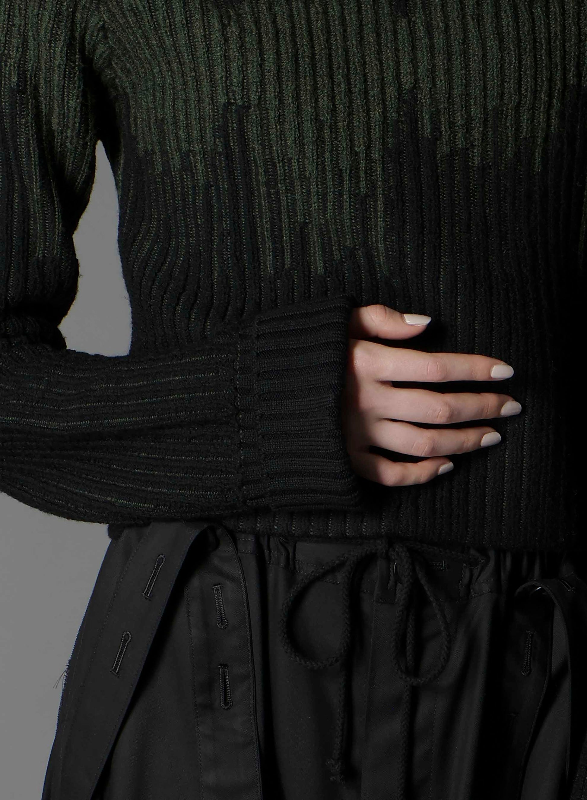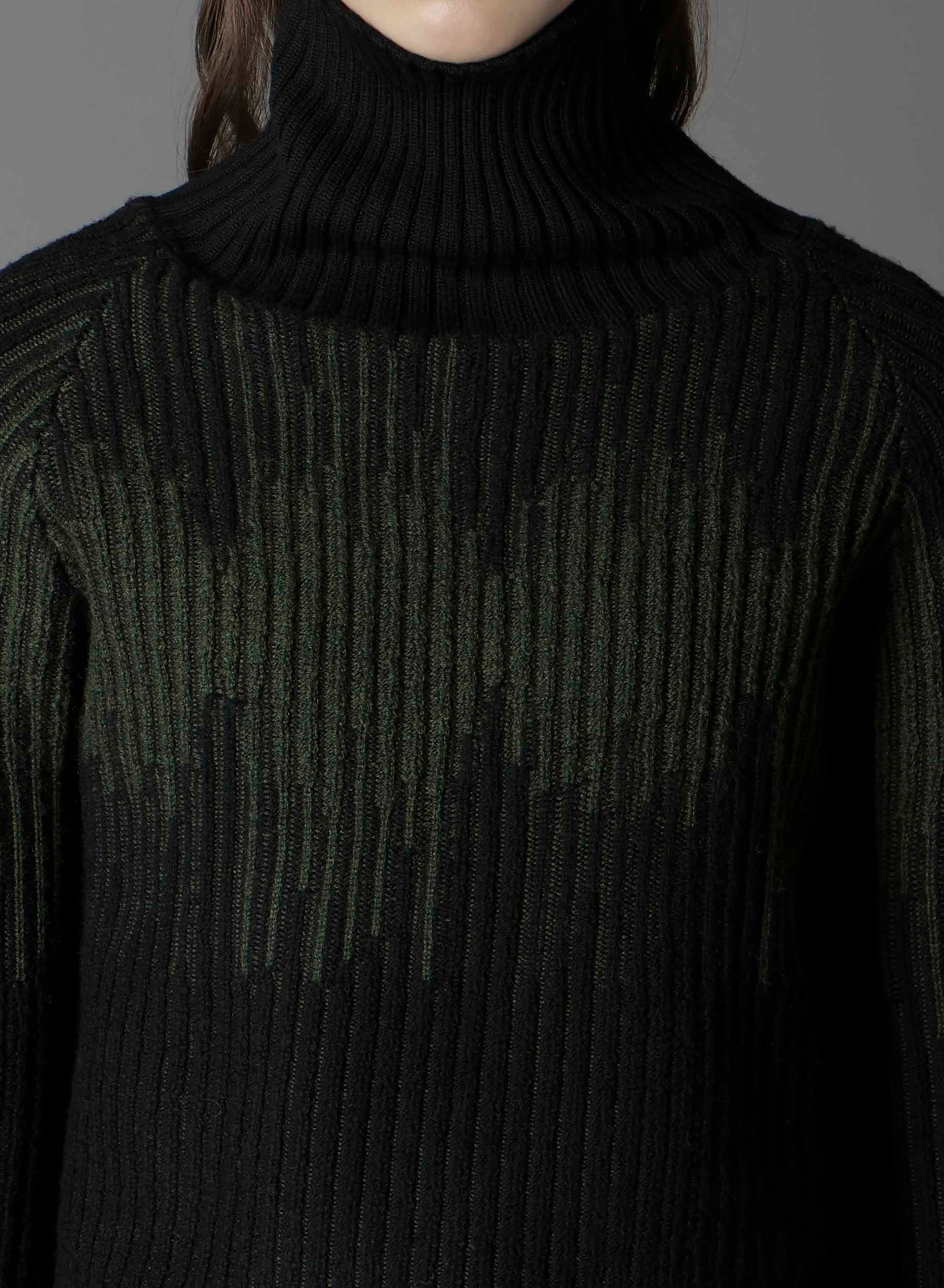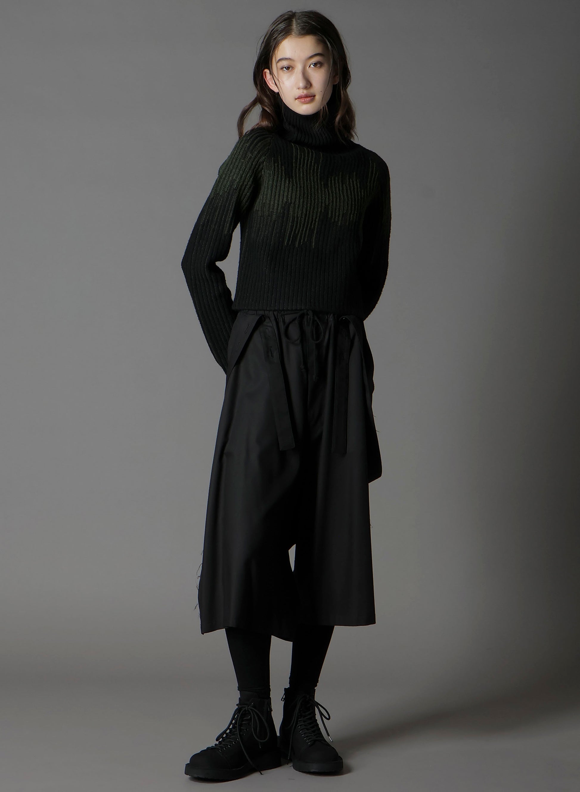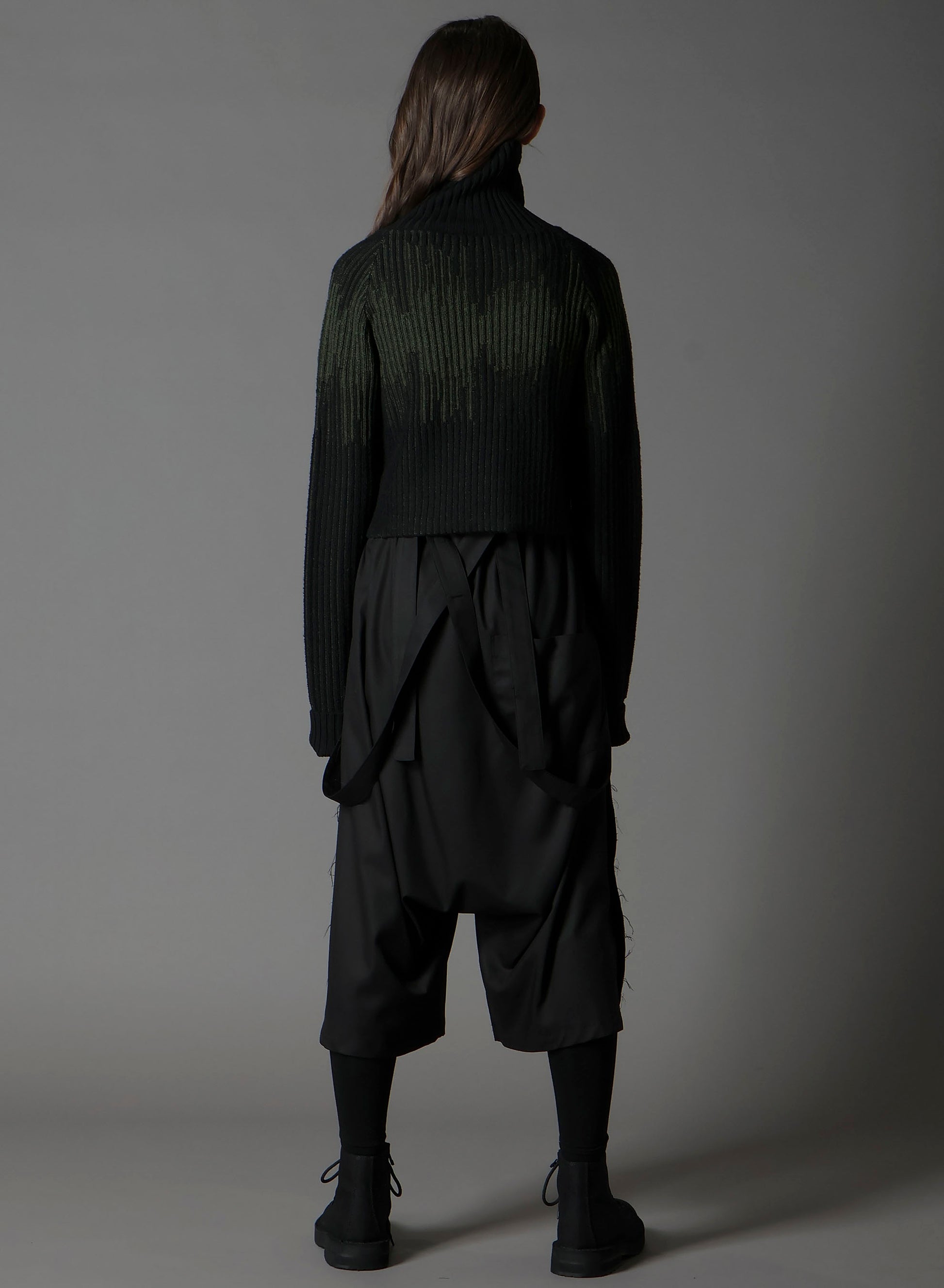 This short-length turtleneck knit from the Ground Y 2025-26 Autumn/Winter Collection is crafted using high-quality ultra-fine wool and Italian spinning techniques. It's known for its lightweight and fluffy texture. The unique jacquard-inspired knitting creates a striking bicolor diamond-esque pattern. Sleeves are designed to be worn folded to add volume.