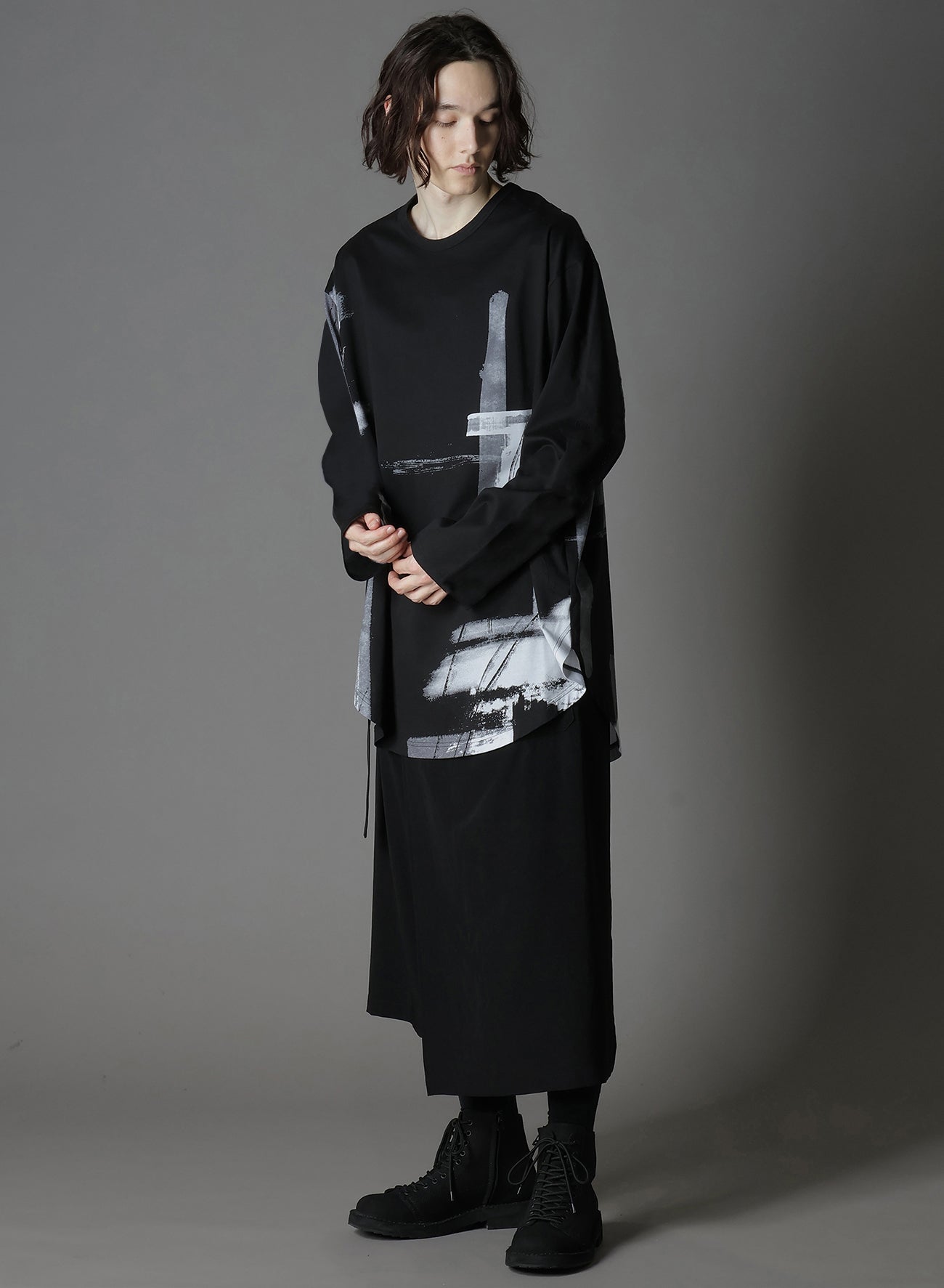 - 圓弧形下擺 Oversized 輪廓 - 舒適面料,印有筆觸圖案 - 筆觸寬度和力度的變化形成獨特質感 - 屬於 Ground Y 的 2025-26 秋冬系列 - 適合作為多樣造型中的藝術時尚單品純棉 100% 部分純棉 100%