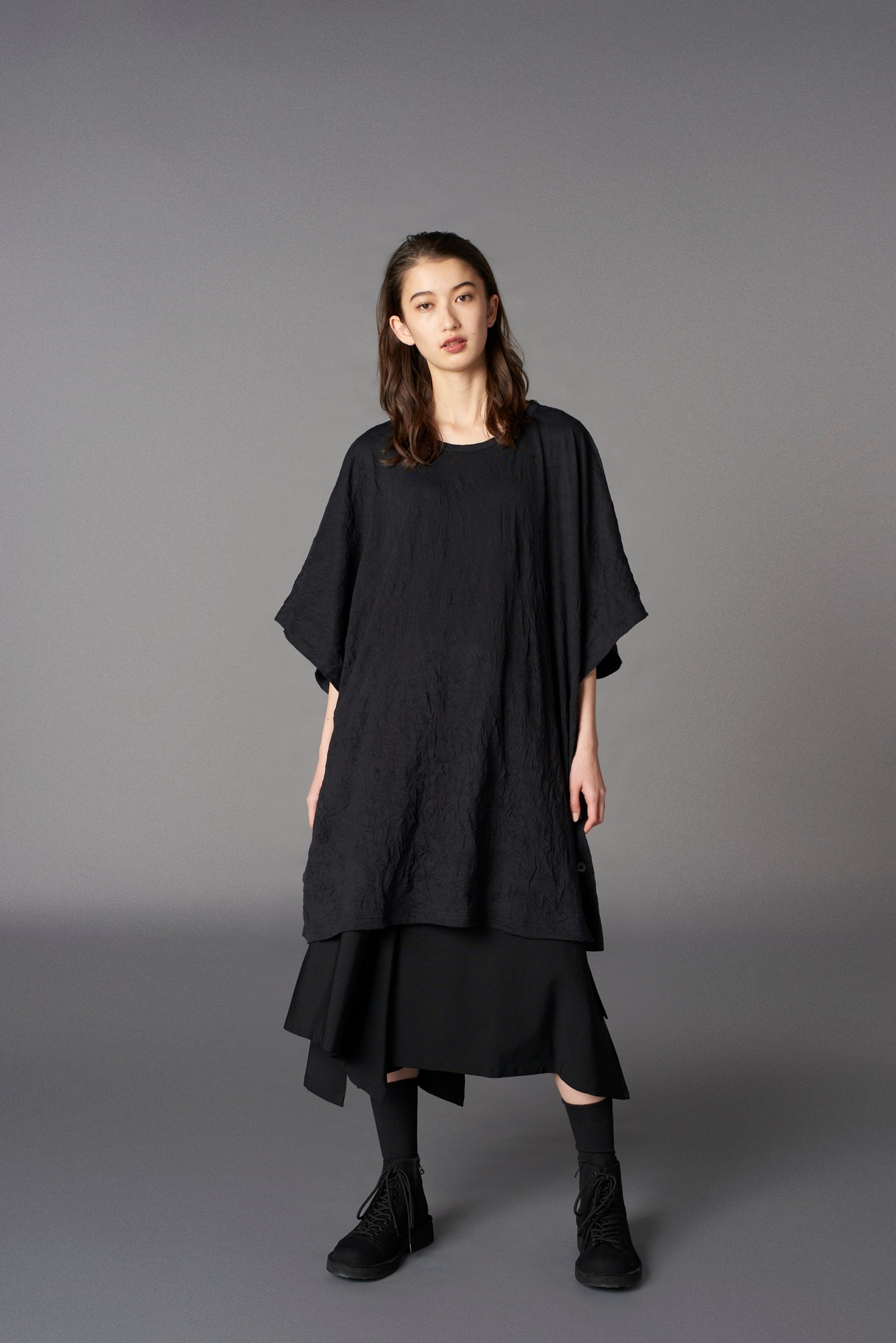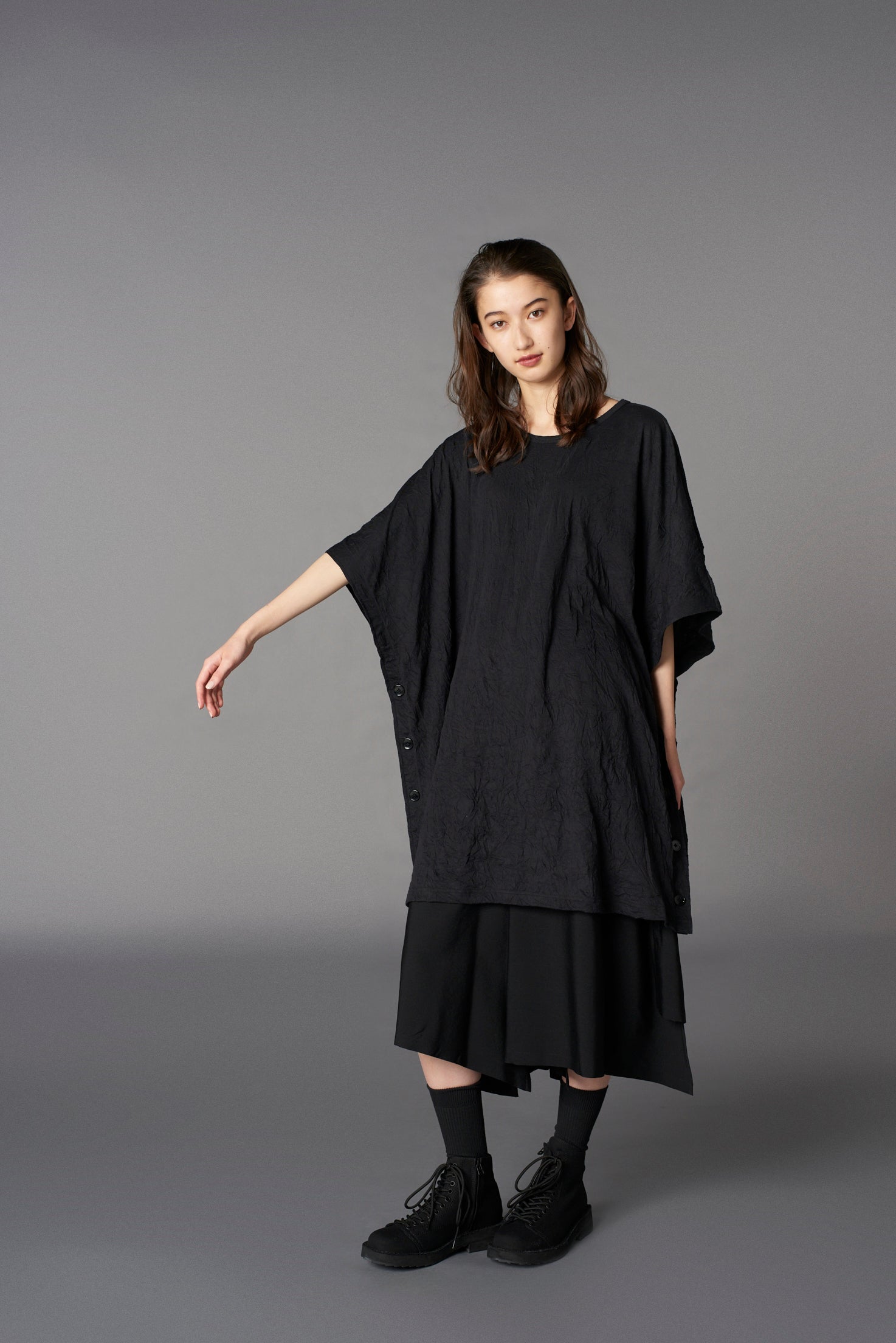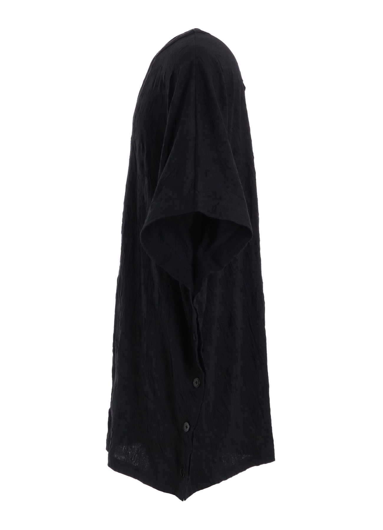 Ground Y 2025 春夏系列的A字上衣具有斗篷般的設計,側面有鈕扣點綴。可與襯衫層次搭配,展現個性化造型。由棉和聚酯纖維混紡製成,手工皺摺處理帶來獨特質感與自然手感。