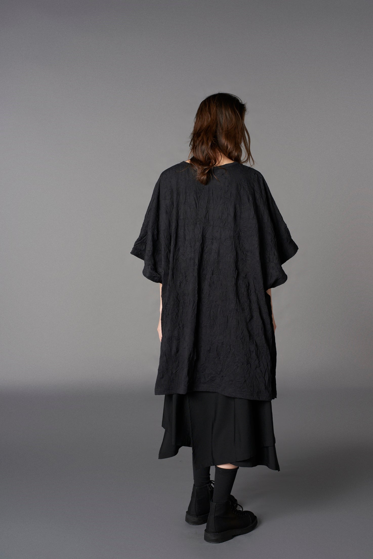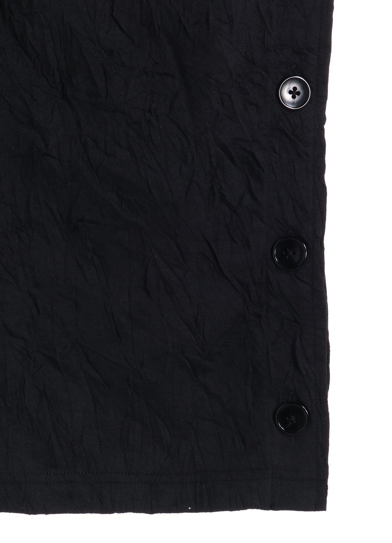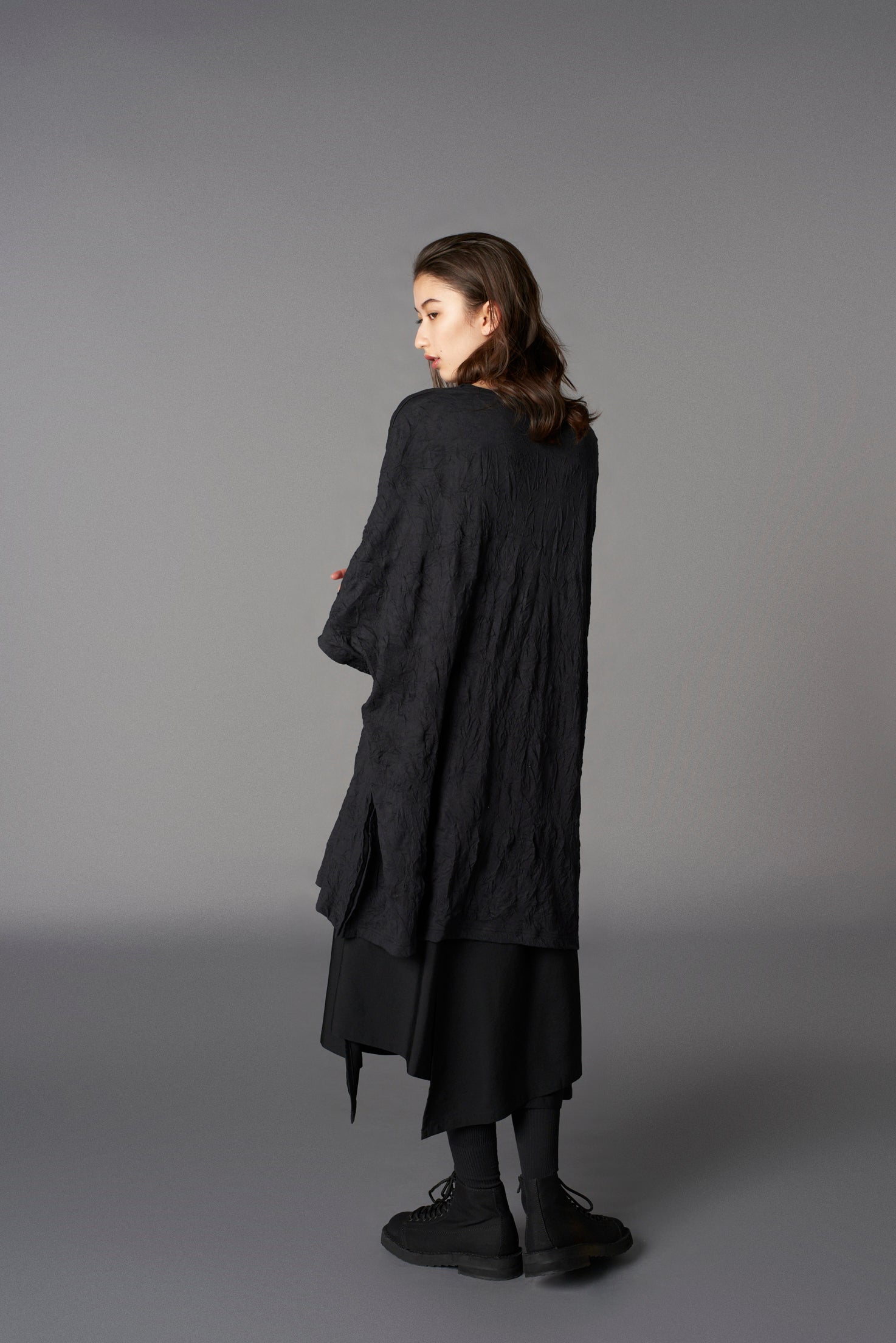 Ground Y 2025 春夏系列的A字上衣具有斗篷般的設計,側面有鈕扣點綴。可與襯衫層次搭配,展現個性化造型。由棉和聚酯纖維混紡製成,手工皺摺處理帶來獨特質感與自然手感。