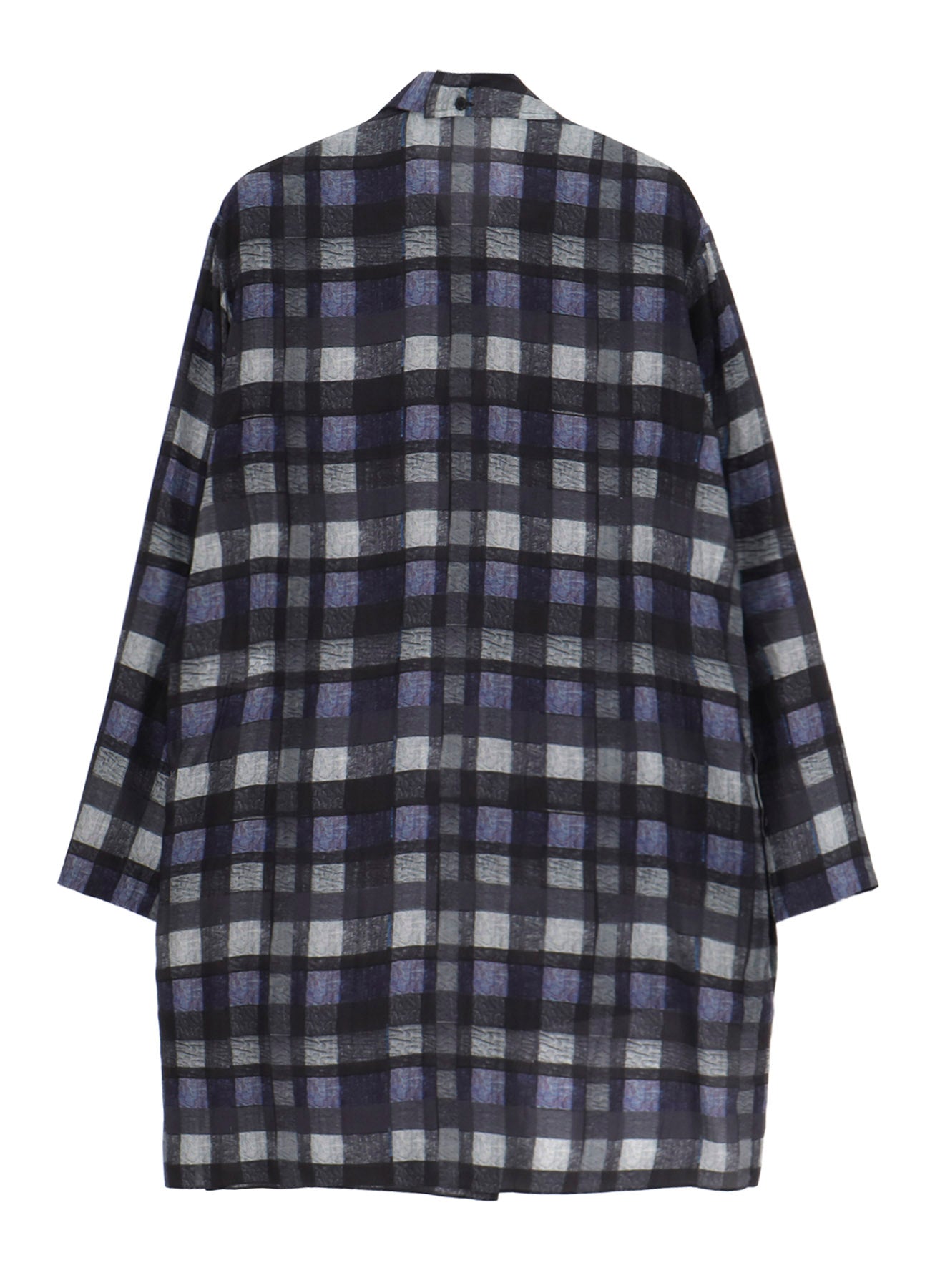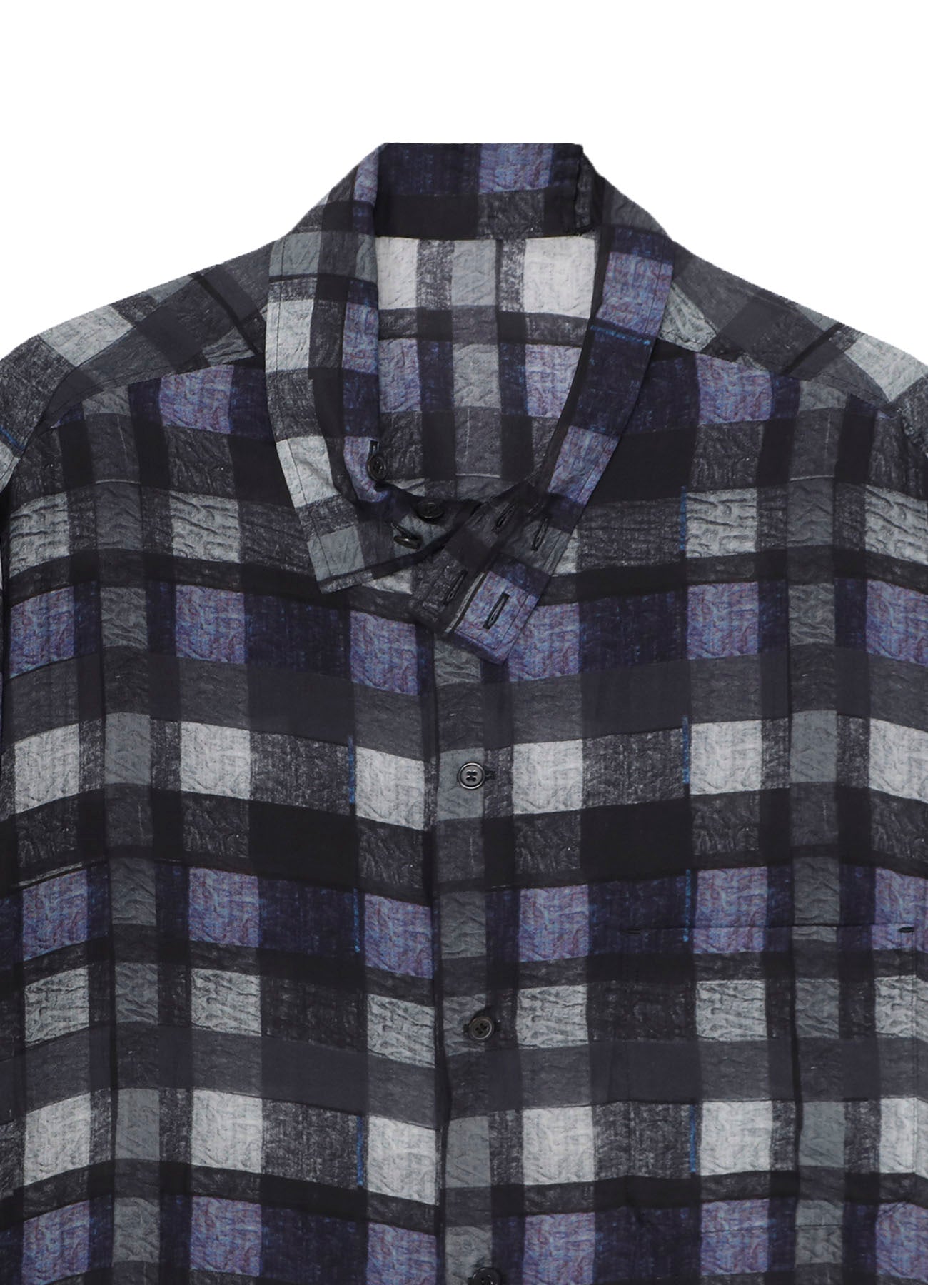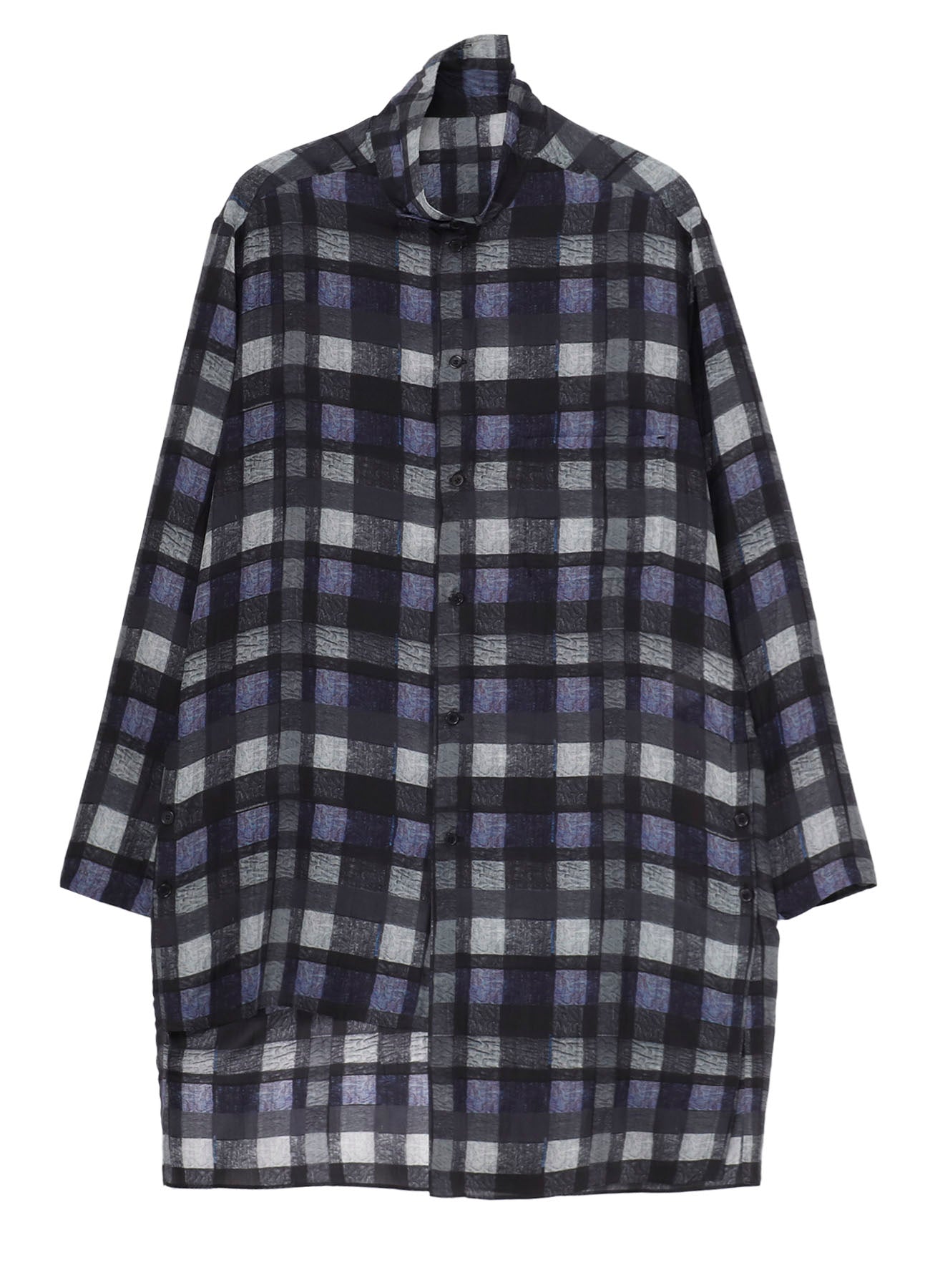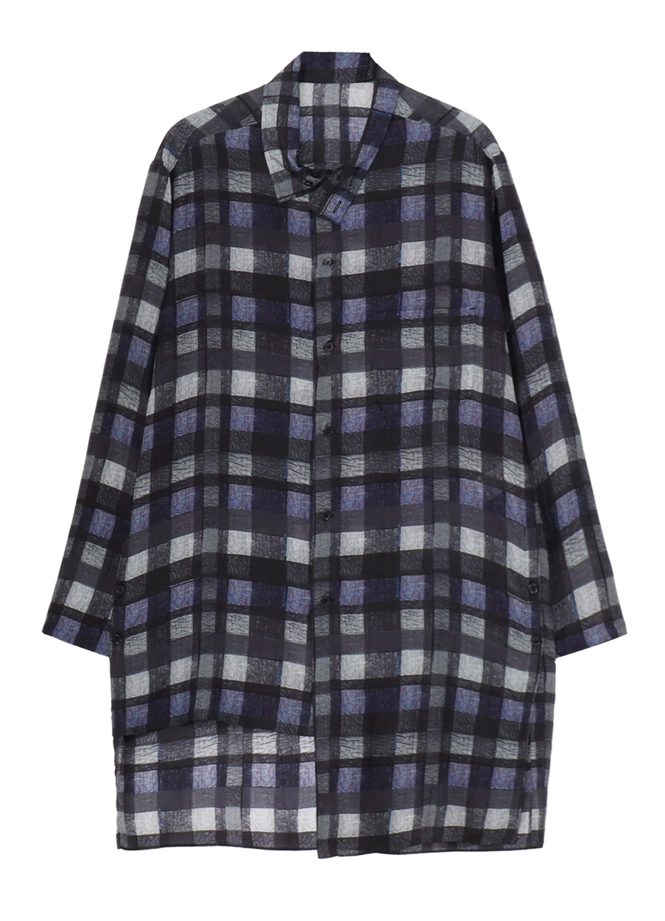 這款立領襯衫採用質地柔軟且富有光澤的habutae製成,具有優雅的亮面質感。左右不對稱的下擺為本季增添時尚感。紫色的格紋圖案通過墨水噴射技術在京都工廠印製。
