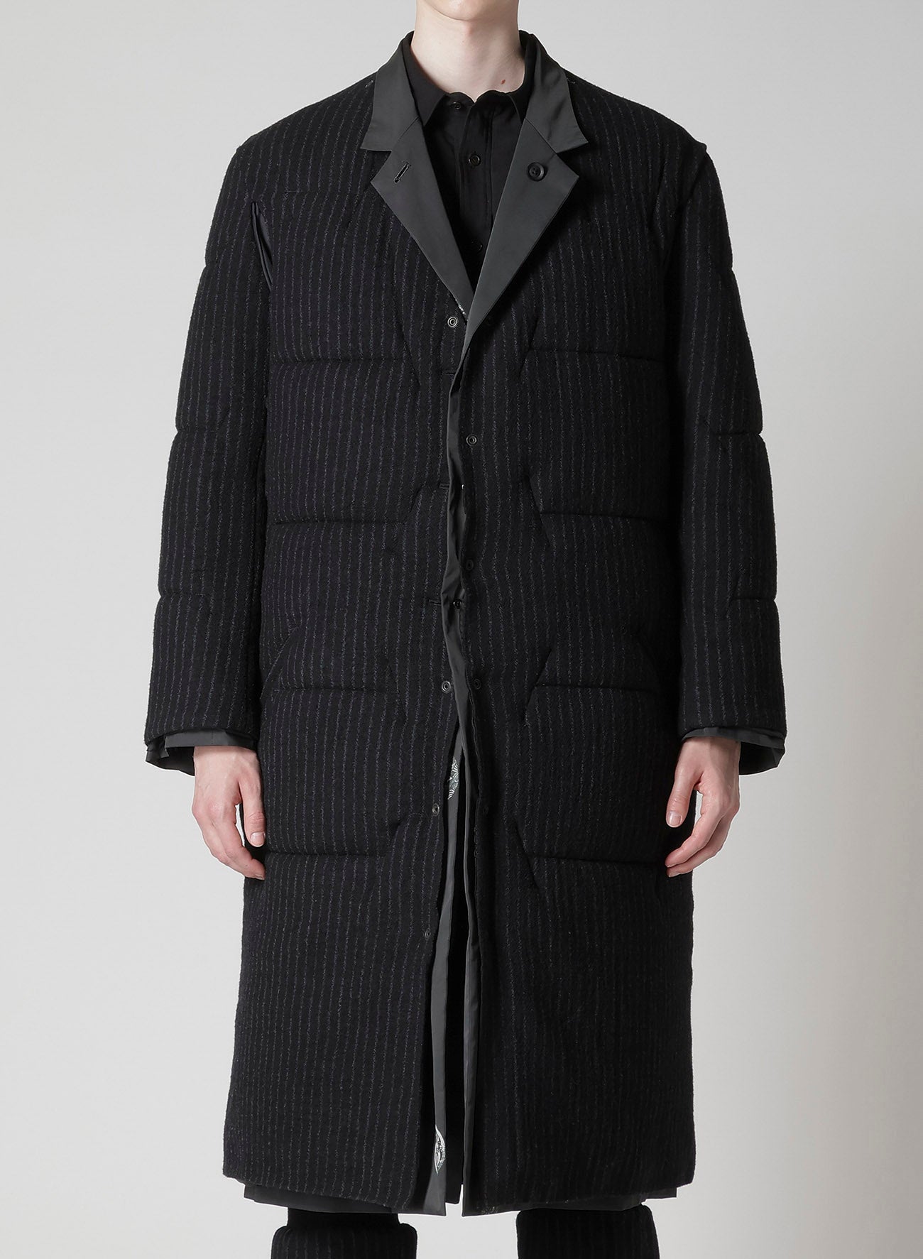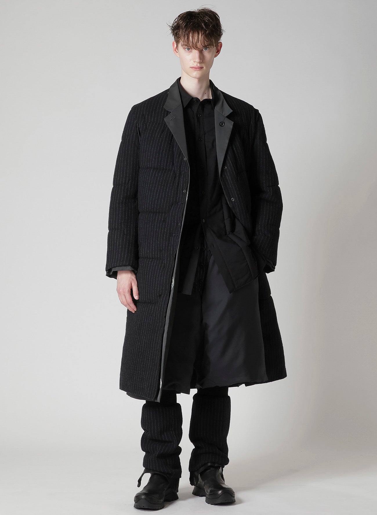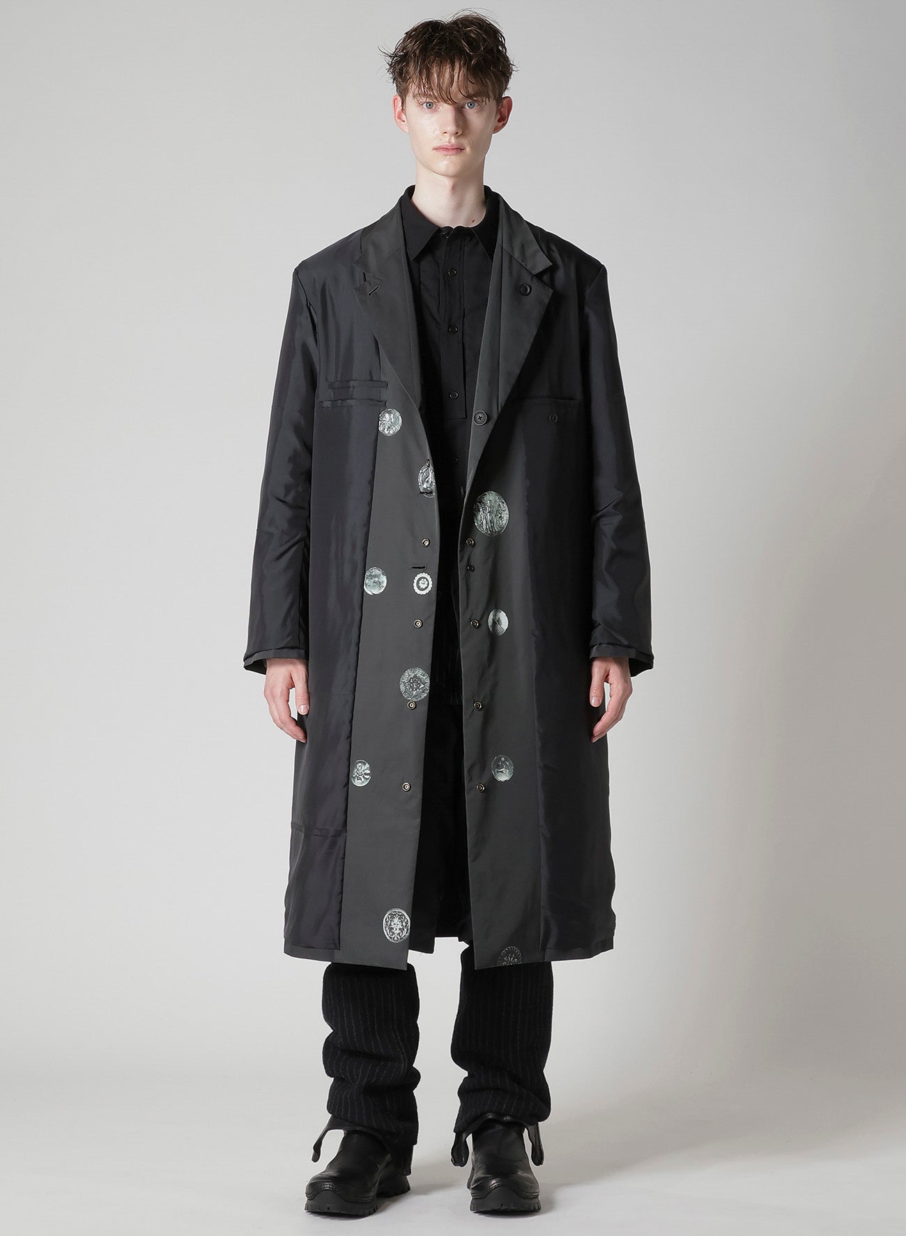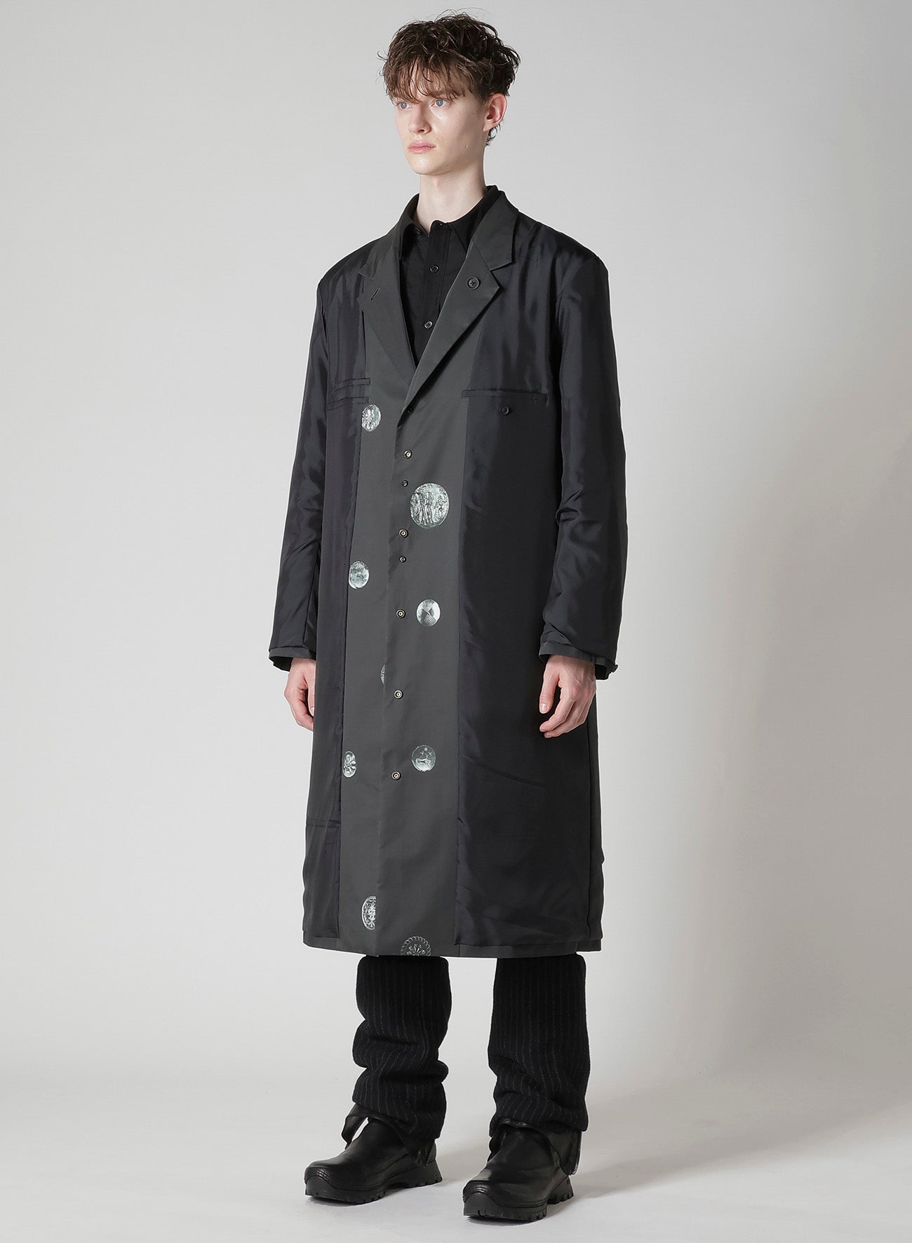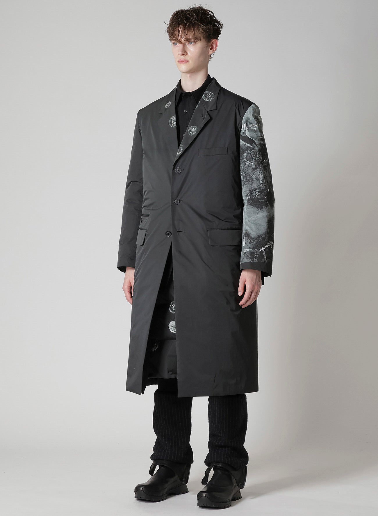 For the A/W 2025-26 Yohji Yamamoto POUR HOMME collection, Look 5 features a reversible padded long jacket. Its twill weave, made of 50d polyester threads, boasts a smooth texture. The fabric is inkjet printed in Kyoto with a nude collage and button motif.