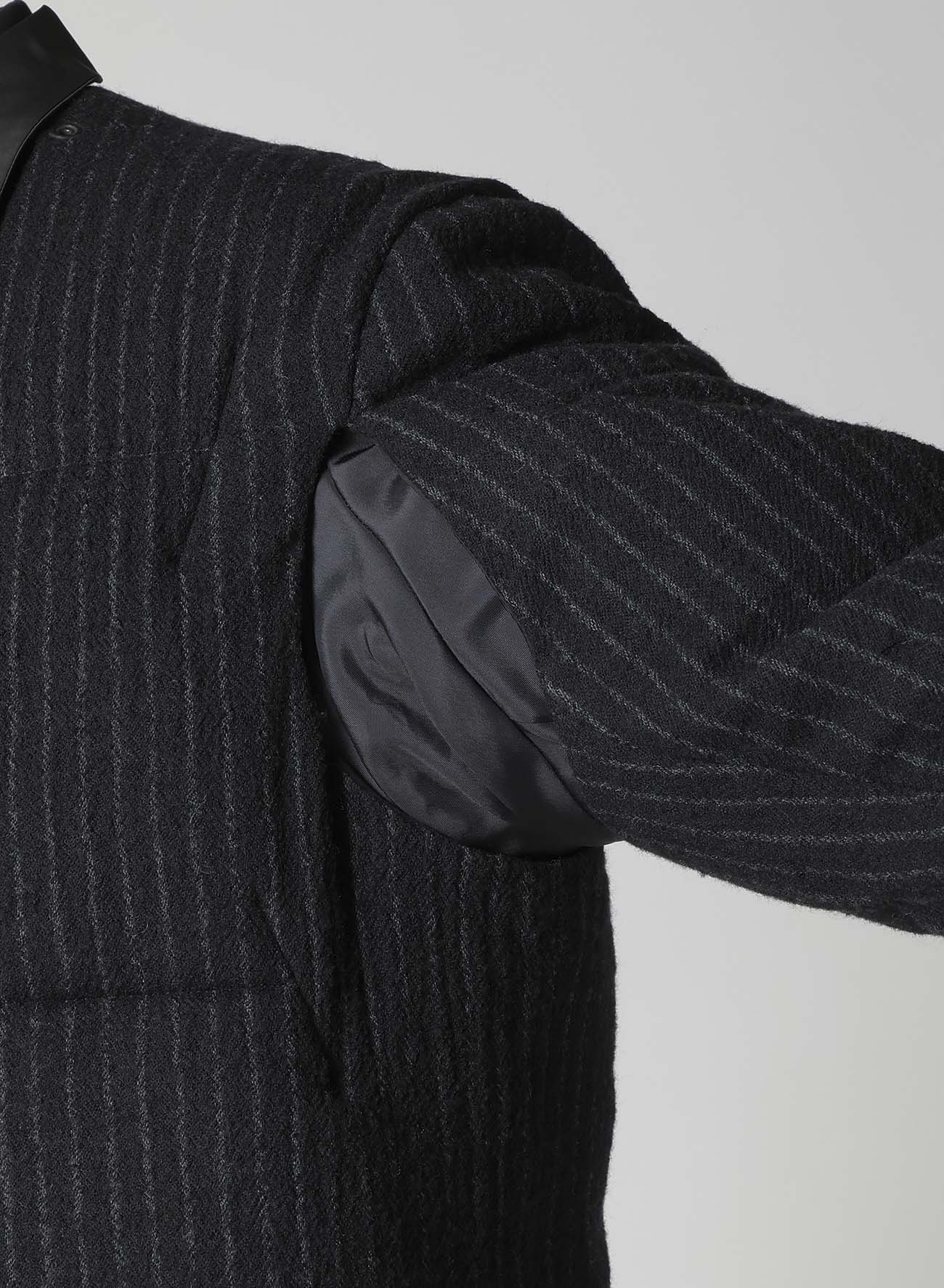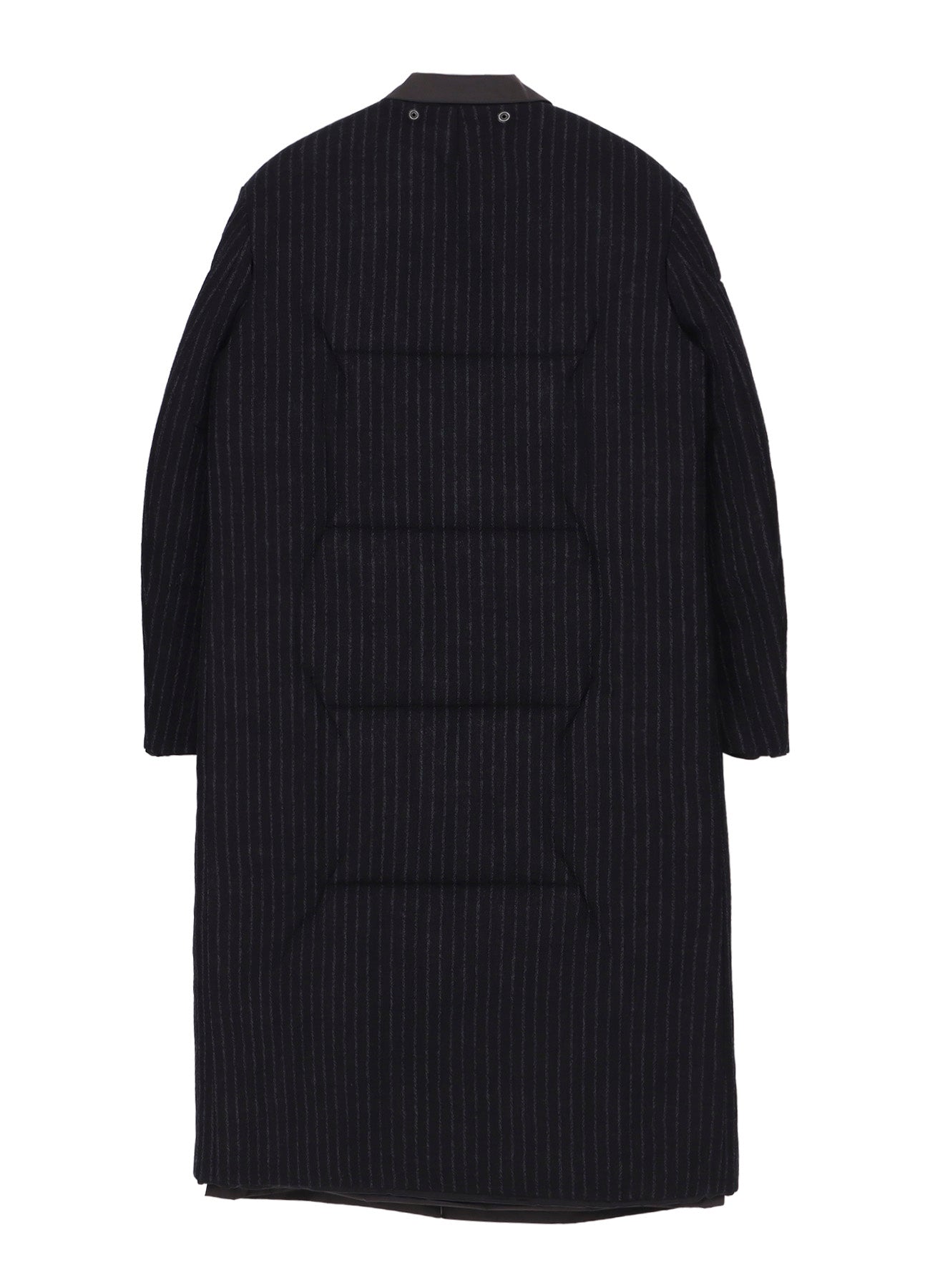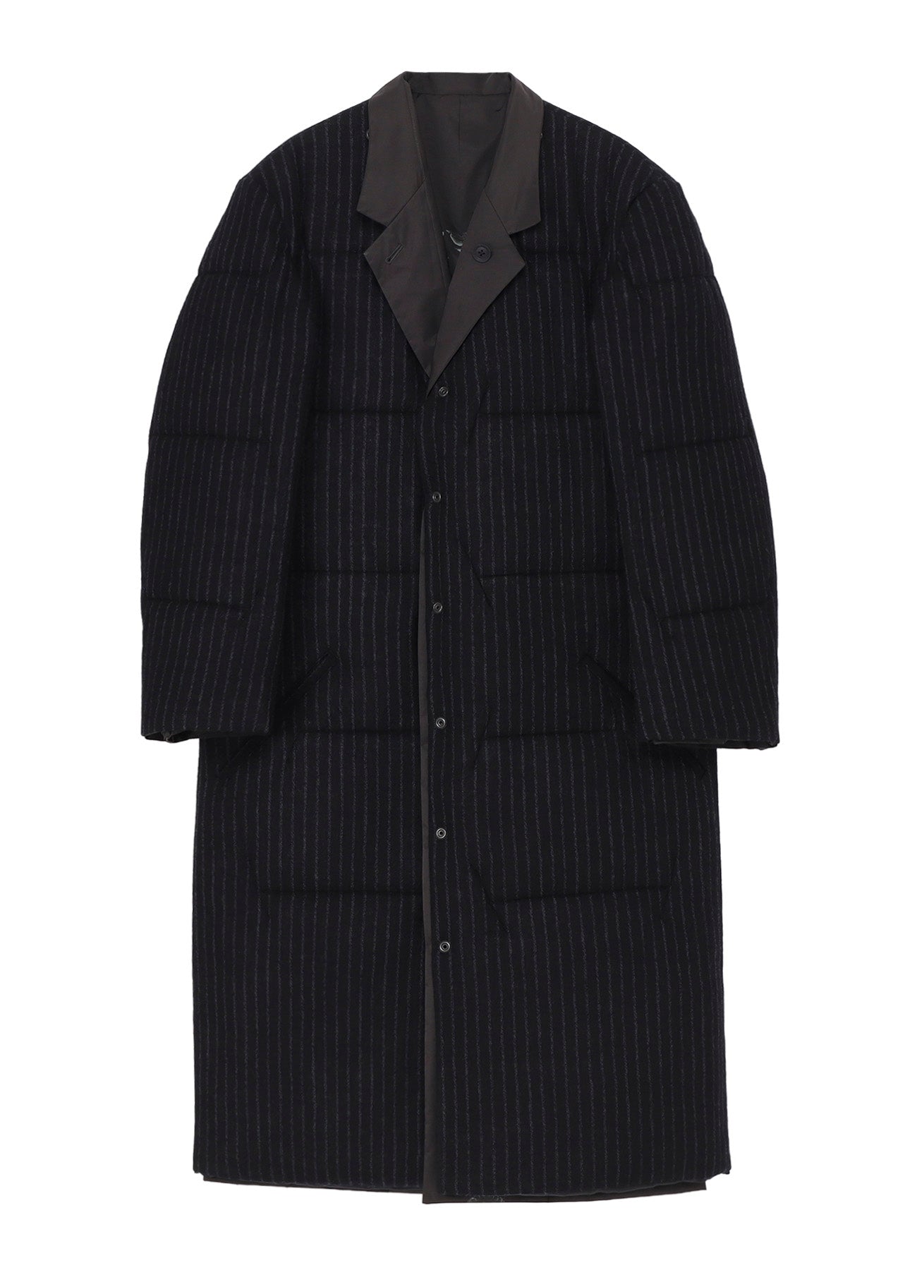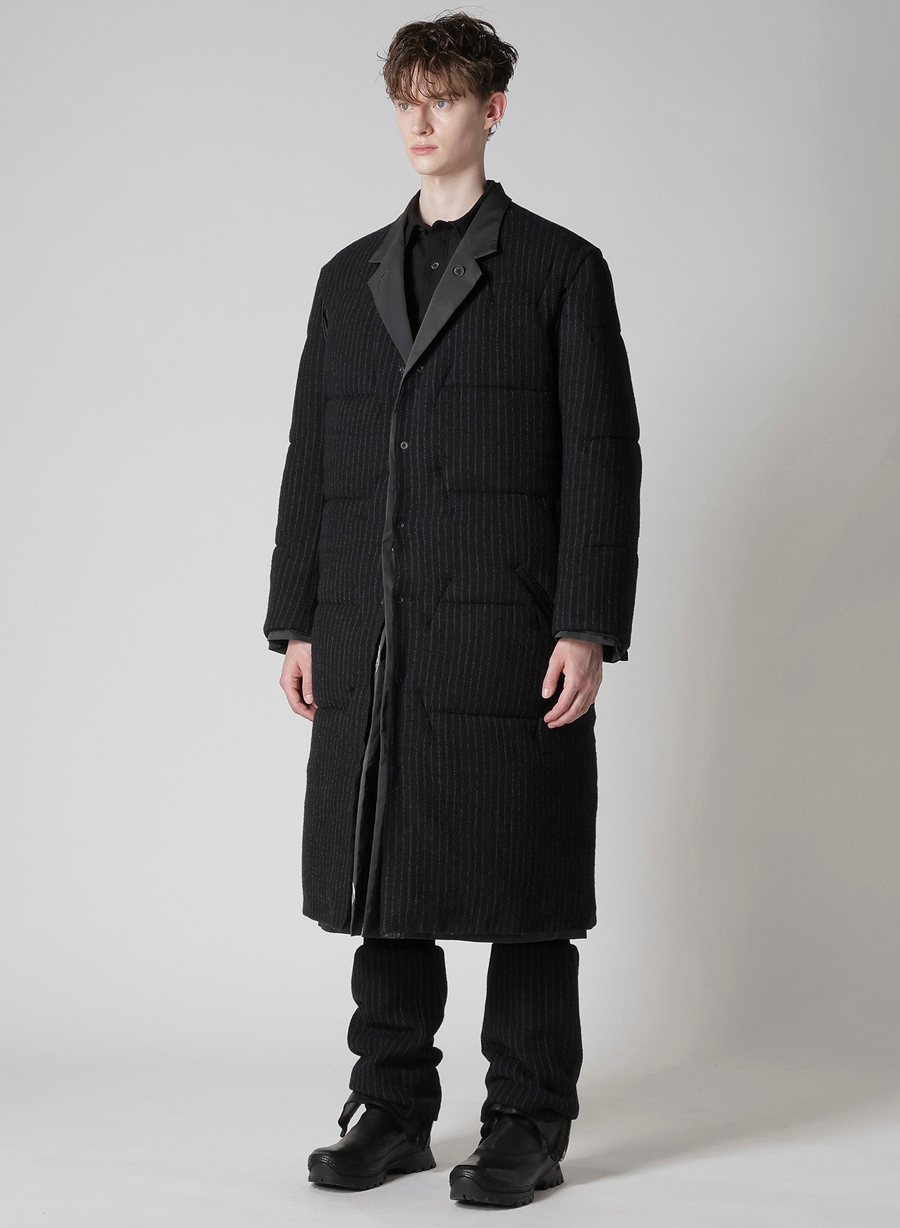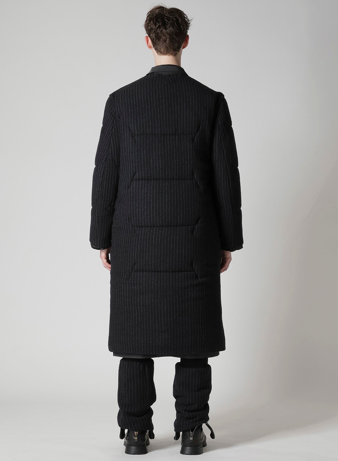 For the A/W 2025-26 Yohji Yamamoto POUR HOMME collection, Look 5 features a reversible padded long jacket. Its twill weave, made of 50d polyester threads, boasts a smooth texture. The fabric is inkjet printed in Kyoto with a nude collage and button motif.