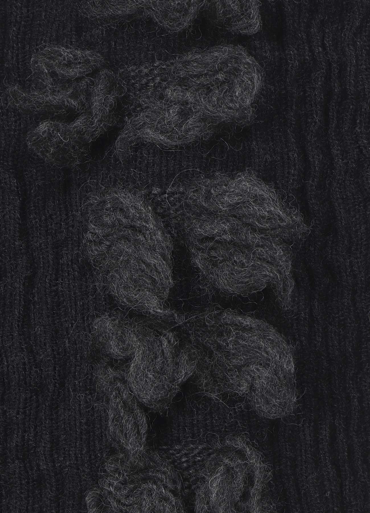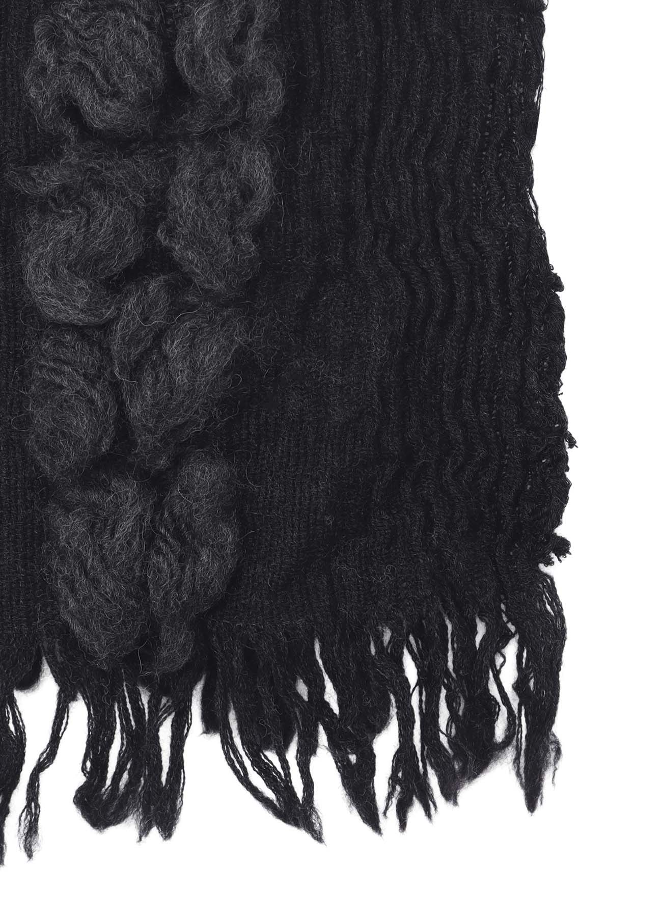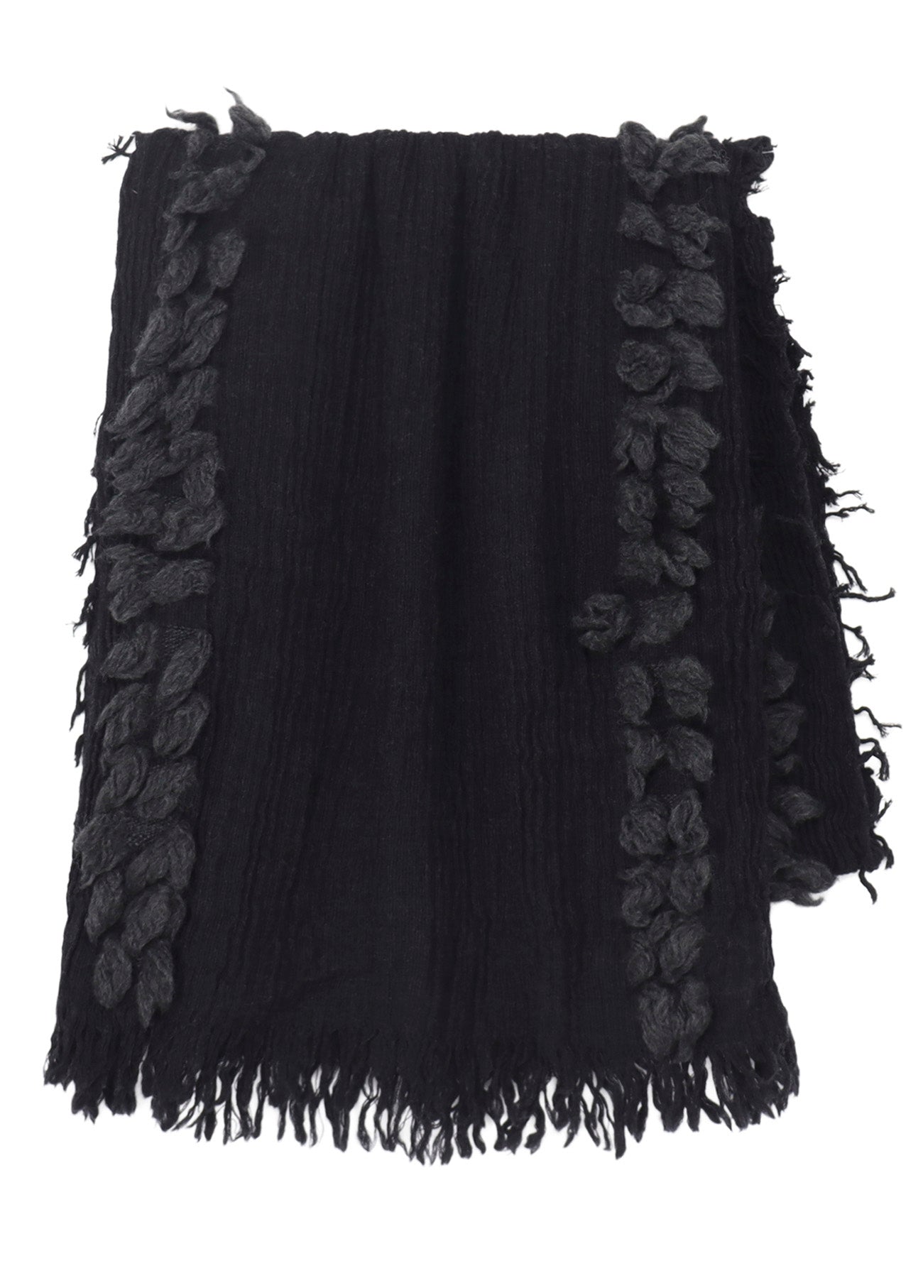 This unique scarf, combining wool yarn with wool slub yarn, features a crepe-like texture and a distinctive design with slub yarn stripes on both sides. The base wool is treated with a crepe finish for added texture.