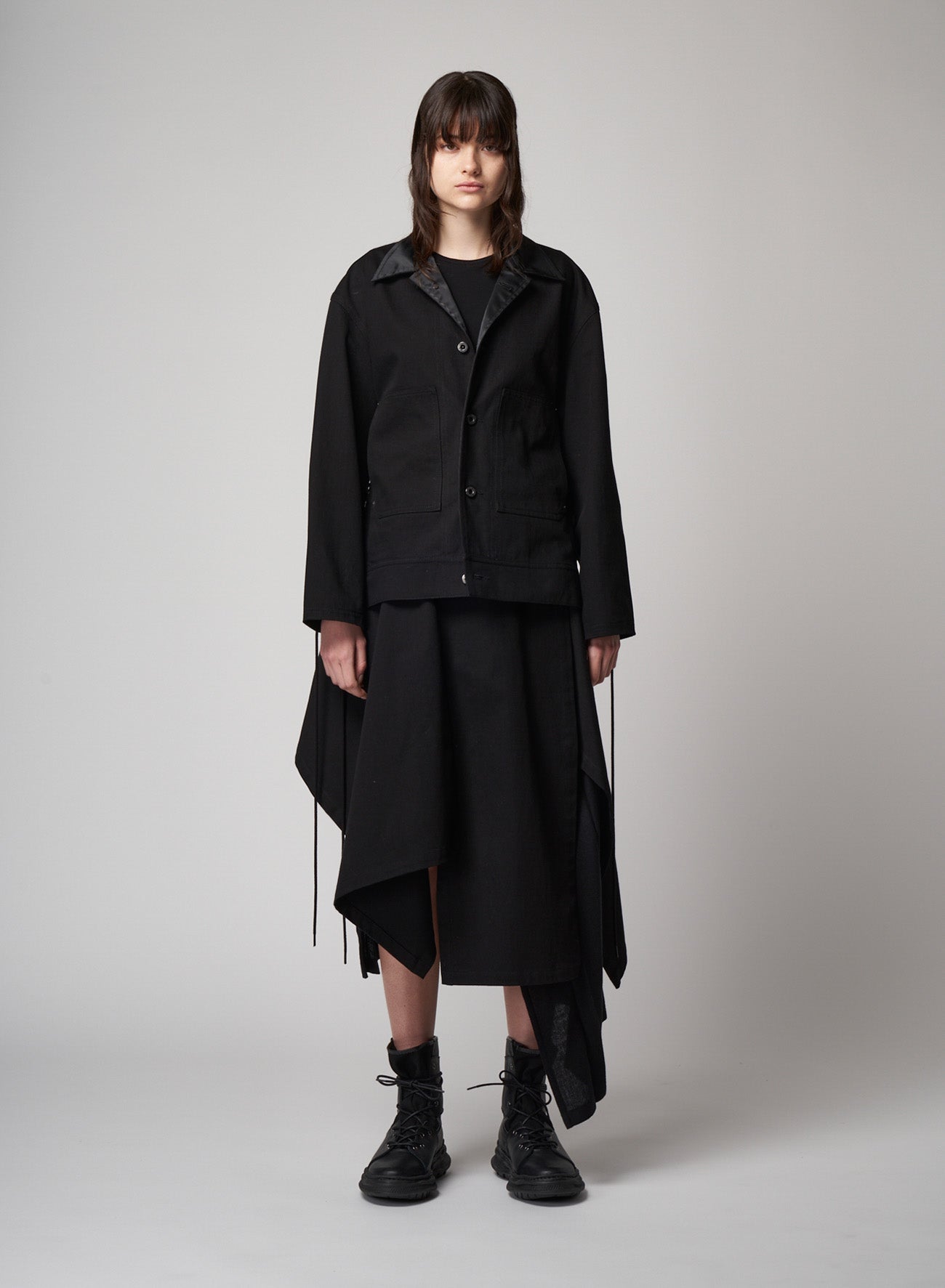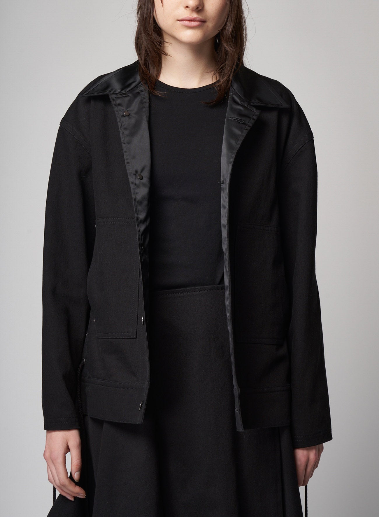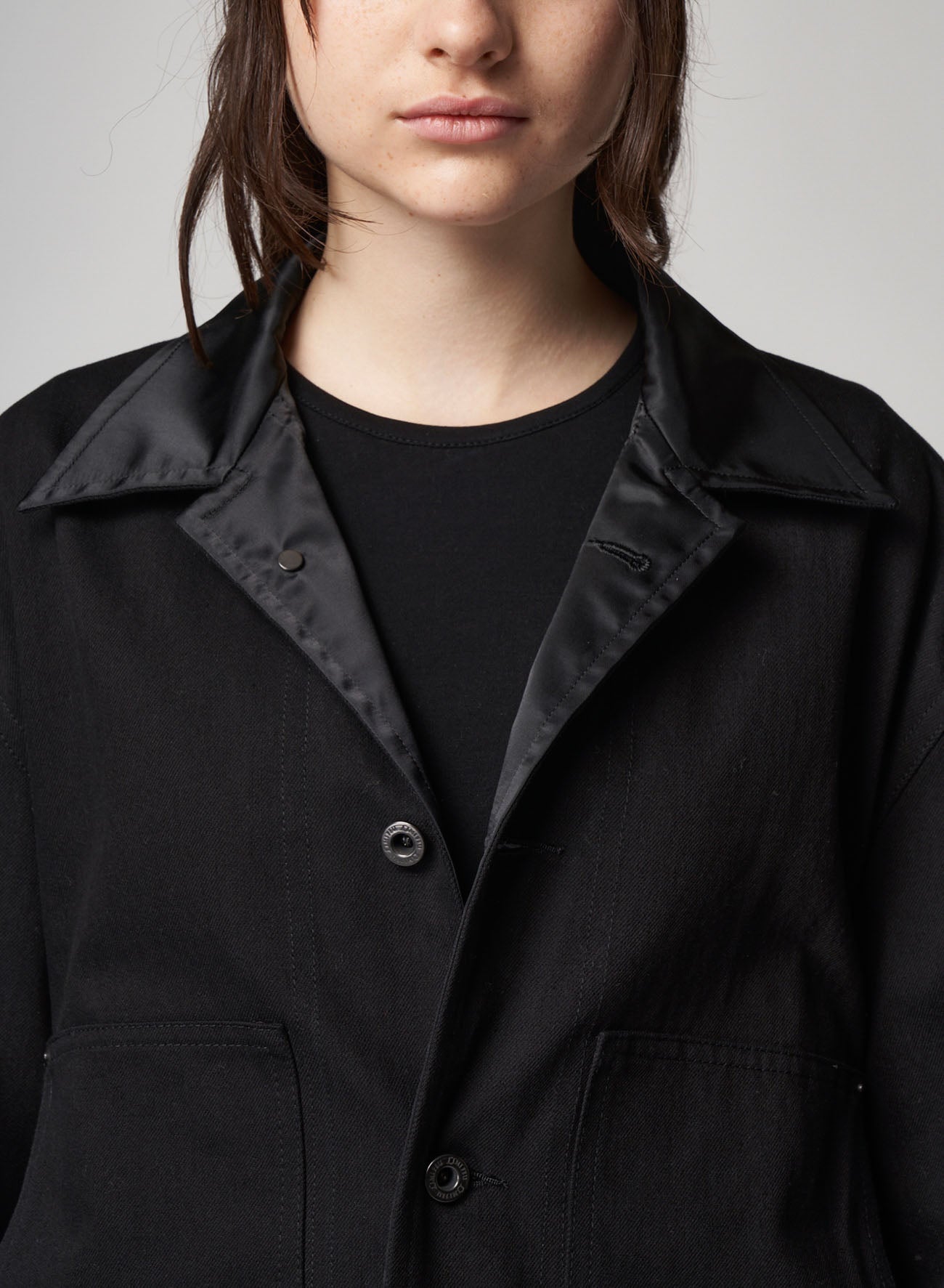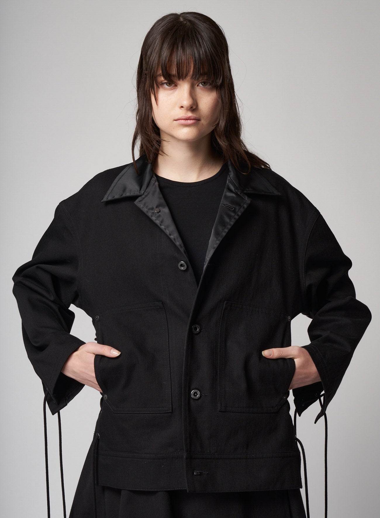 這件夾克具有襯衫領,結合了高度黑染的牛仔布和光滑耐用的尼龍斜紋布。引人注目的設計包括背部和側面的綁帶,顯示內搭服飾,便於與色彩鮮豔或圖案的單品進行多樣化搭配。