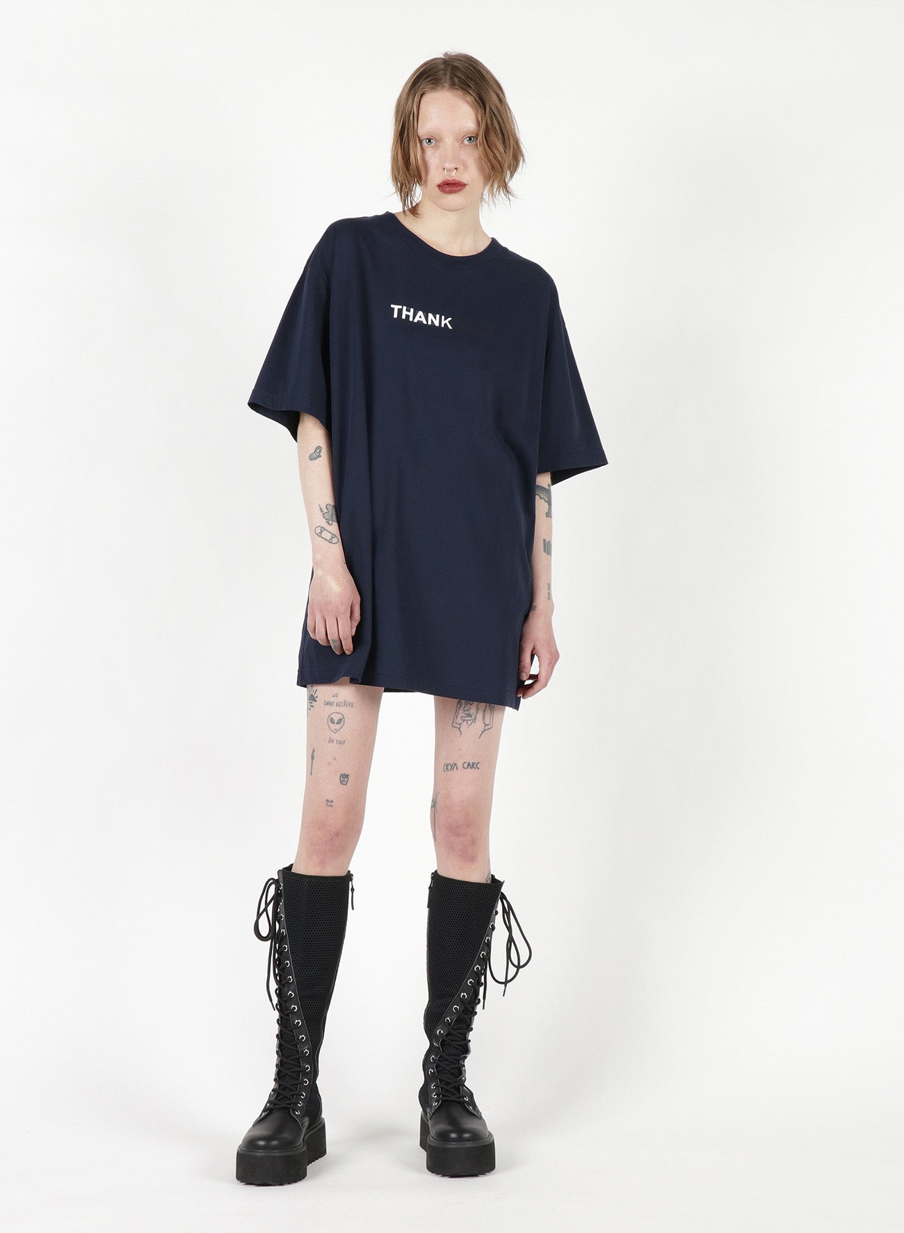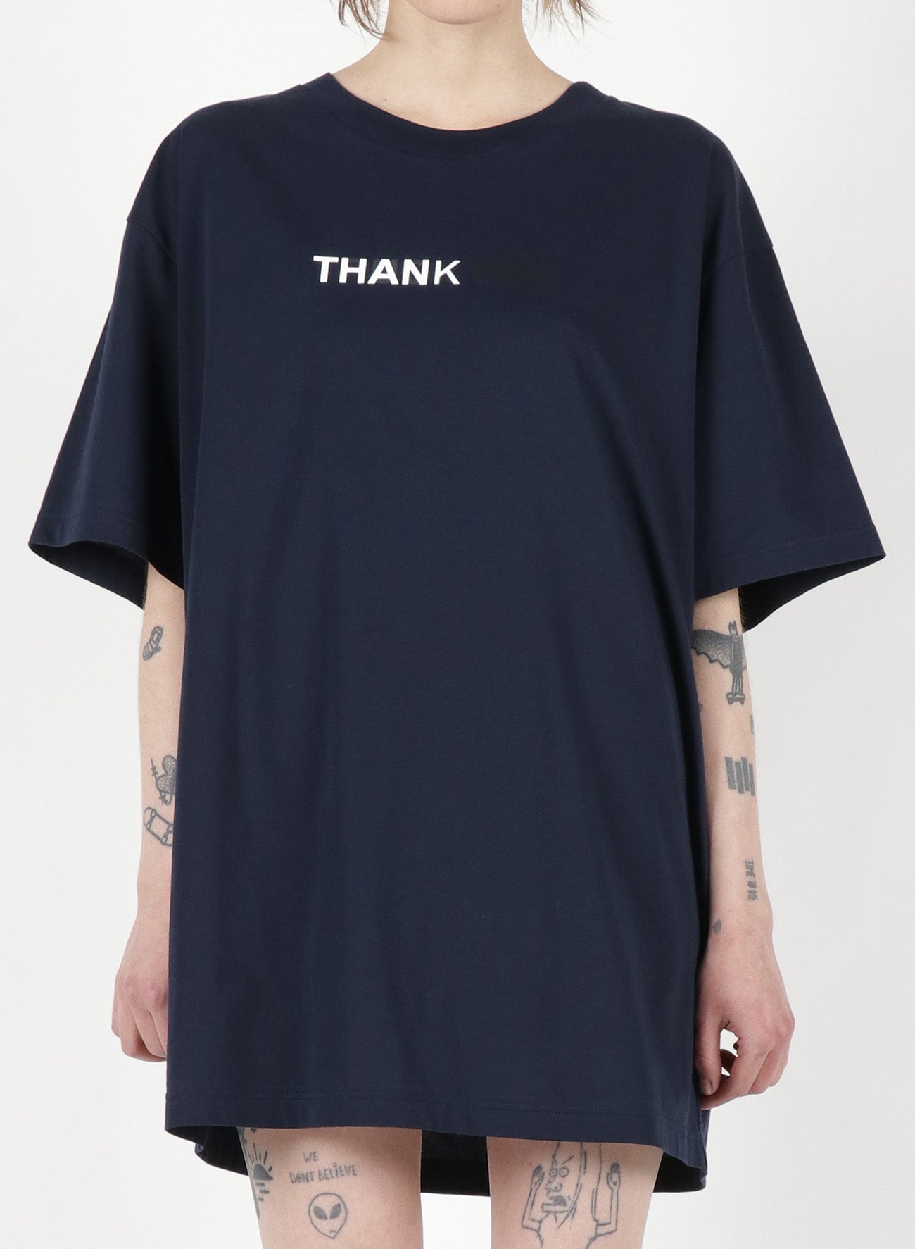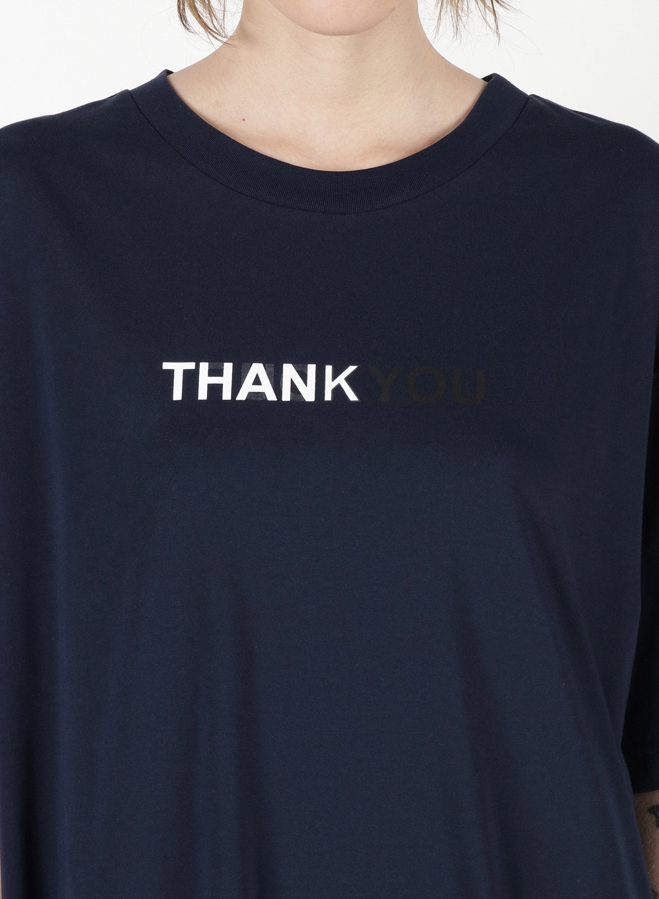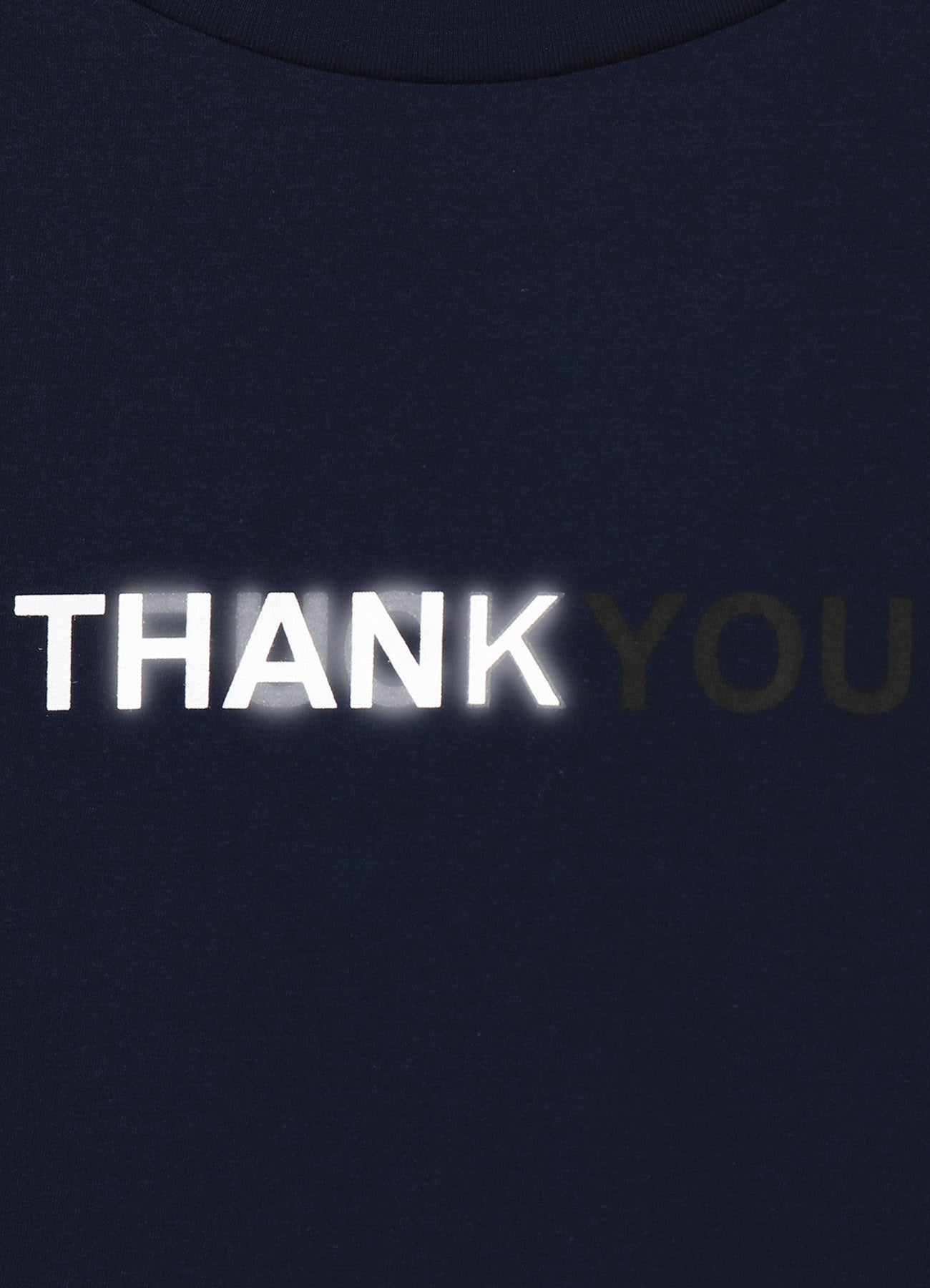 這款中性、寬鬆的T恤印有感謝信息,並包含反光材料,在閃光燈下會顯示隱藏信息。基本的輪廓和細微的設計元素使其適合所有性別穿著。