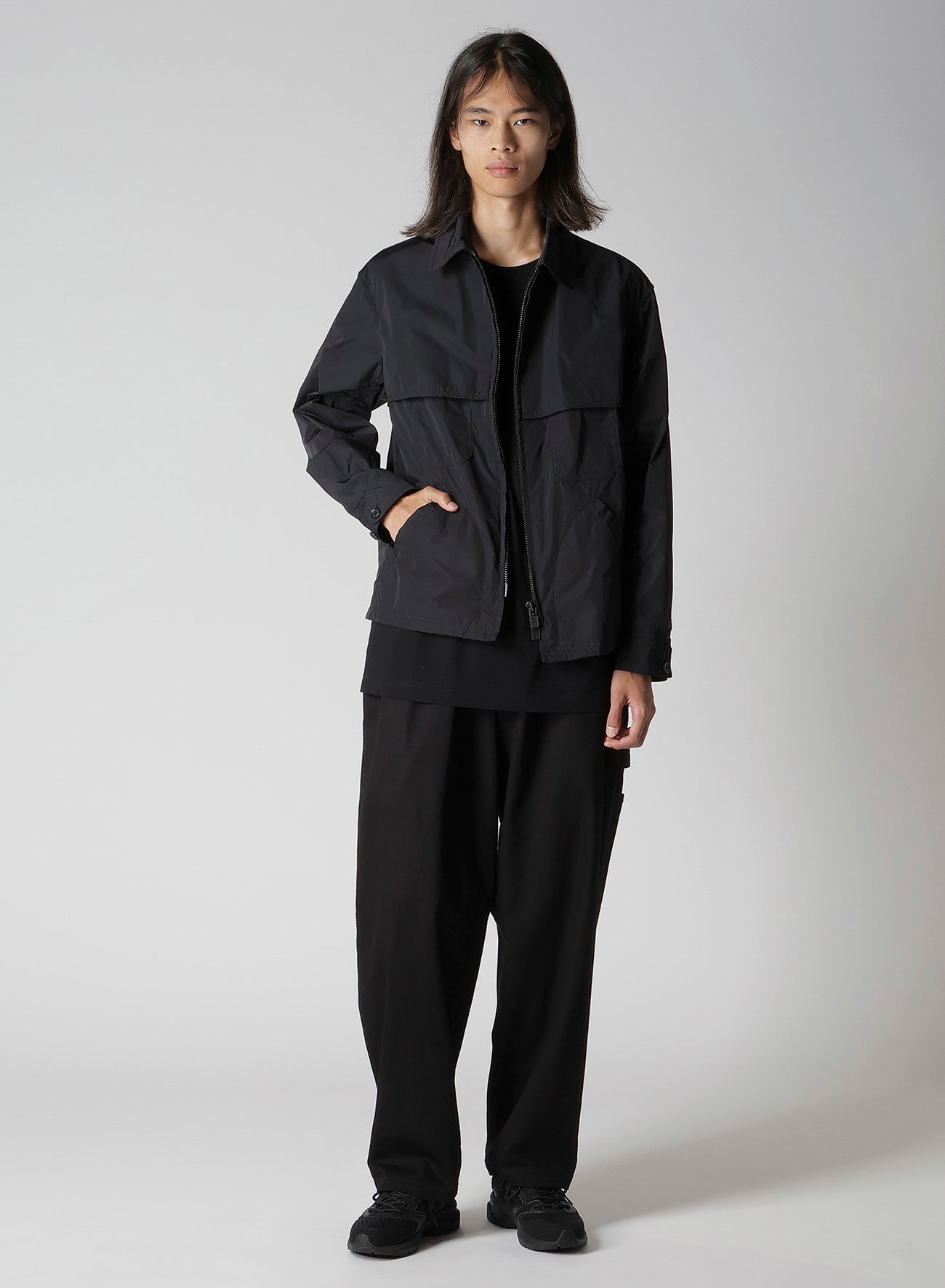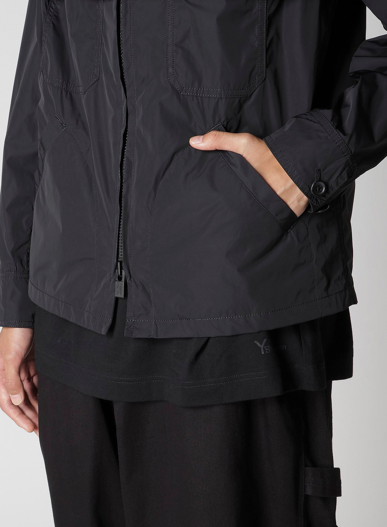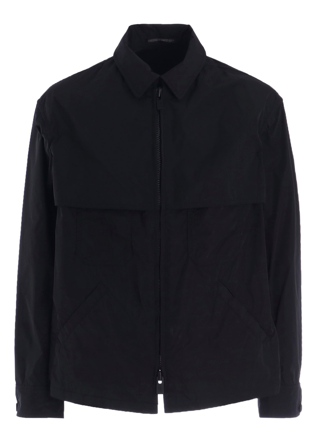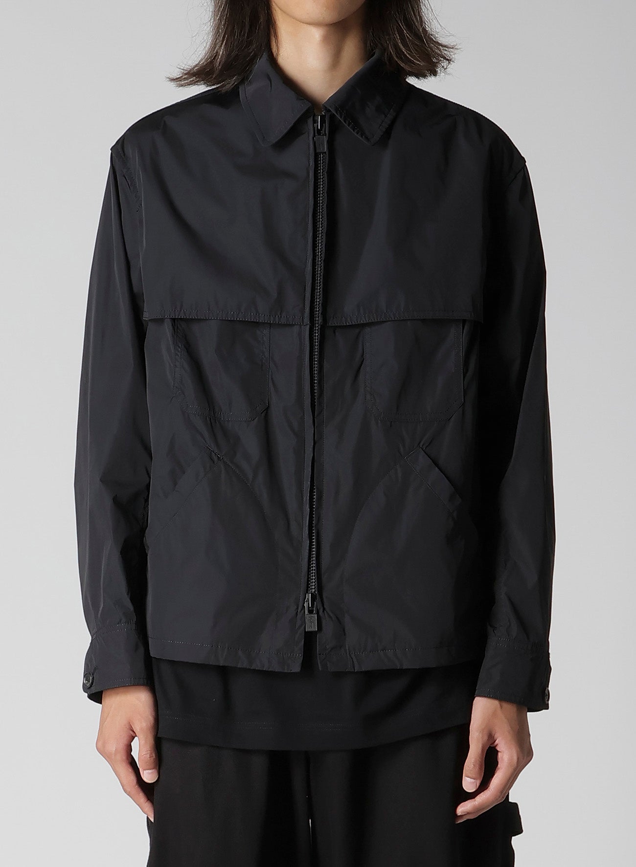 This nylon zip blouson features a rain guard flap that extends from the front to the back, doubling as a chest pocket flap for a cohesive design. Made from lightweight nylon taffeta, it pairs perfectly with matching pants for a coordinated look.