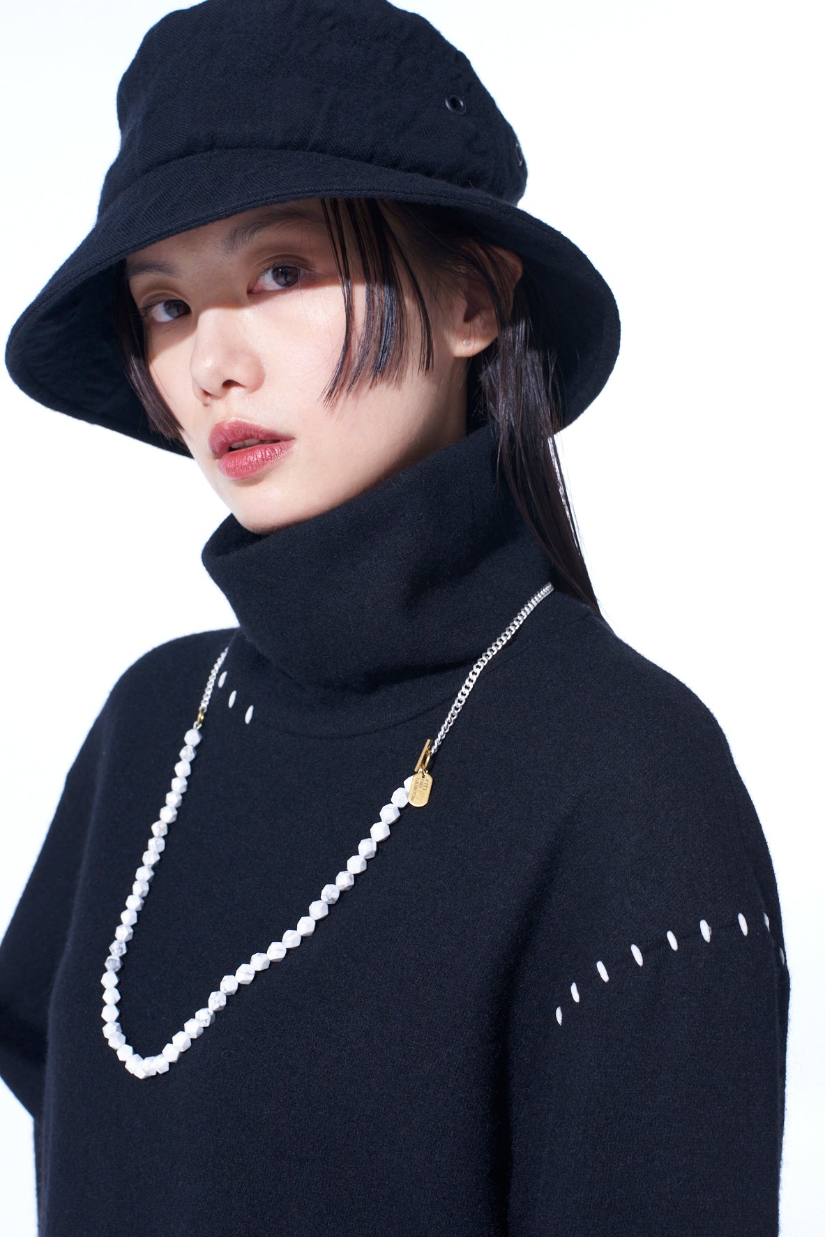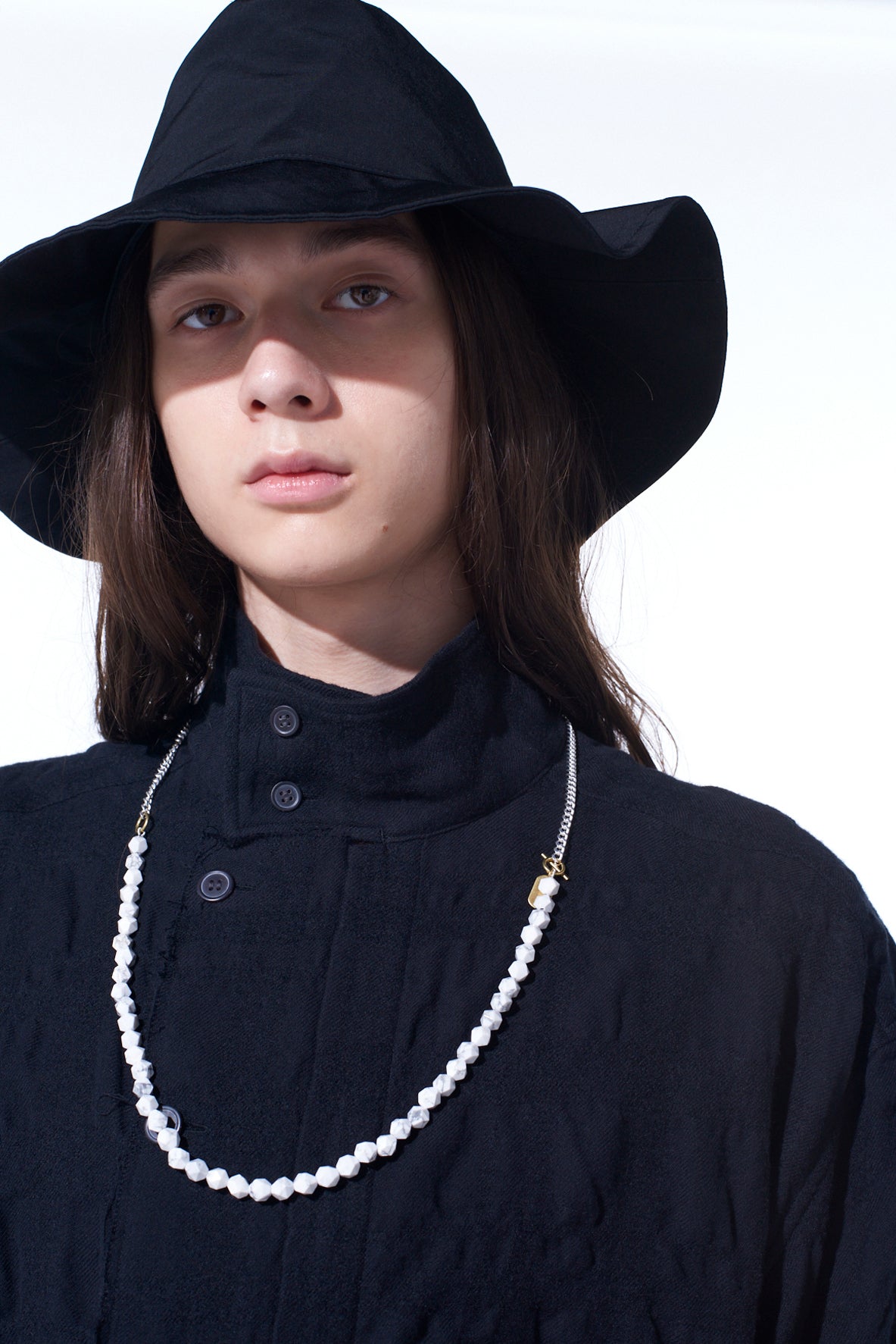 這款項鍊的特色為白色基底和不規則斑點的海纹石,切割成多個切面展現光澤。銀色塗層的鍊子可作為長項鍊或手鍊佩戴。金色部件提供對比,增添變化風格,突顯石頭、吊飾或鍊子的美觀。