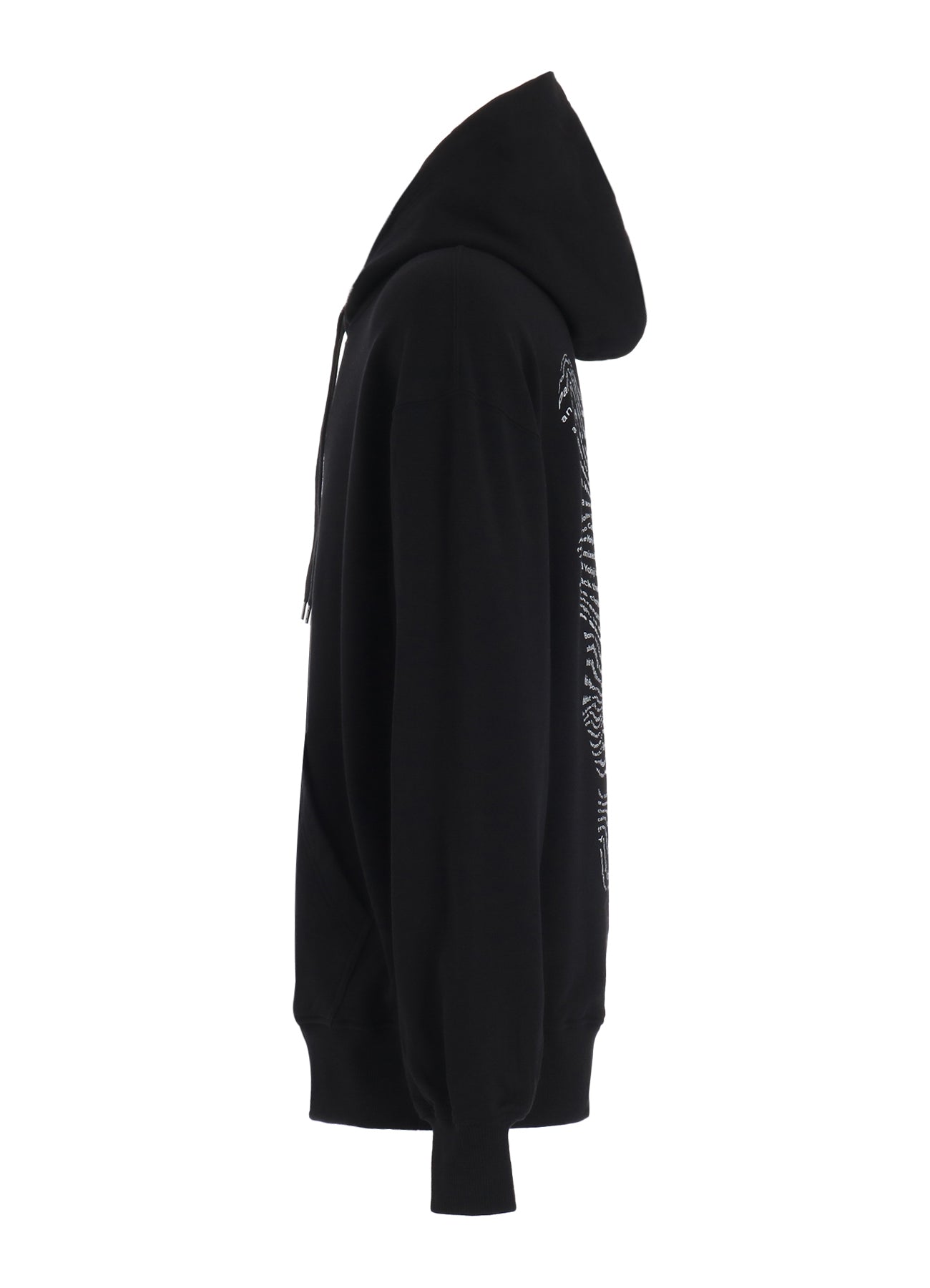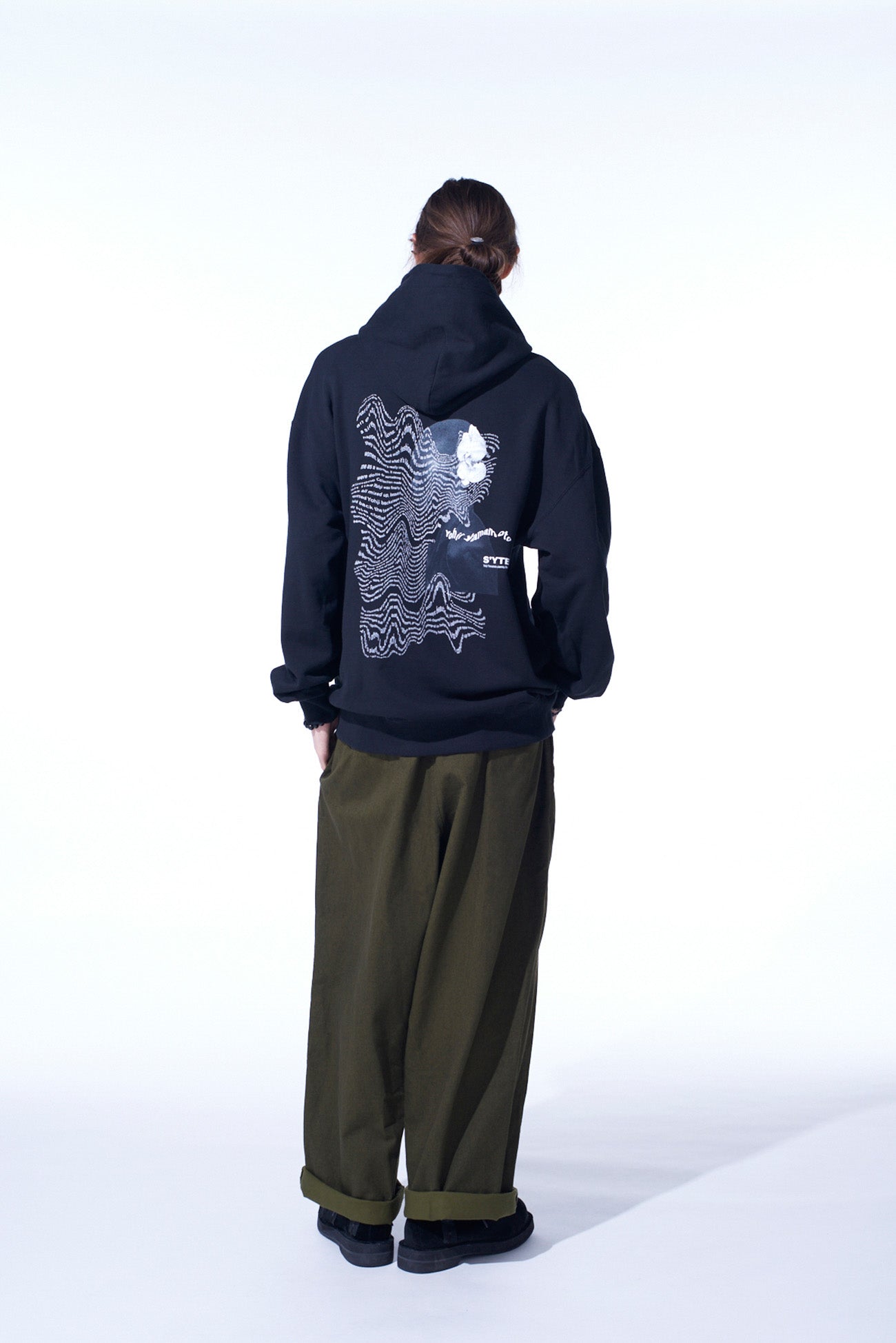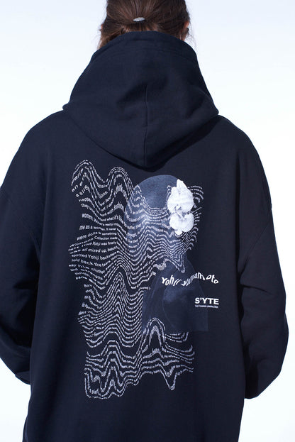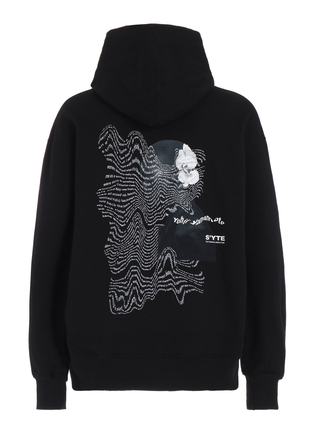 這款圖案連帽衫呈現文字設計和白花照片拼貼,黑色的主體及單色配色兼具個性與易穿性。其設置袖子、落肩設計及寬鬆袖子展現獨特的輪廓選擇,並強調平衡的衣長。