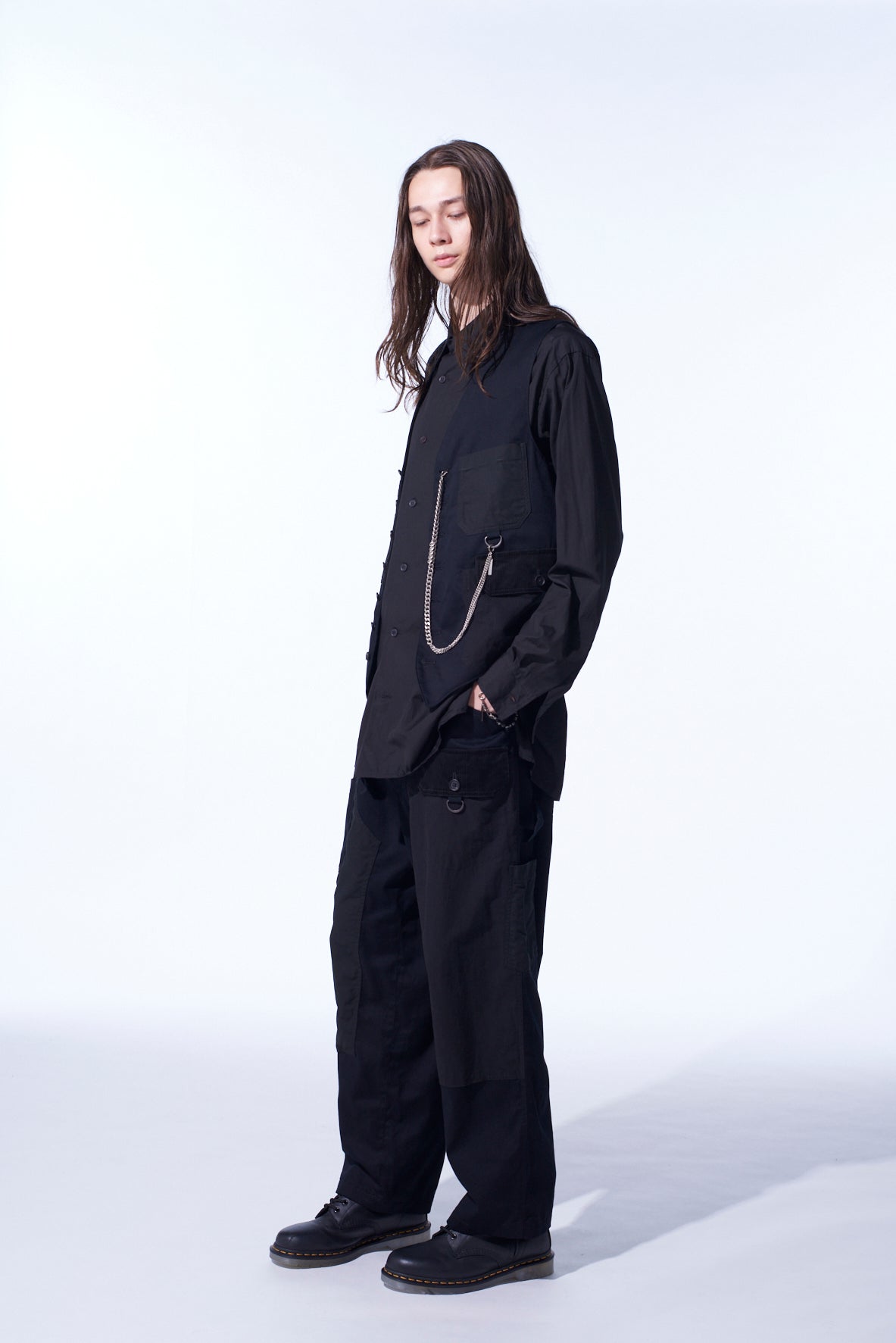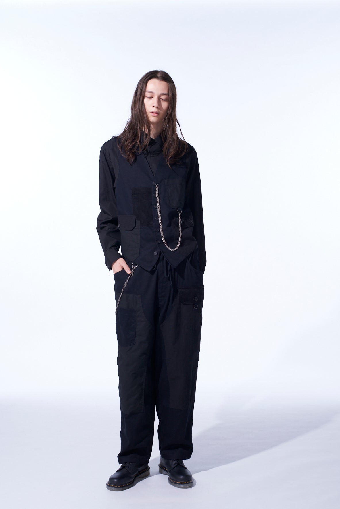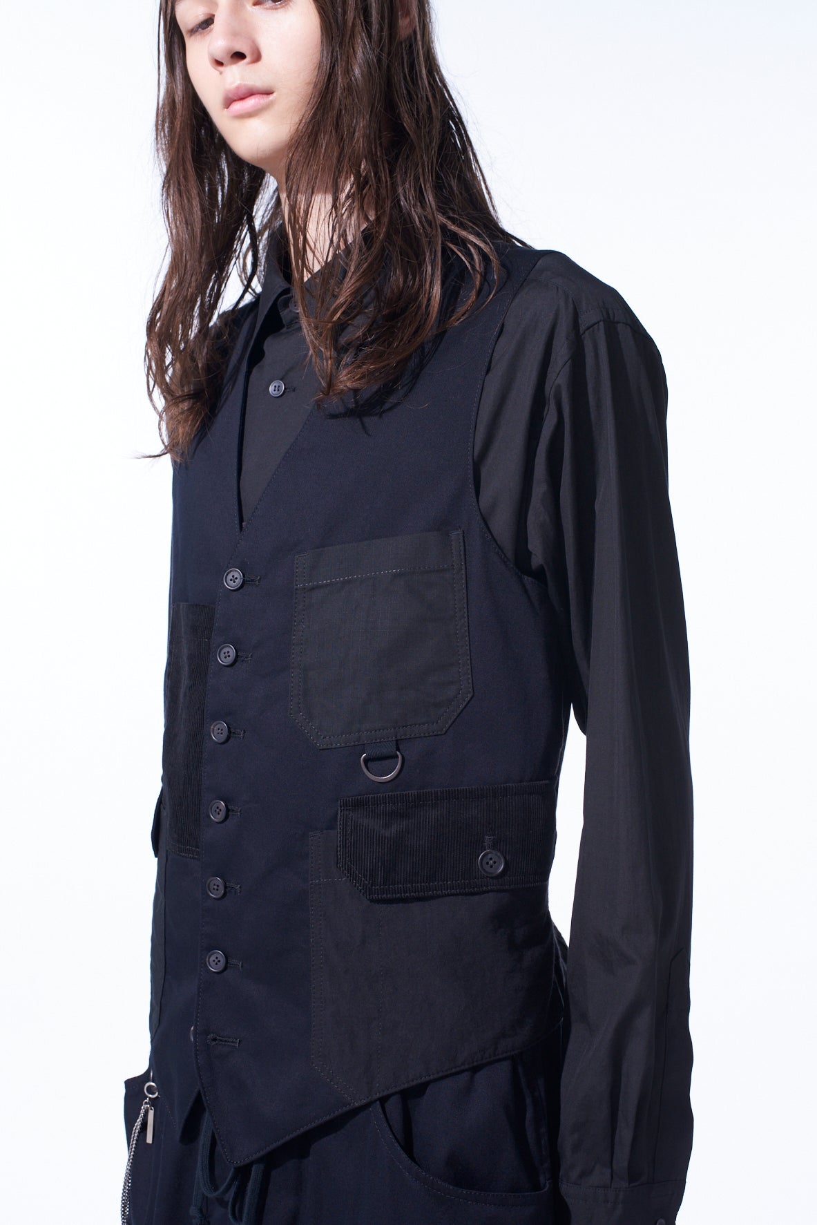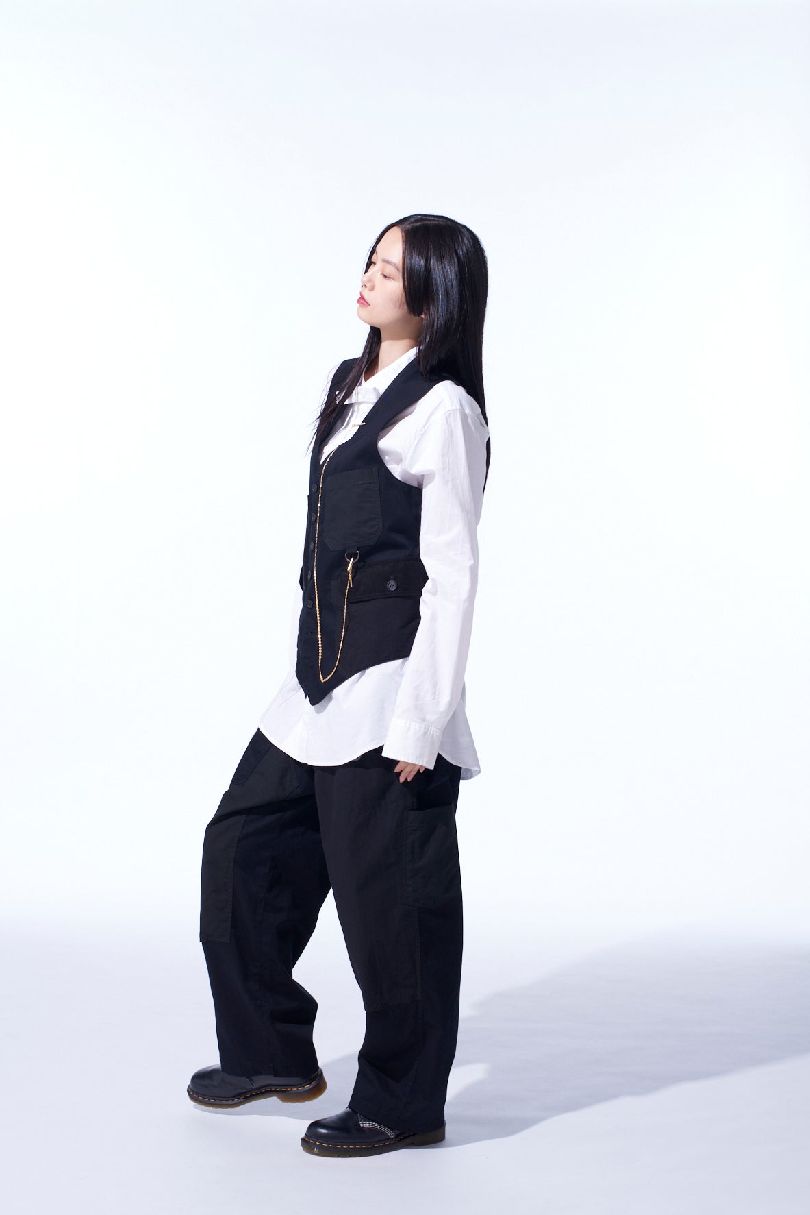這款拼布背心以棉斜紋和多種面料製成,具有獨特的工裝風格口袋,如工具袋和大翻蓋口袋。雖然是全黑設計,但依靠防撕裂布、weathercloth和燈芯絨混合,增加了獨特的質感和色彩變化。可與同系列搭配或作為內層使用。