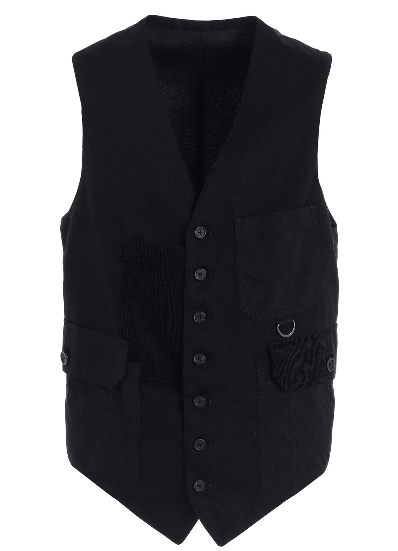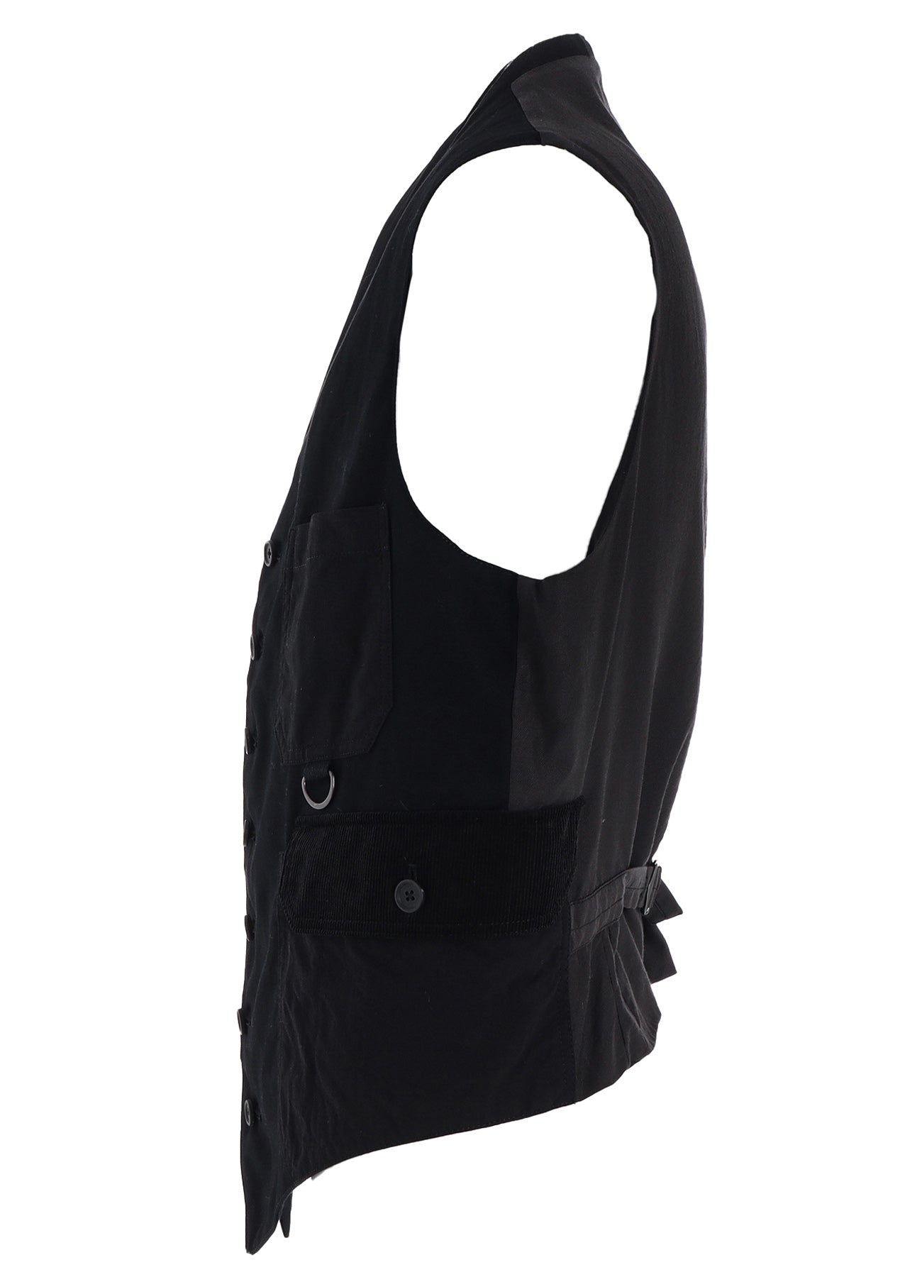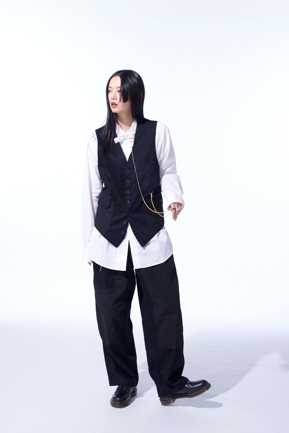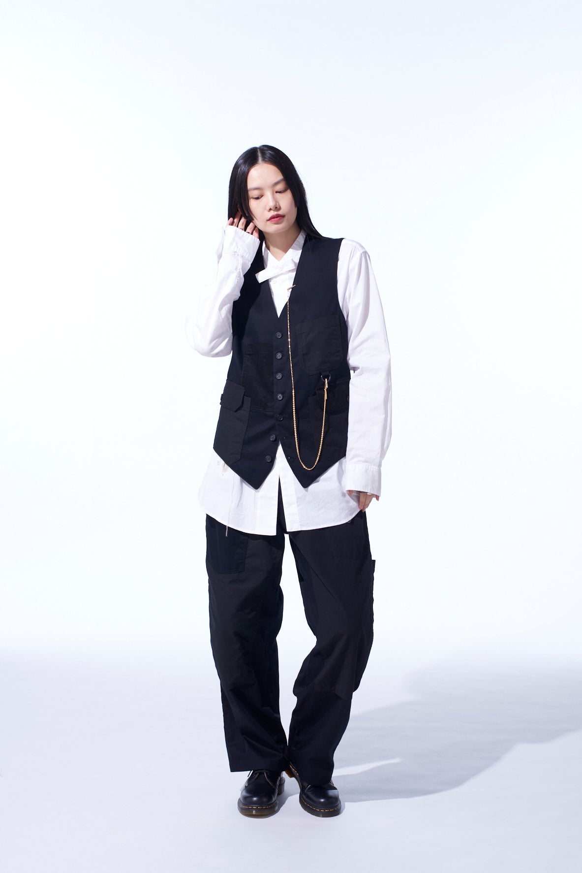 這款拼布背心以棉斜紋和多種面料製成,具有獨特的工裝風格口袋,如工具袋和大翻蓋口袋。雖然是全黑設計,但依靠防撕裂布、weathercloth和燈芯絨混合,增加了獨特的質感和色彩變化。可與同系列搭配或作為內層使用。