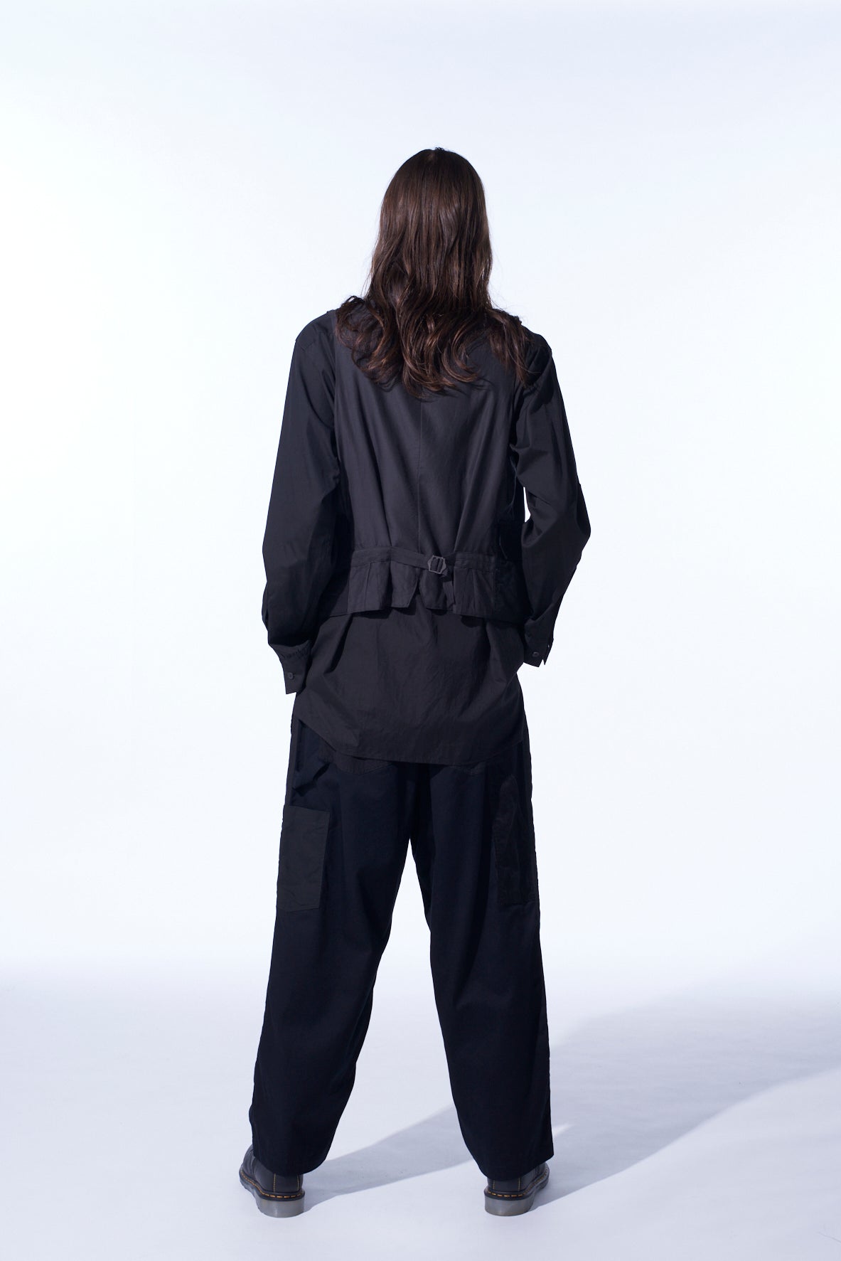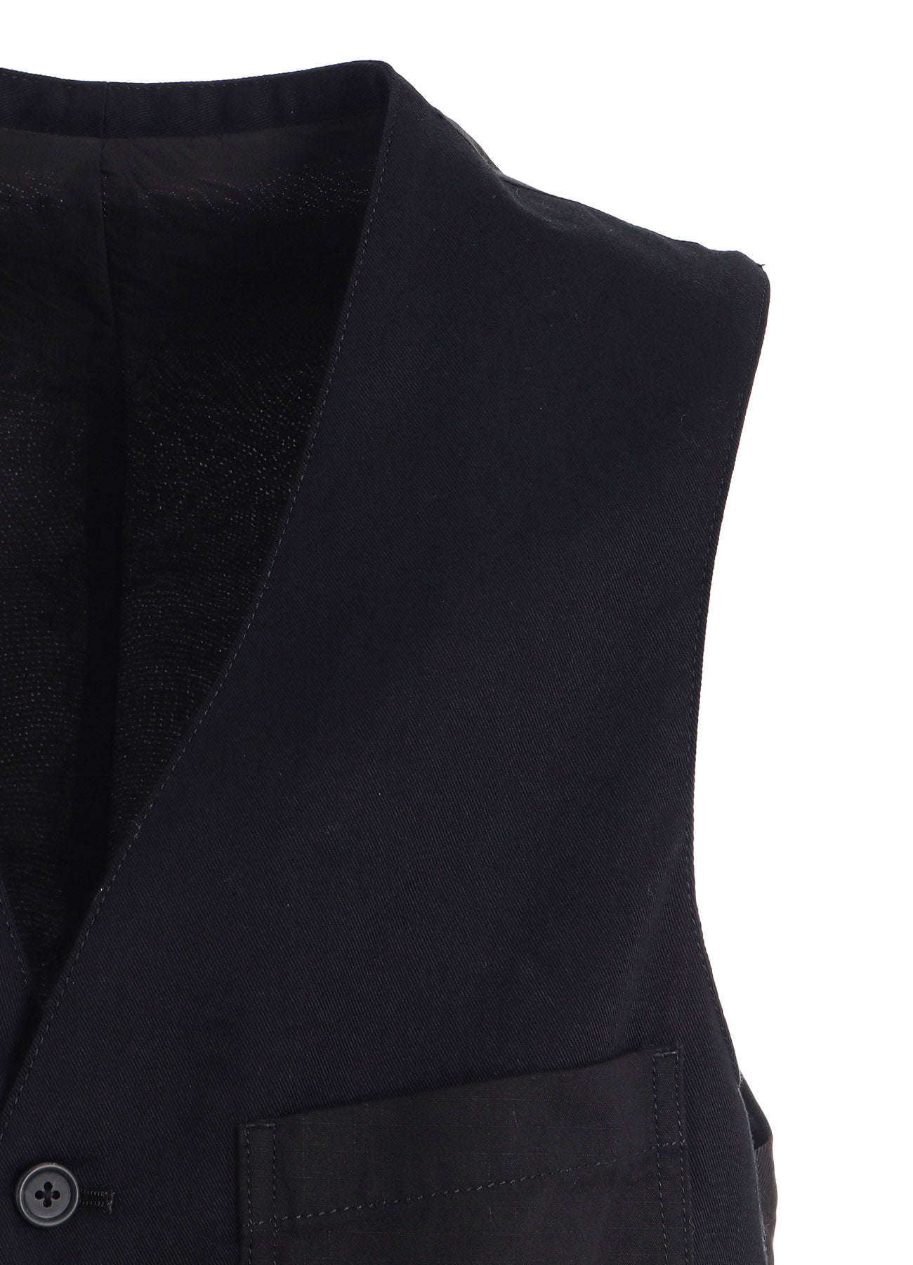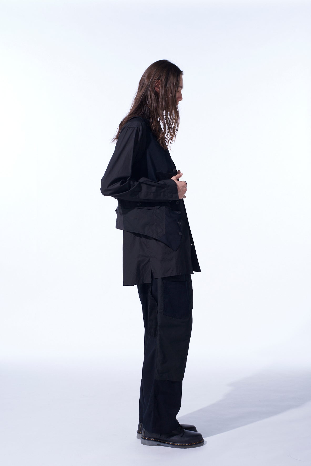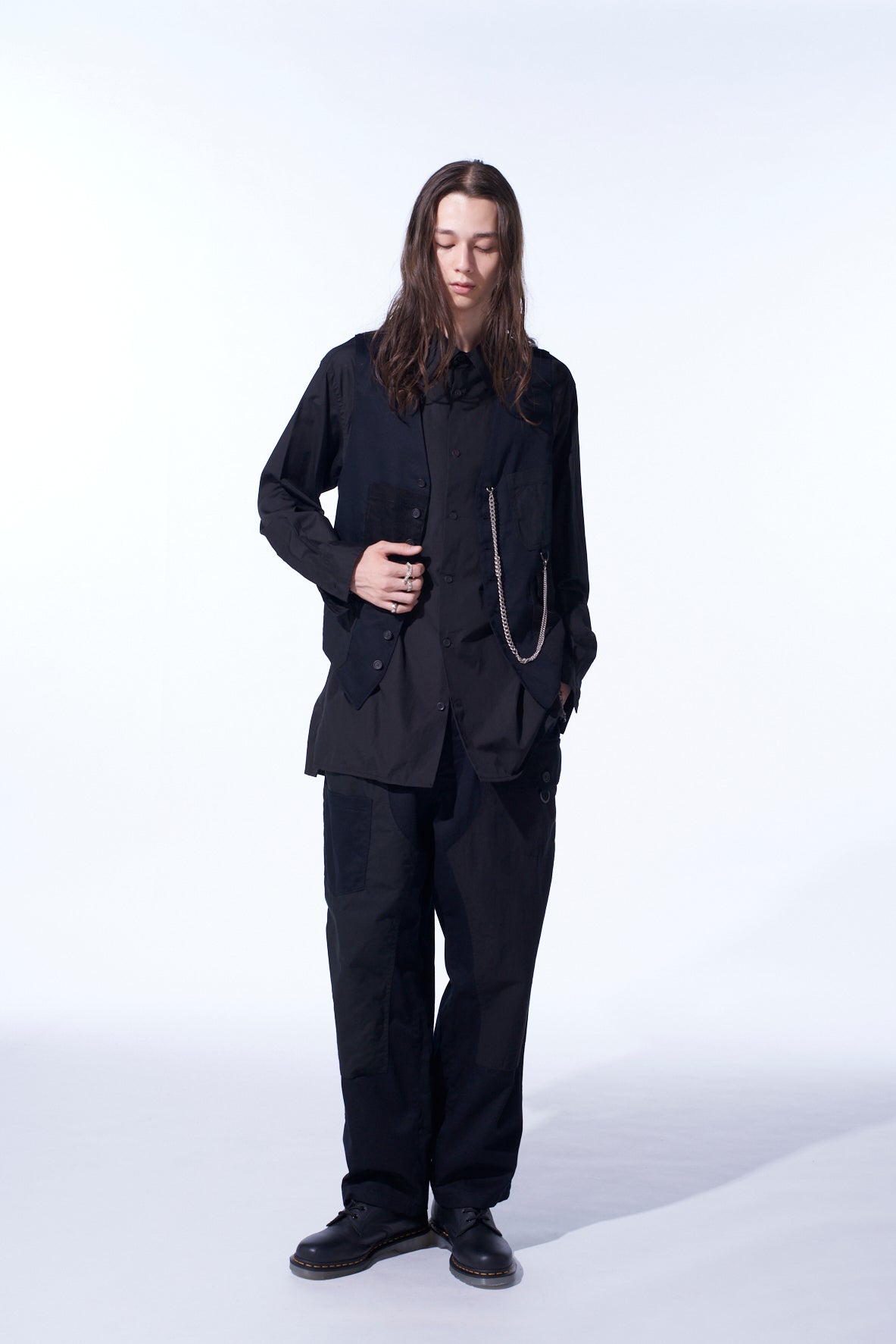 這款拼布背心以棉斜紋和多種面料製成,具有獨特的工裝風格口袋,如工具袋和大翻蓋口袋。雖然是全黑設計,但依靠防撕裂布、weathercloth和燈芯絨混合,增加了獨特的質感和色彩變化。可與同系列搭配或作為內層使用。