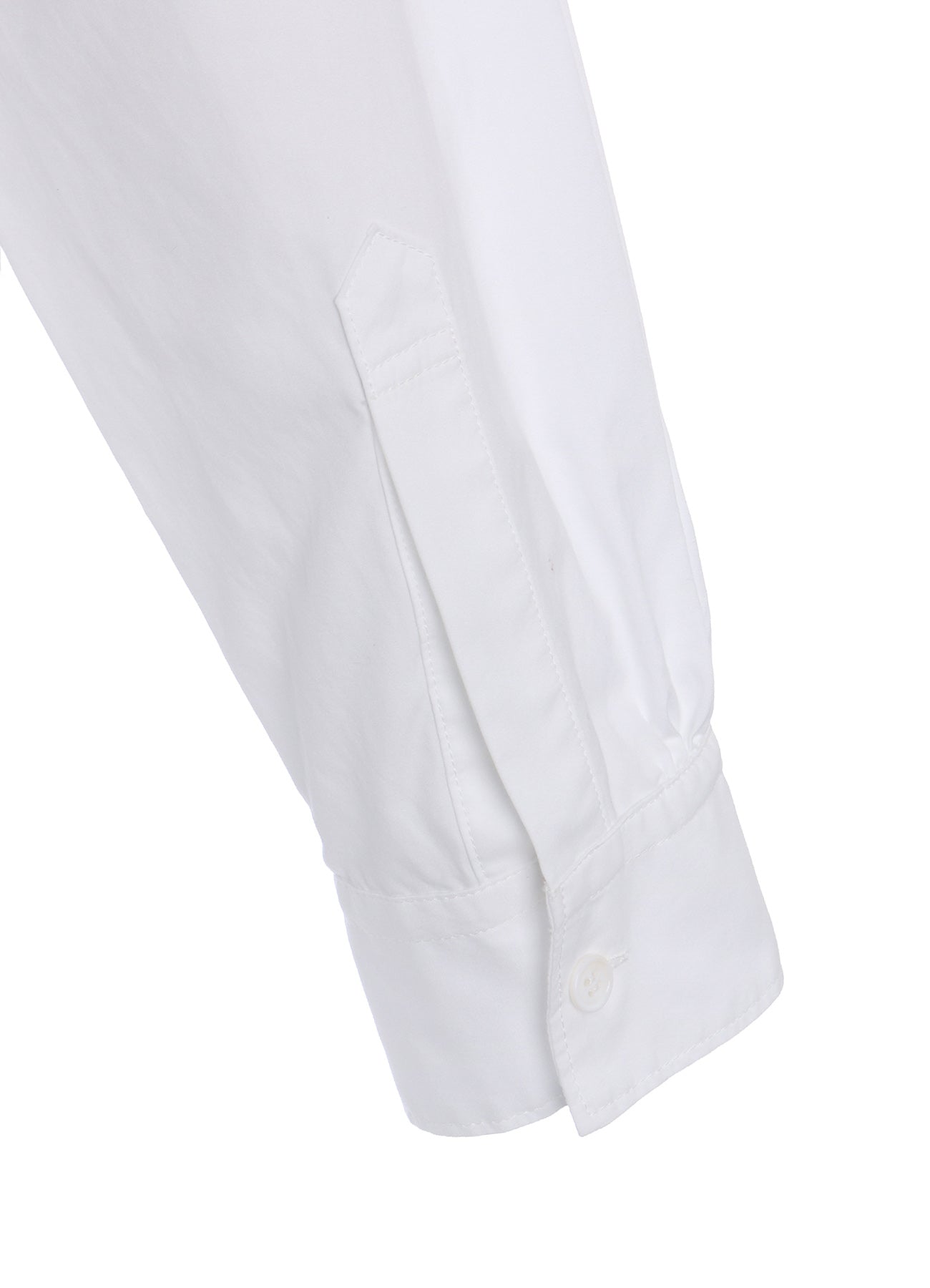 這款立領襯衫擁有獨特的按鈕設計,使其中一個領尖轉變為絲帶造型。襯衫的優雅皺褶細節、雙翻袖、圓形前下擺與直線後下擺相結合,展現出多變且時尚的設計,佩戴項鍊可增添其魅力。