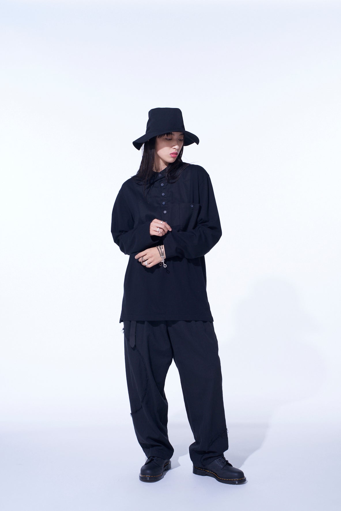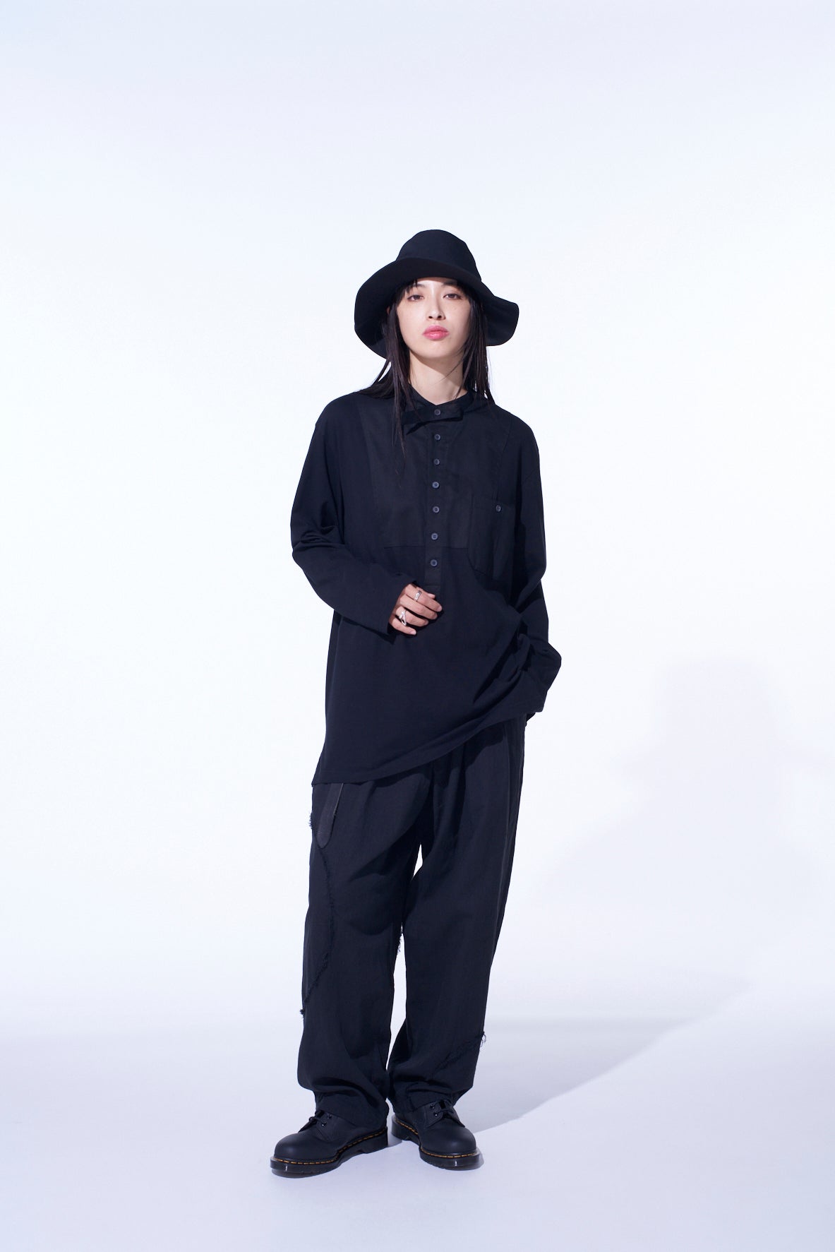 這款上衣以襯衫領搭配獨特的可調整Transforming設計元素,如加長的側邊可變化為蝴蝶結等多種風格。領口、前襟和口袋採用Twill材質,呈現出類似襯衫的外觀,適合與背心及外套搭配。
