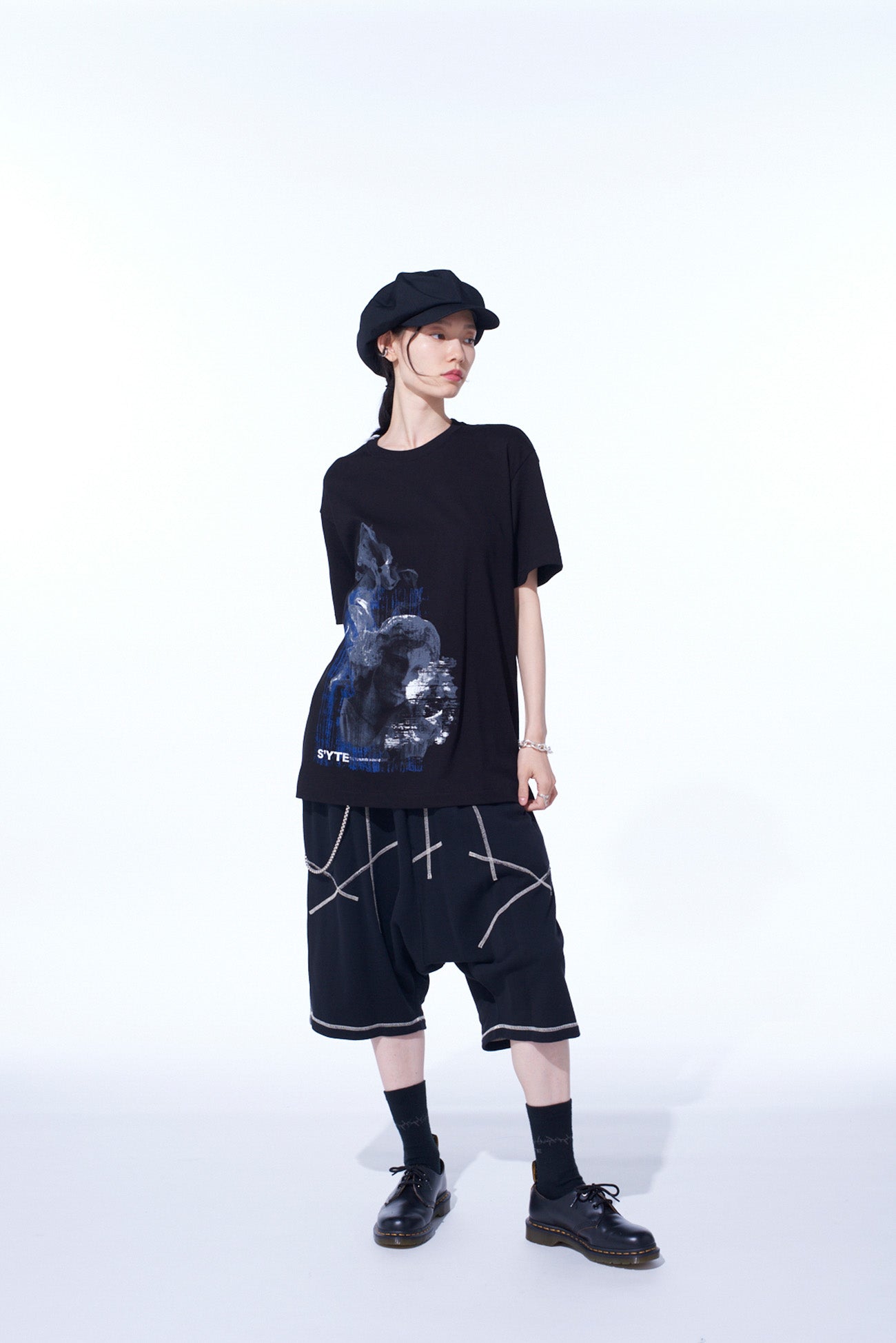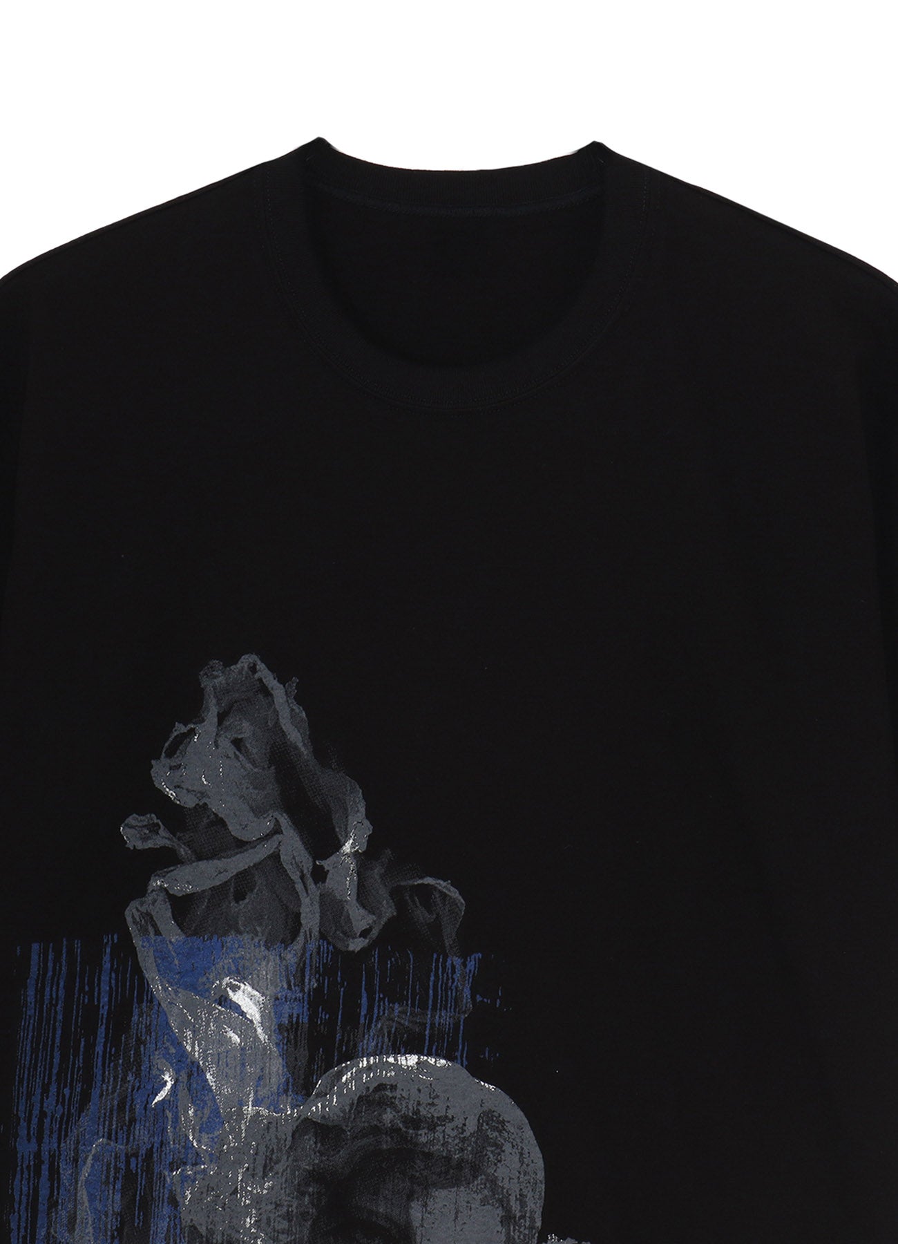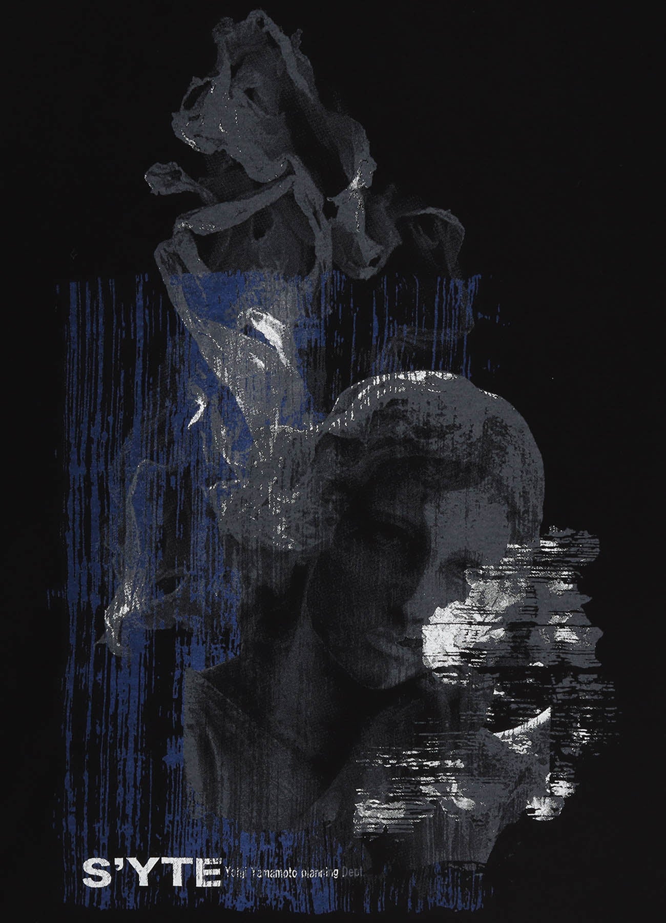 這款圖案上衣由與Kume Sen-i合作生產,灰色雕塑主題搭配藍色點綴,無縫管狀編織提供舒適感,針對不同身材提供多樣造型選擇,布料柔軟耐用,由日本製造。