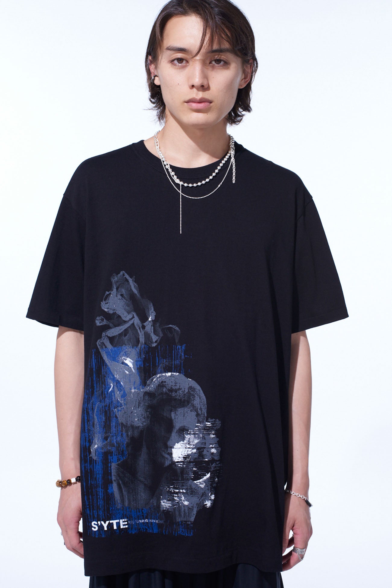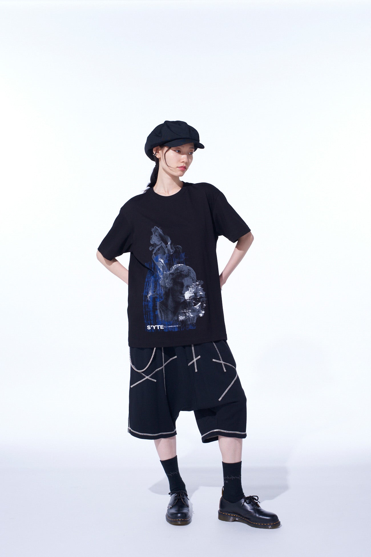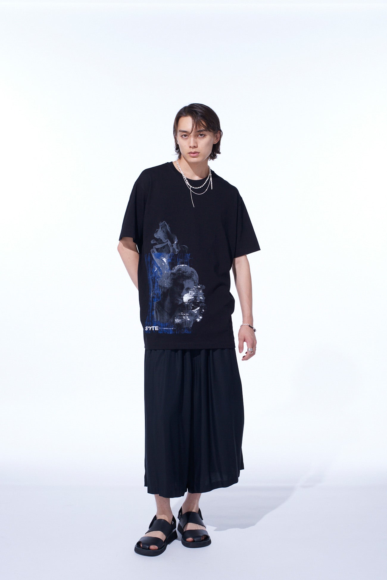這款圖案上衣由與Kume Sen-i合作生產,灰色雕塑主題搭配藍色點綴,無縫管狀編織提供舒適感,針對不同身材提供多樣造型選擇,布料柔軟耐用,由日本製造。