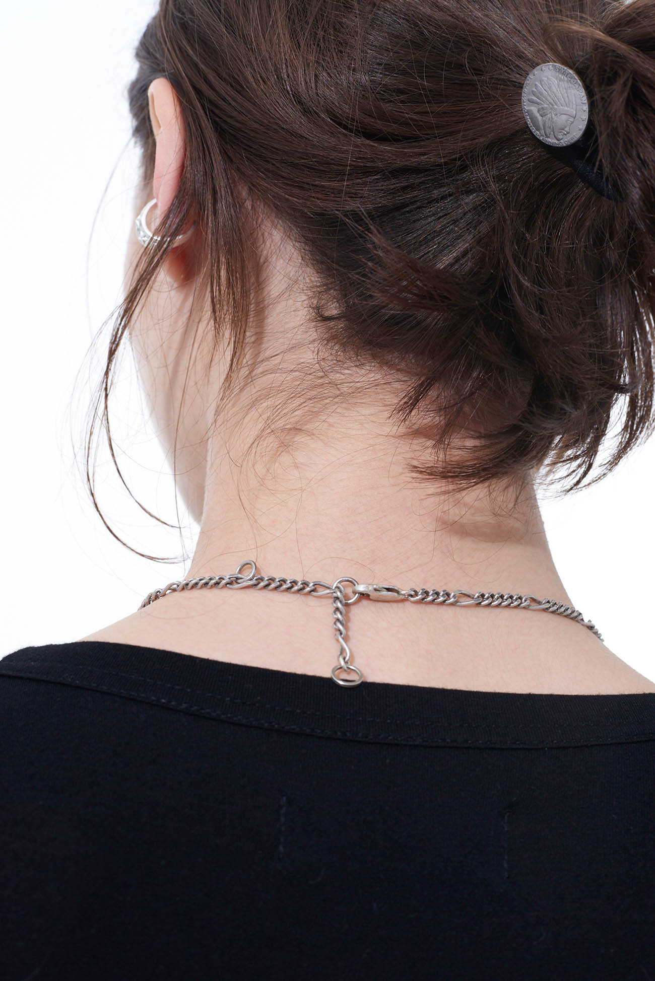 質感為啞光的喜平鏈條可調整長度,因此可以根據頸部的開口或襯衫的設計來調整項圈的頂部位置。