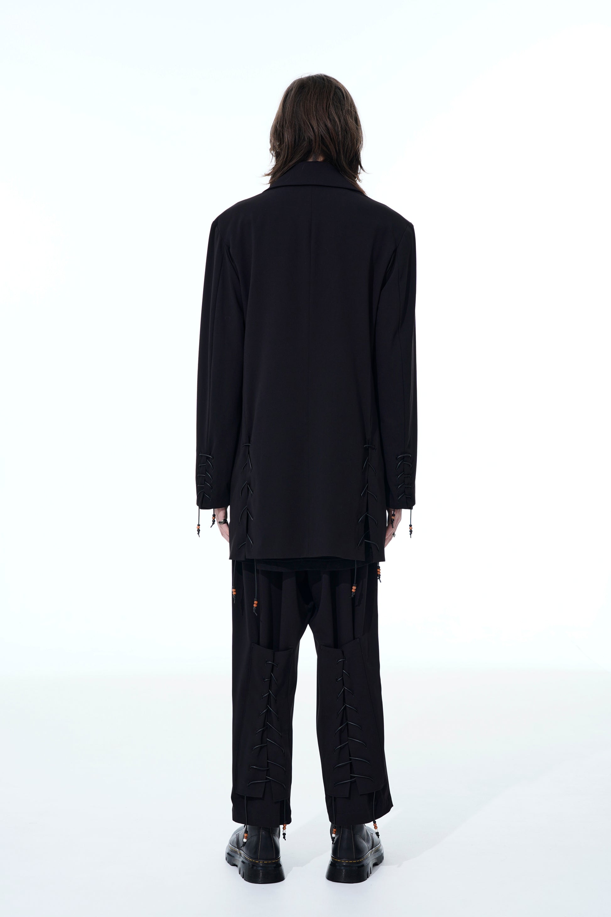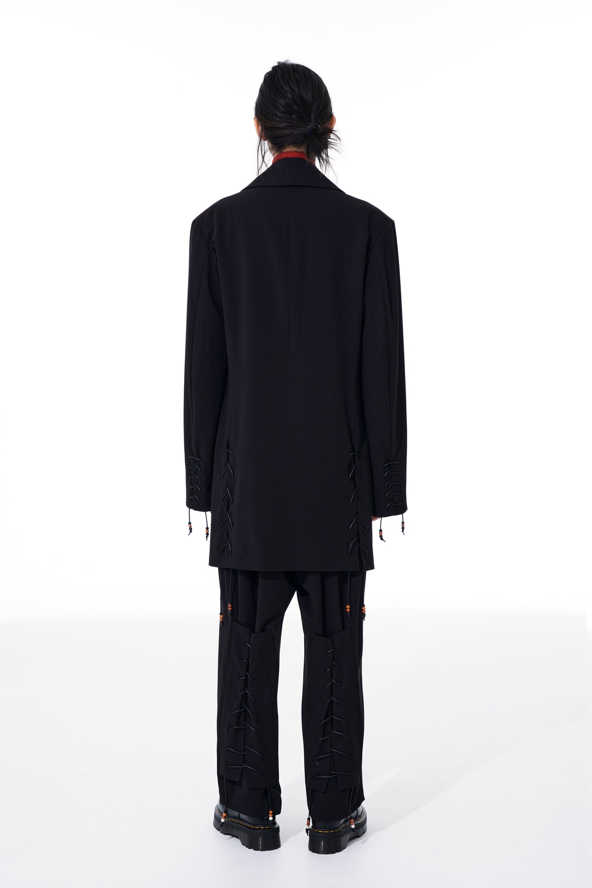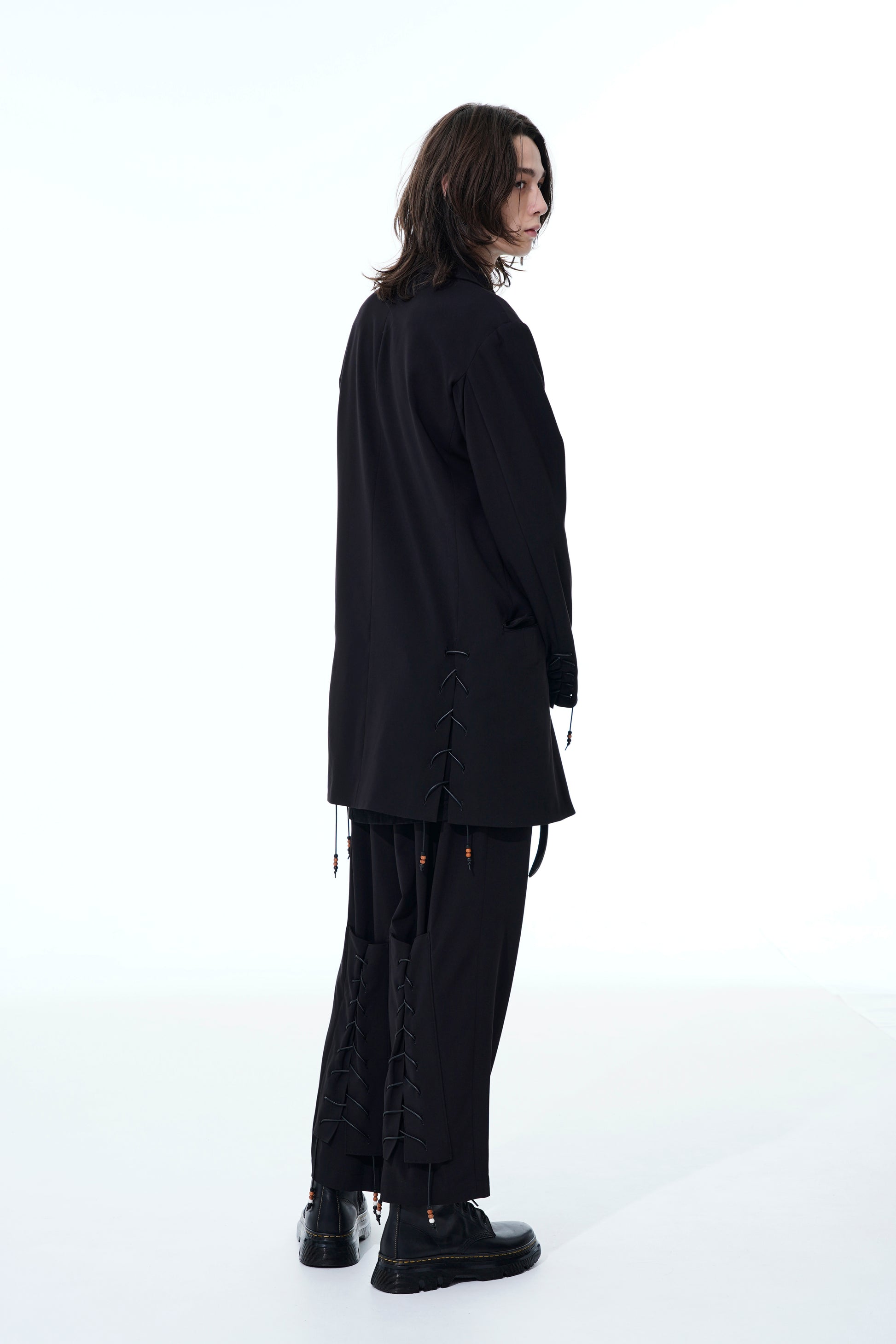 22-23A/W系列中的特色賽跑釘珠設計褲子採用寬松的版型,腰部和大腿處有三個褶皺,從膝蓋開始逐漸收窄。小腿部位的綁帶細節充滿騎士風格,並綴有棕色和白色珠子,為黑色布料增添優雅氣質。