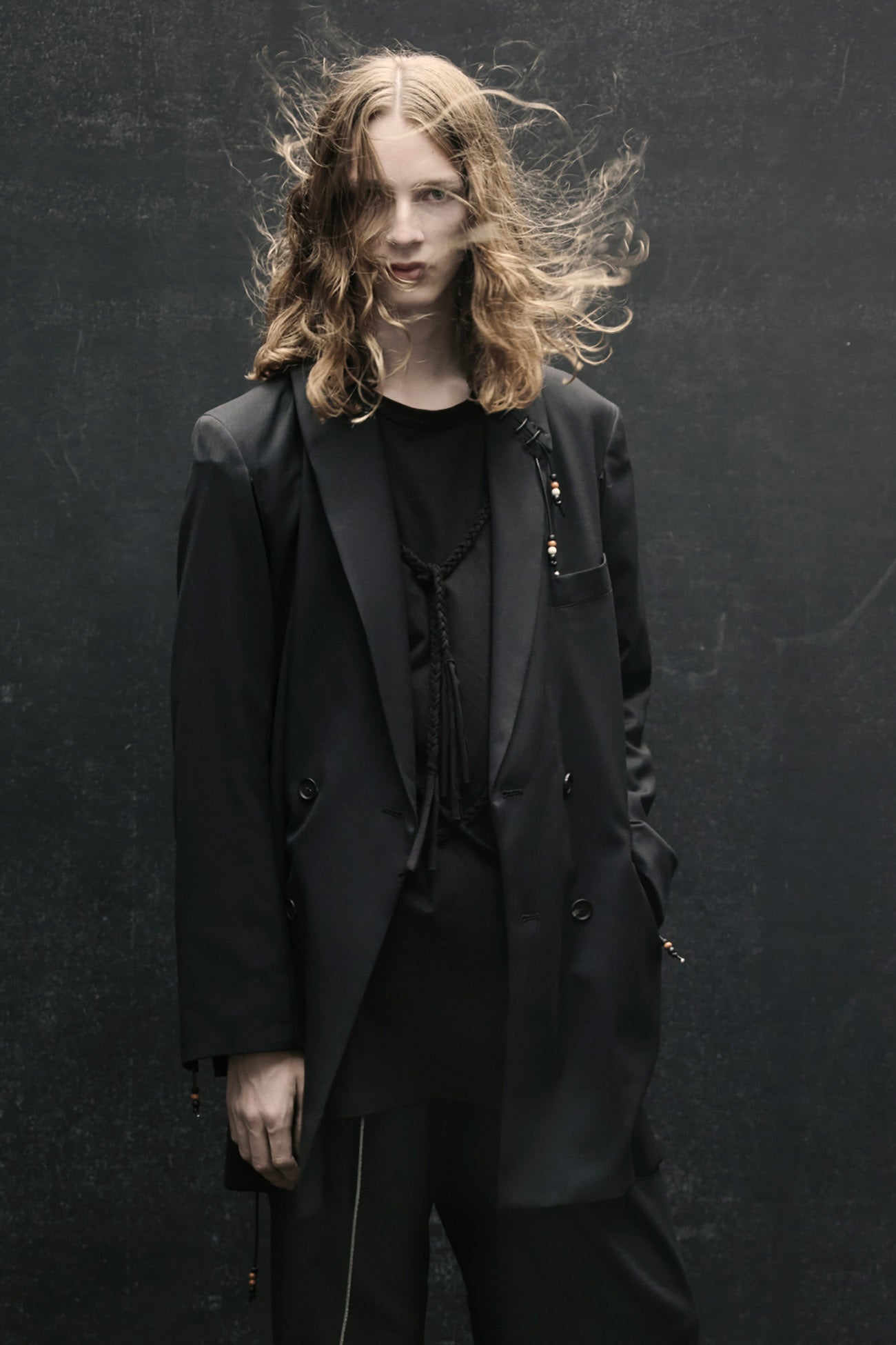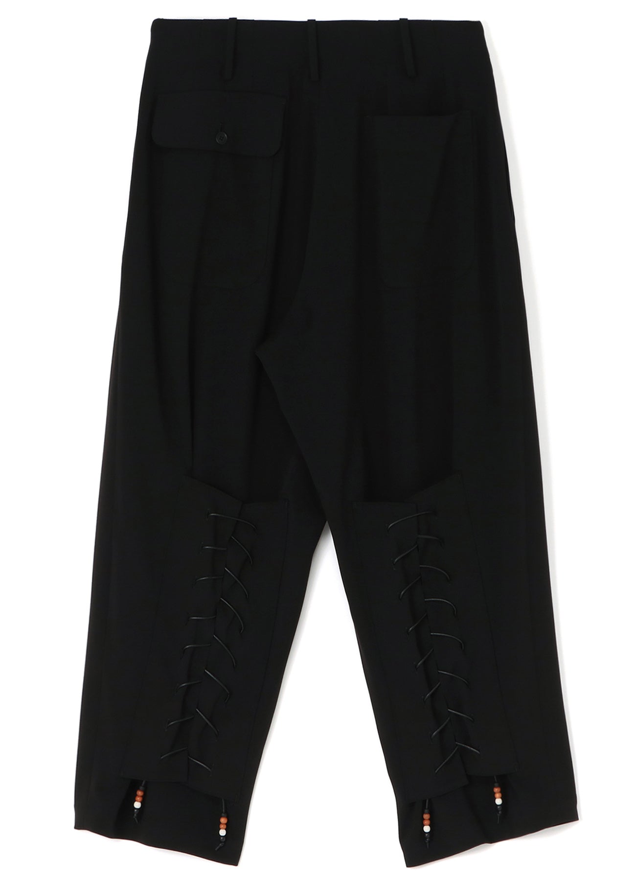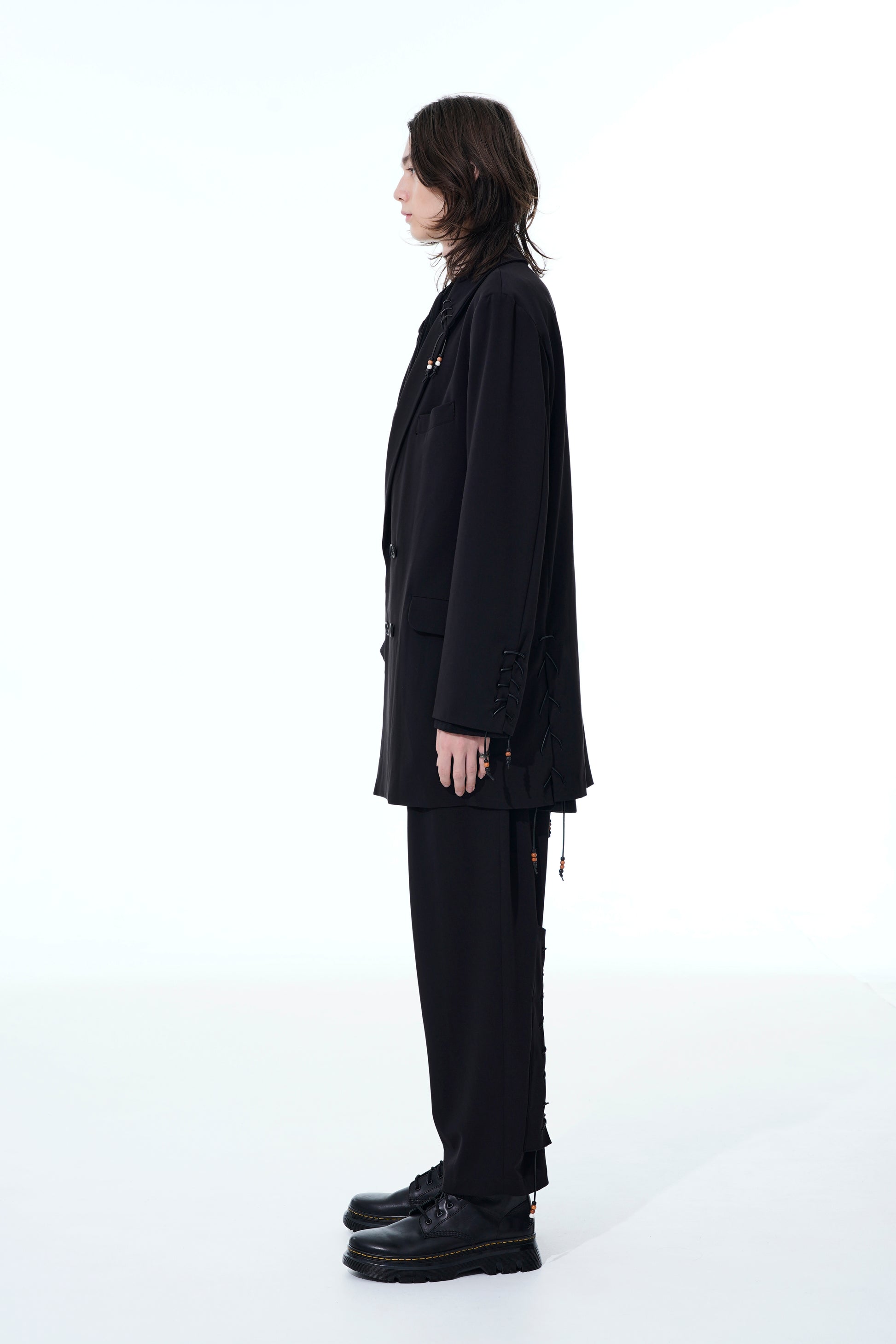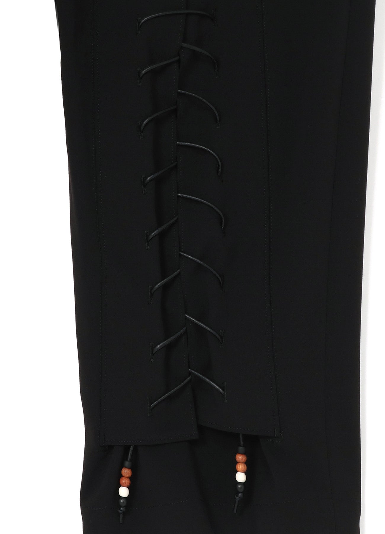 22-23A/W系列中的特色賽跑釘珠設計褲子採用寬松的版型,腰部和大腿處有三個褶皺,從膝蓋開始逐漸收窄。小腿部位的綁帶細節充滿騎士風格,並綴有棕色和白色珠子,為黑色布料增添優雅氣質。
