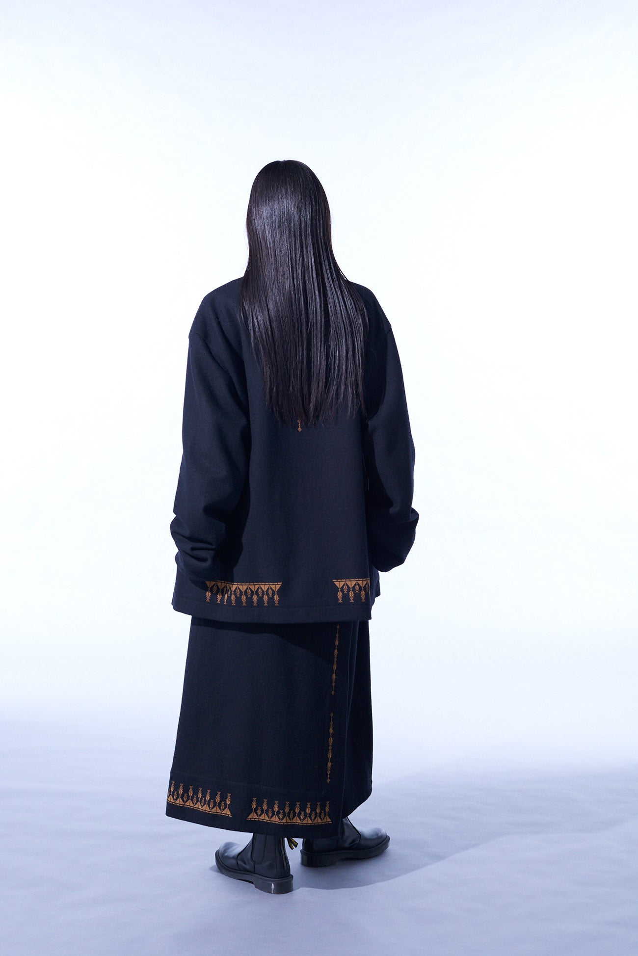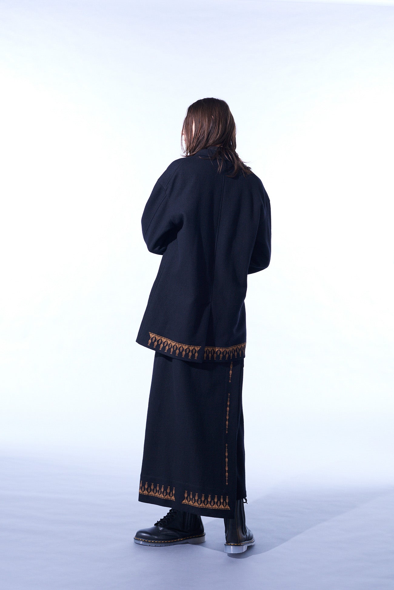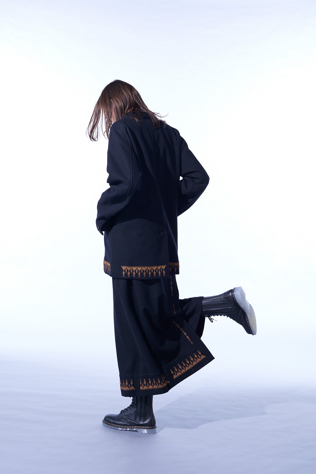 這些裹身式裙褲的左下擺和裹身邊緣飾有幾何刺繡,增添了民族風情。複雜的顏色選擇包括海軍藍配紅色和黑色配金色。彈性腰帶提高了貼合度,D 形環窄腰帶增強了設計感和舒適度。裹身布料可調整為無性別裙子般的外觀,非常適合冬季。