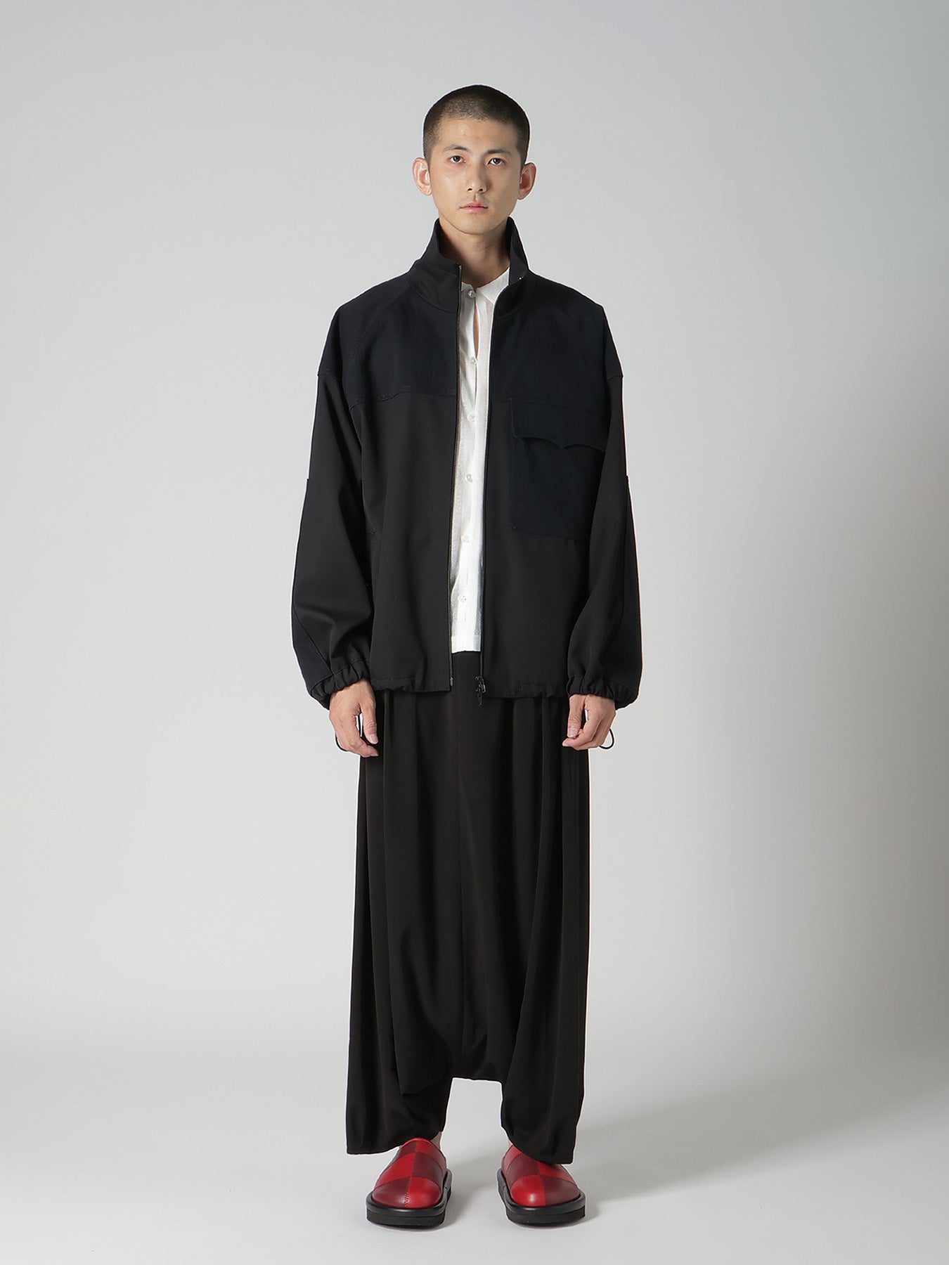 This stand collar blouson is crafted from thick wool gabardine, elegantly merging sporty form with sophisticated fabric for a refined look. Designed for all genders, it is suitable for anyone to wear.