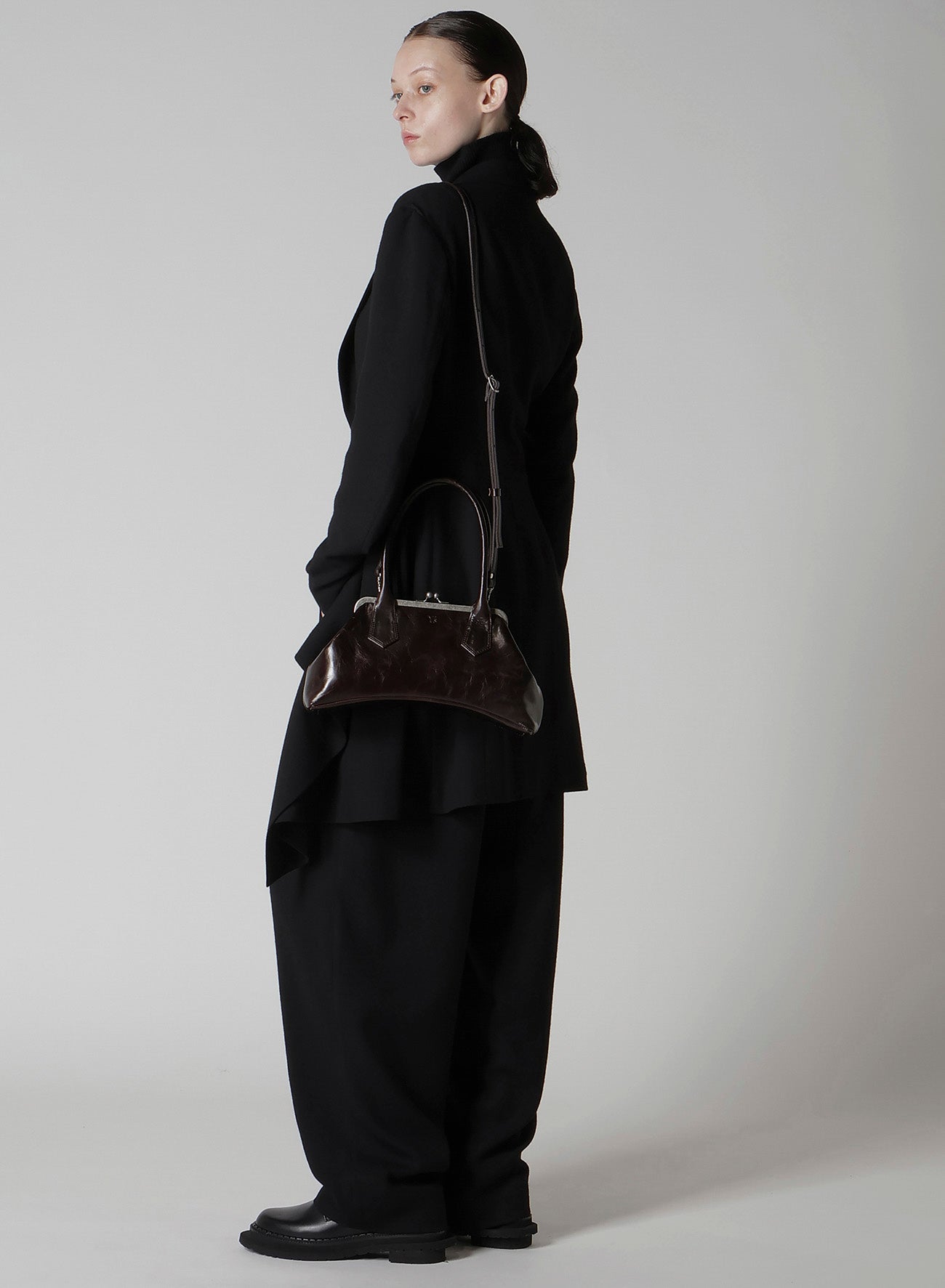 這款扣環皮革包具獨特的拱形底部設計,採用經過油處理的皺褶皮革製成。深色的扣環賦予它粗獷的外觀。配備可拆卸肩帶,無論是日常使用還是正式場合,都能成為多樣化的配件。