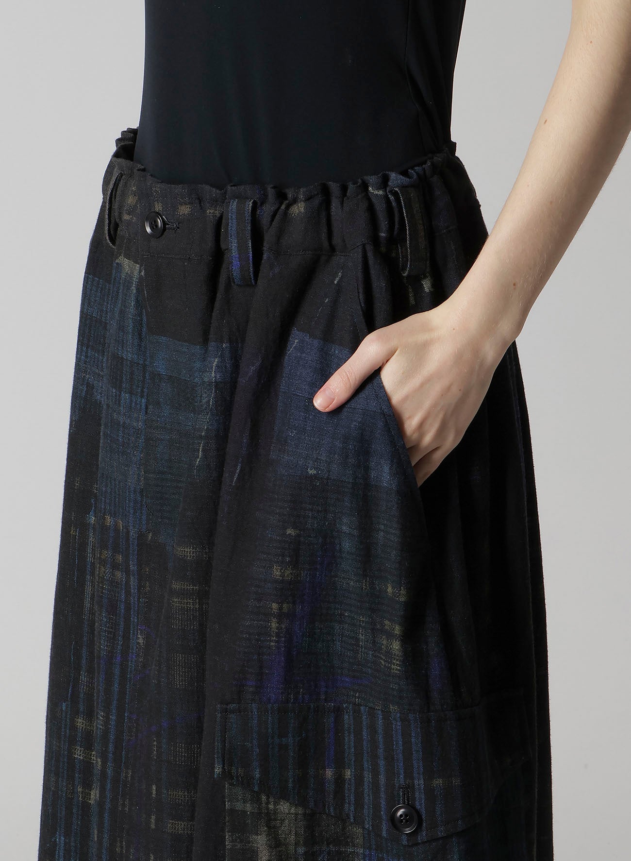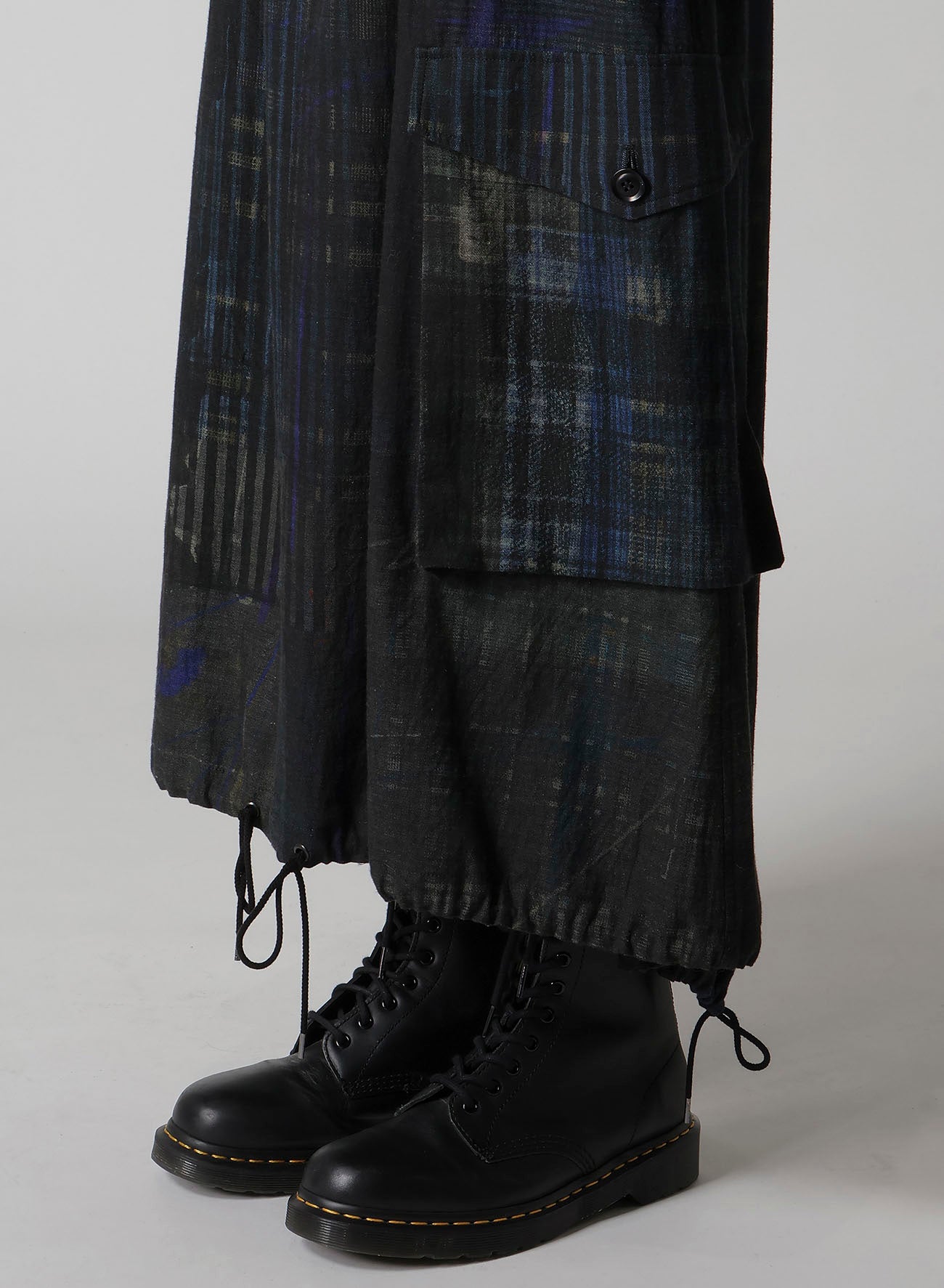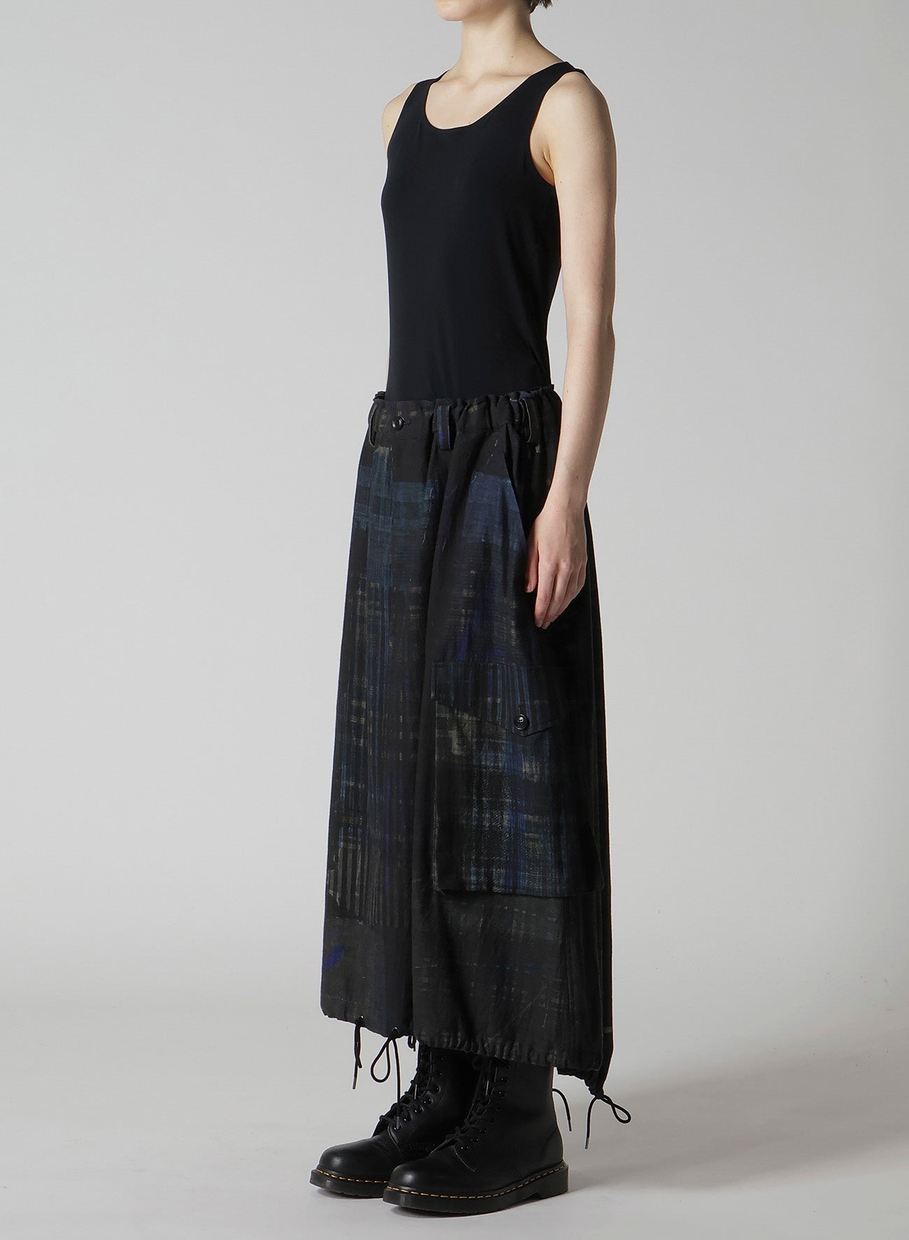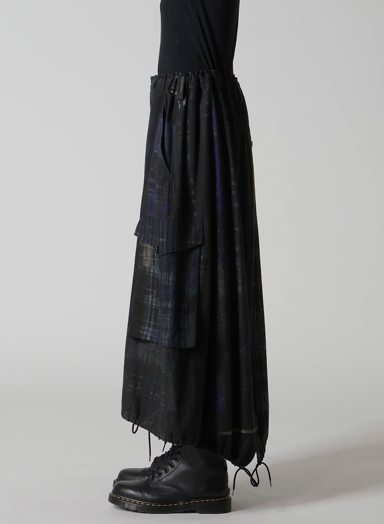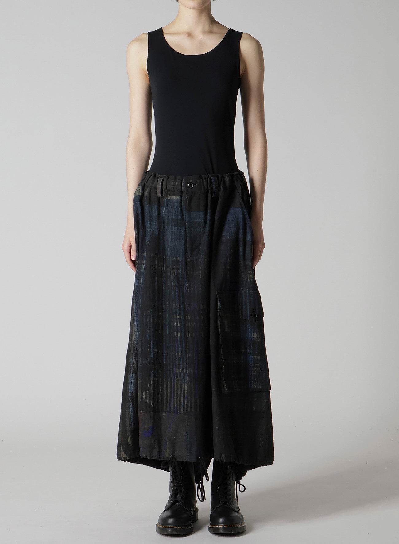 這款魚尾裙展示了各種格紋圖案,印在輕盈的牛仔布的背面。其獨特設計具備魚尾和大外口袋。腰部搭配彈性腰帶和抽繩,尺寸可調,讓其成為任何衣櫃的彈性選擇。