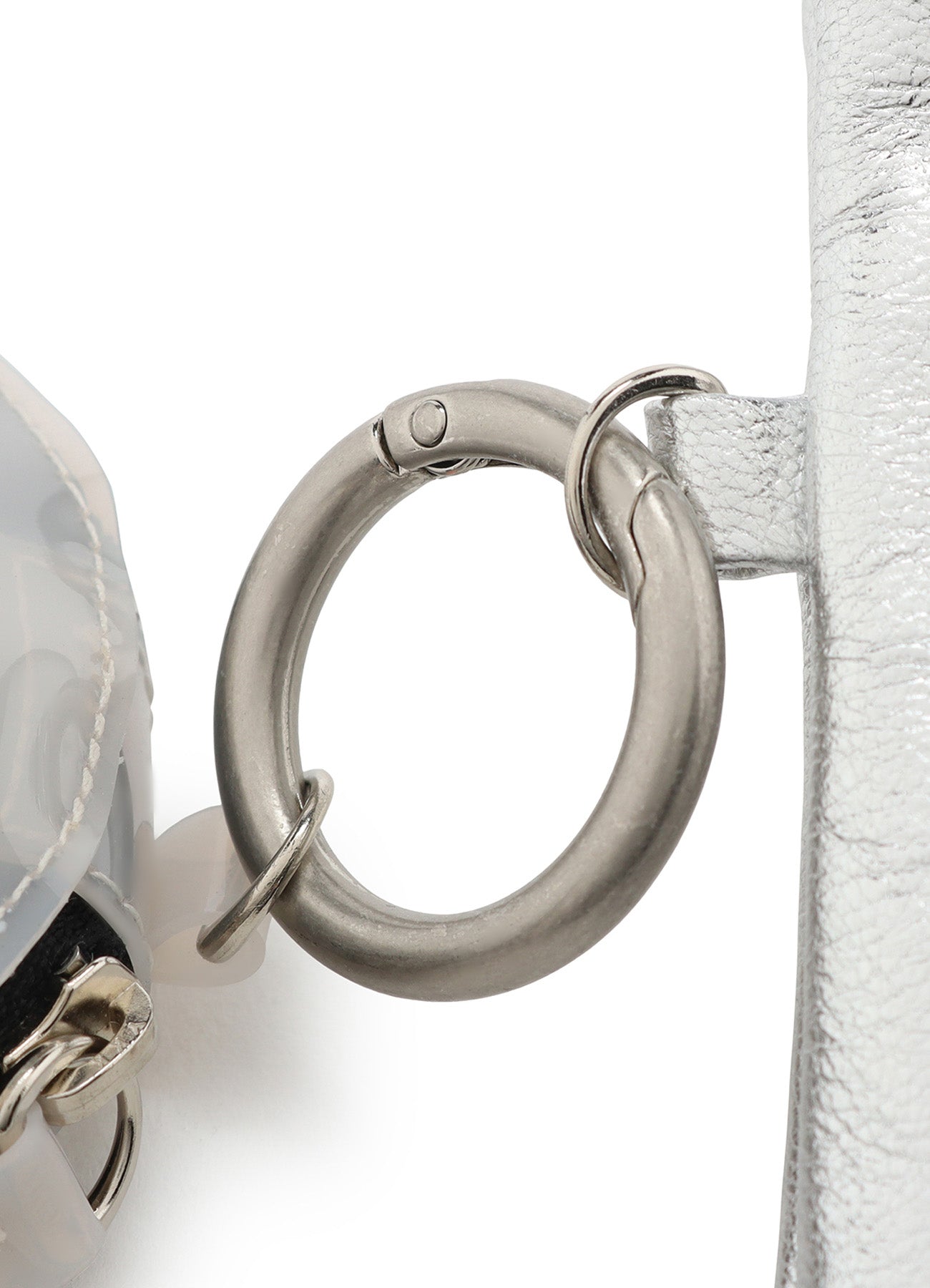 這款商品是一個獨特設計的雙口袋包,由PVC與皮革製成,具備攜帶方便性和時尚感。內附有攀繩,可以輕鬆附掛於包包上,適合收納小物件。