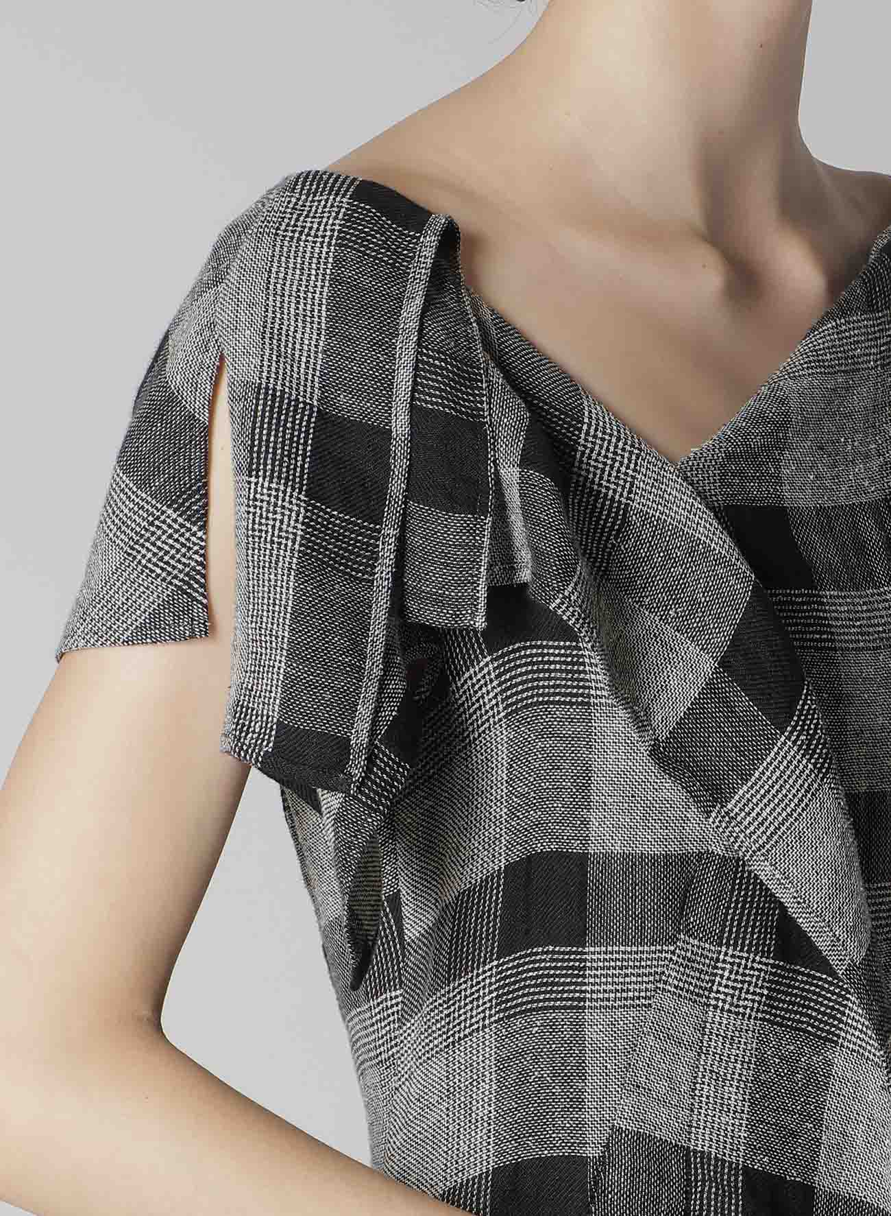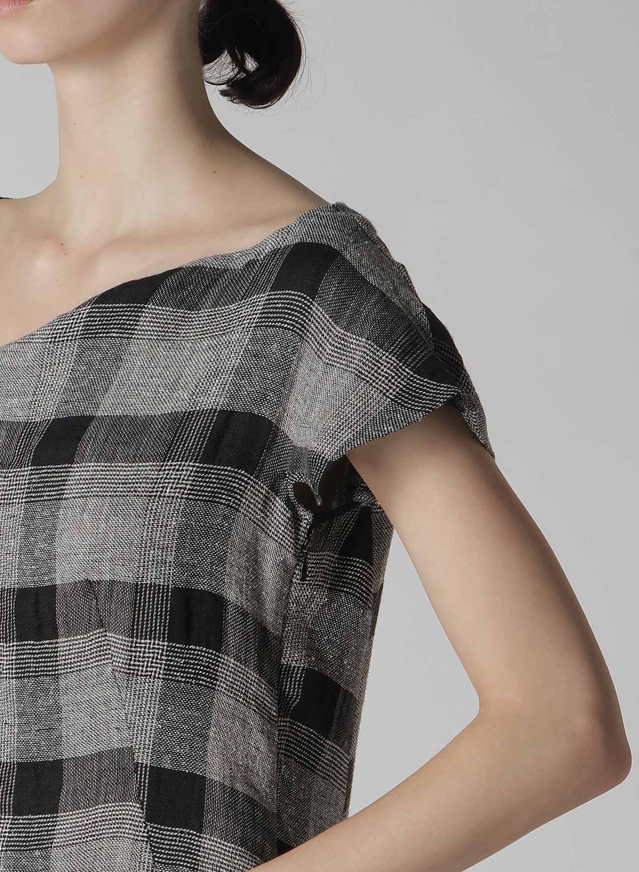 這款DRESS採用LINEN基底並結合絲紗的GLEN PLAID圖案,增添豐富的質感。格紋布料提供柔軟的觸感。方形布料細節位於領口和袖子,為DRESS增添了活潑的動感及獨特的風格。