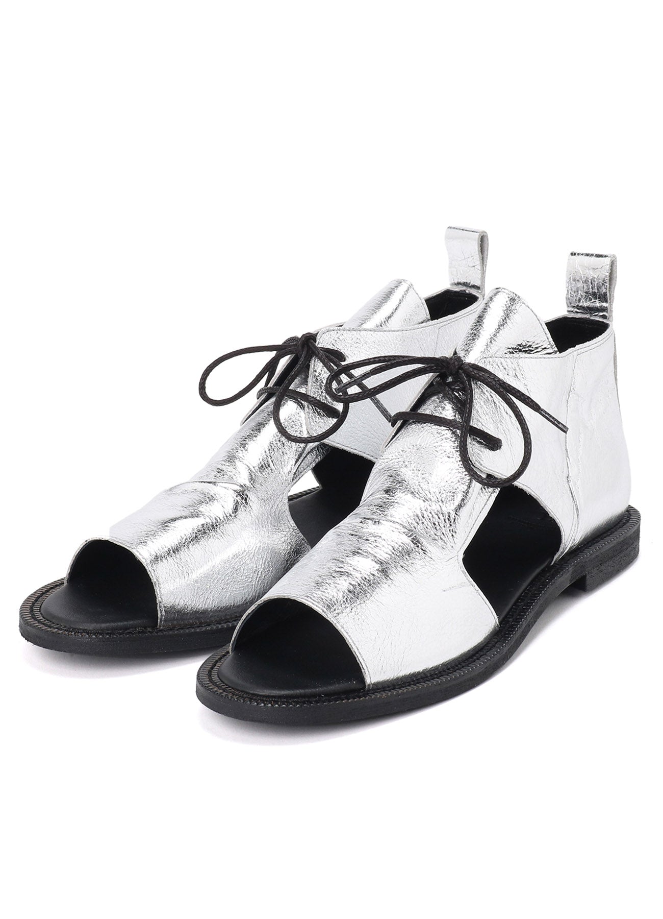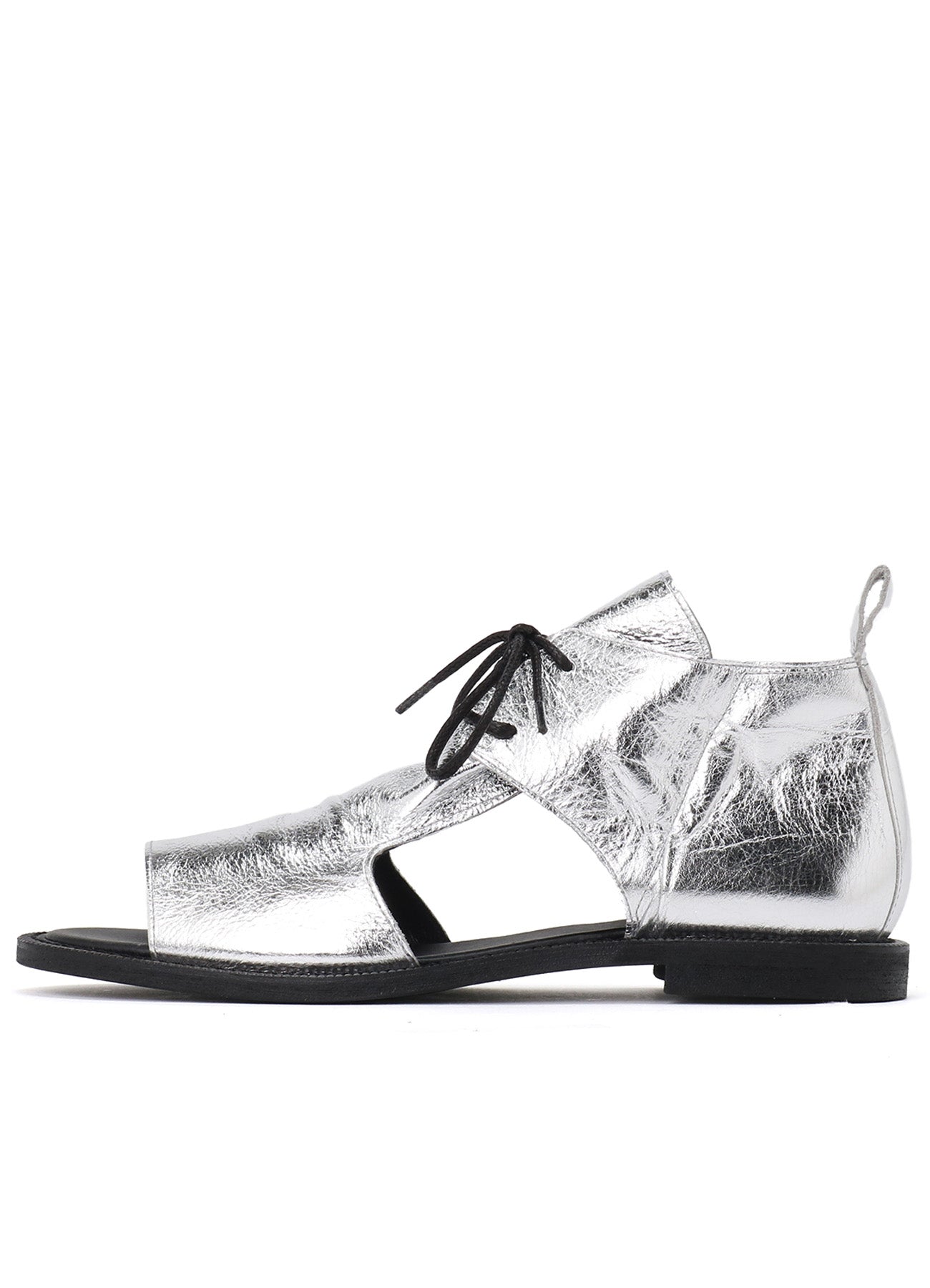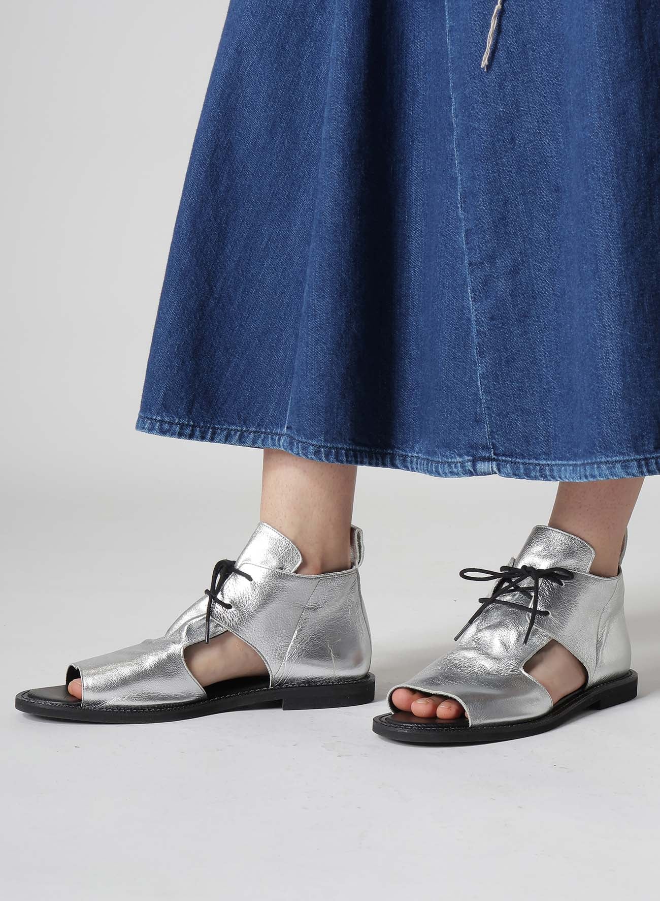 這款柔軟皮革製成的垂墜涼鞋,從腳面到鞋面展現優雅的皺摺作為點綴。經過精確的側面和鞋尖剪裁,提升了腳部的外觀,適合多種場合。銀色款使用箔皮革製成。