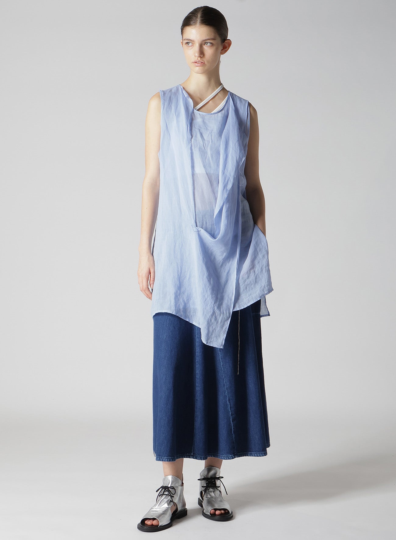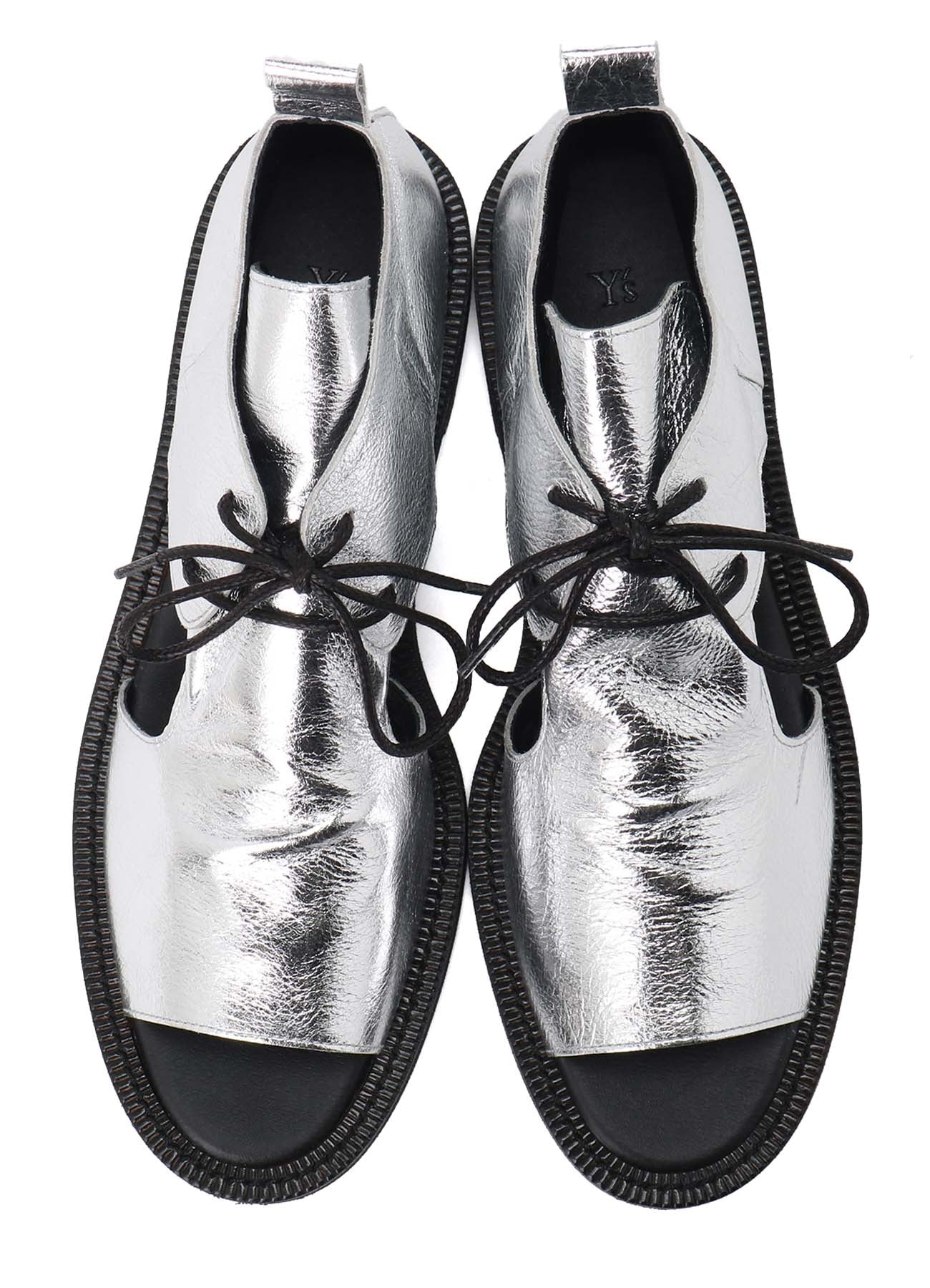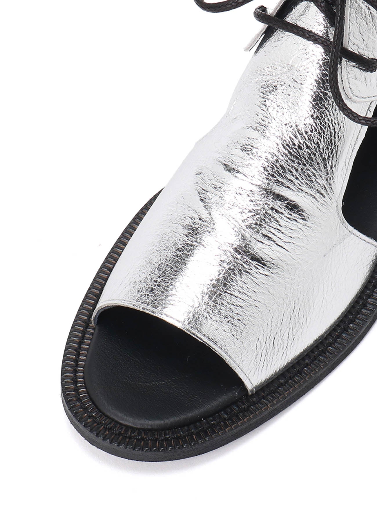 這款柔軟皮革製成的垂墜涼鞋,從腳面到鞋面展現優雅的皺摺作為點綴。經過精確的側面和鞋尖剪裁,提升了腳部的外觀,適合多種場合。銀色款使用箔皮革製成。