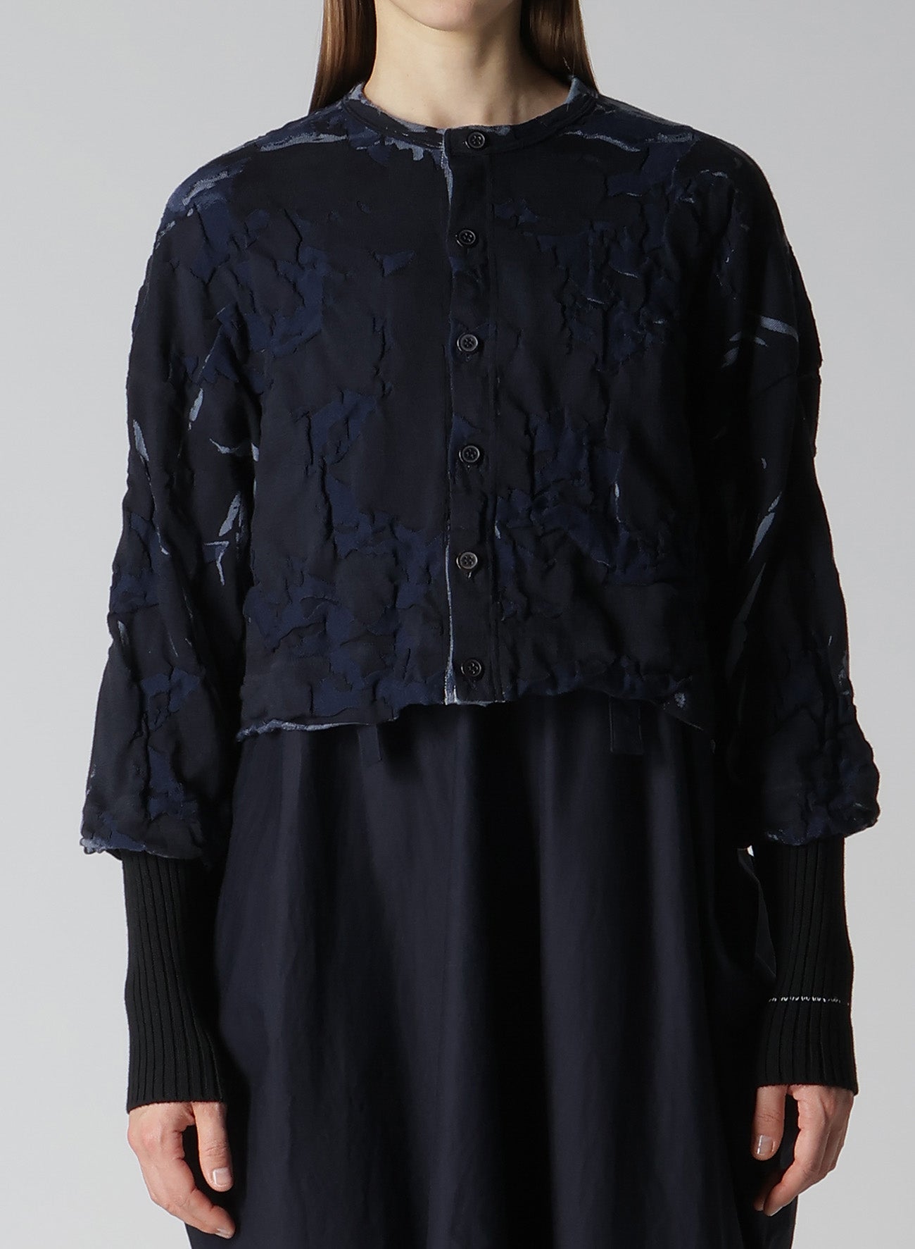 這款短版開襟羊毛衫採用幾何圖案,使用棉和聚酯纖維紗線編織而成,創造出獨特的質感。在製作過程中,每件皆為手工染色,呈現出獨特的漸變色調和質感。設計採用寬鬆版型,短袖設計適合搭配其他上衣或針織品。