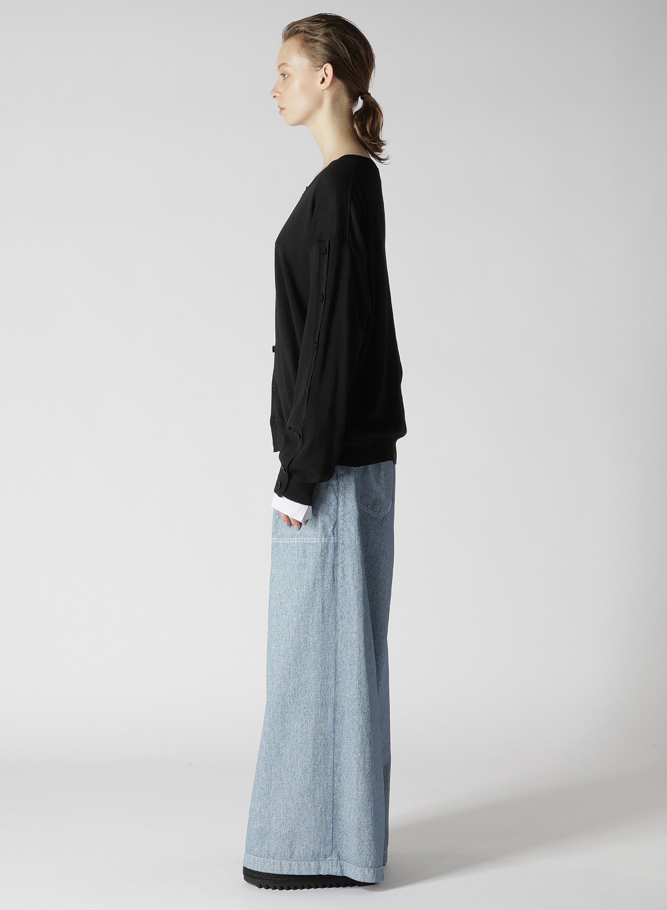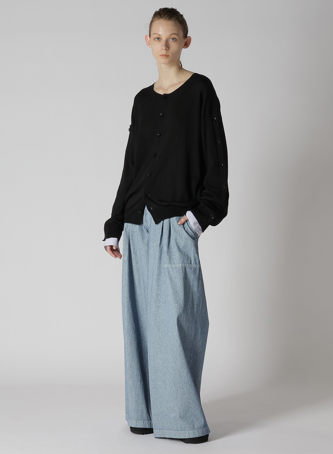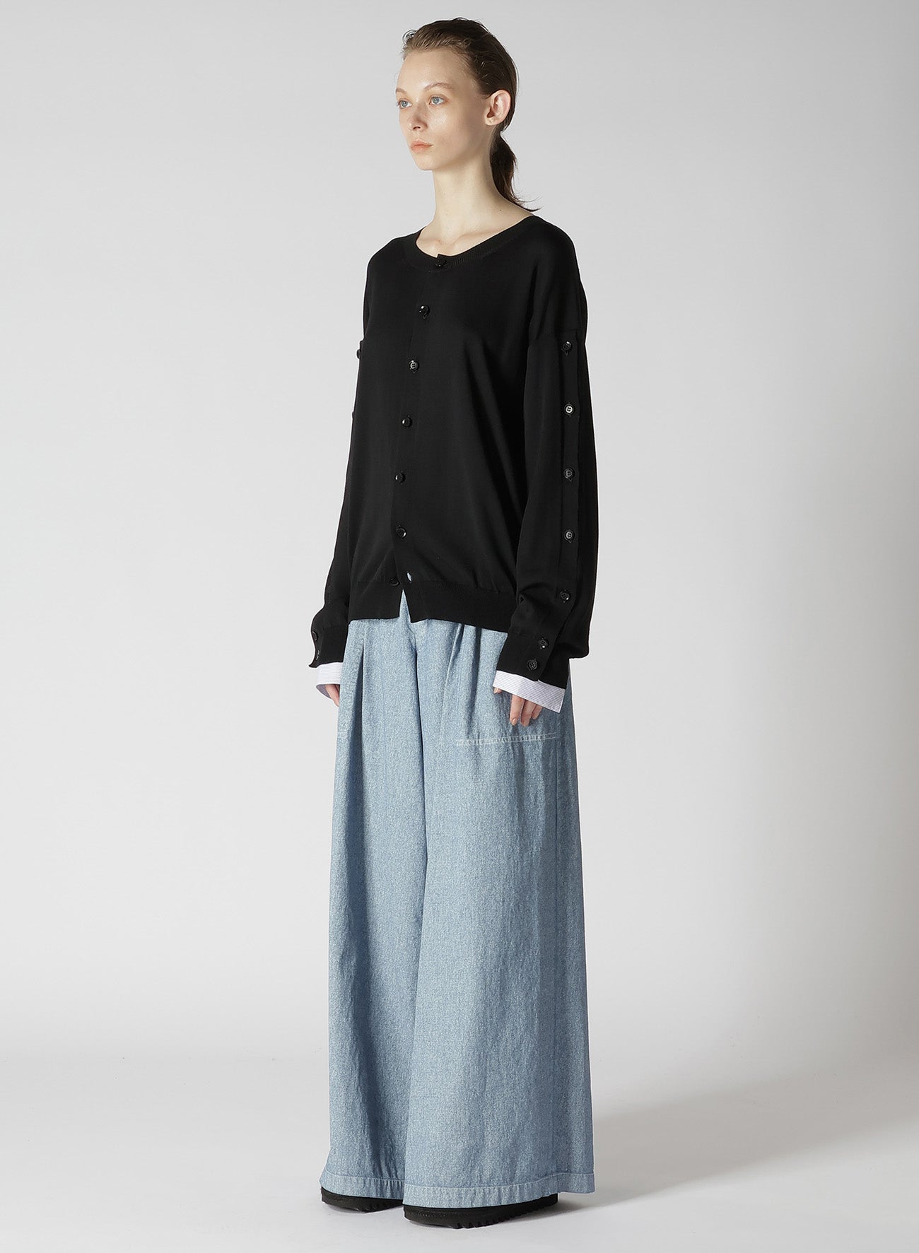 - Buttoned sleeves allow for versatile wearing options.