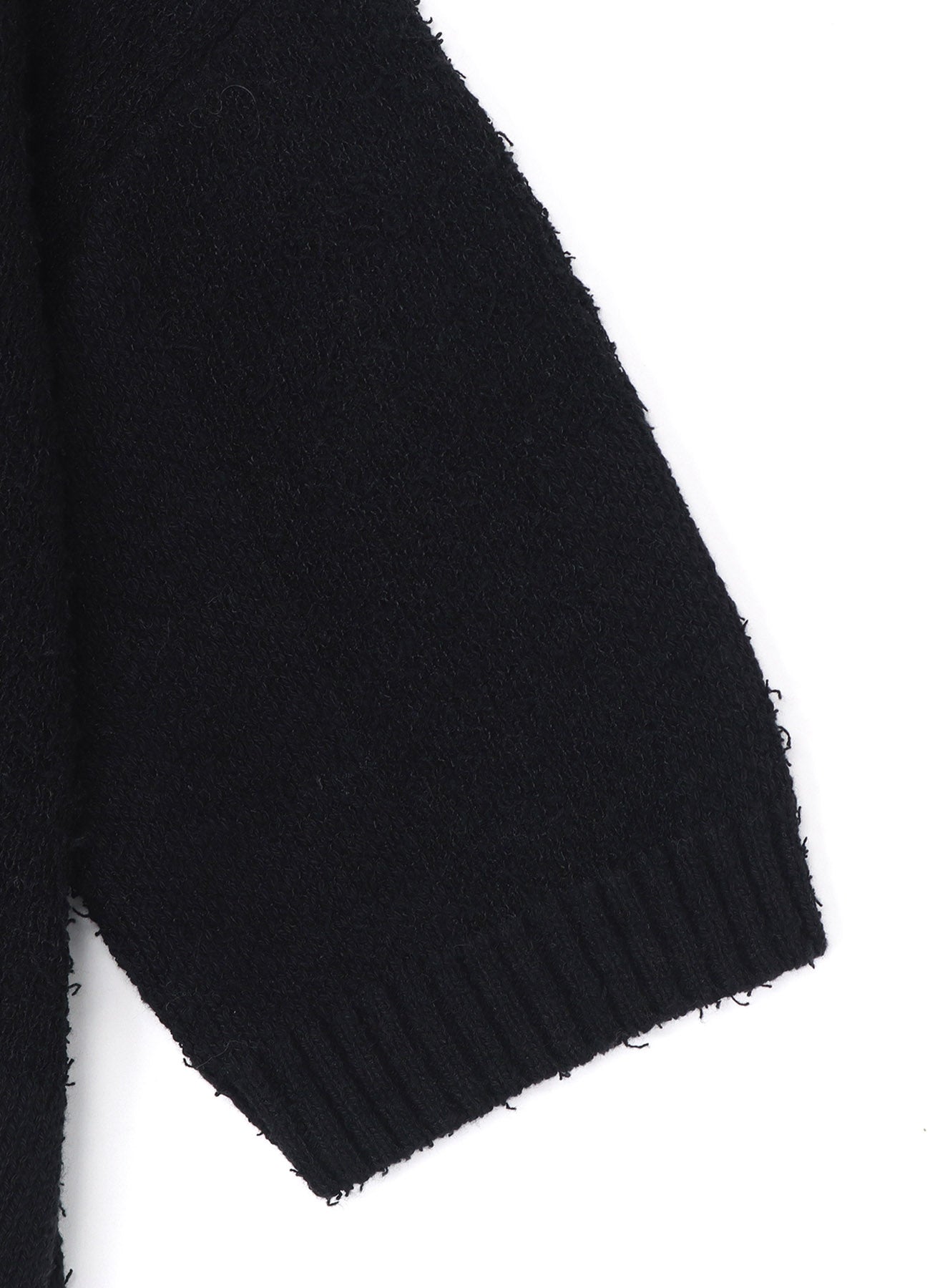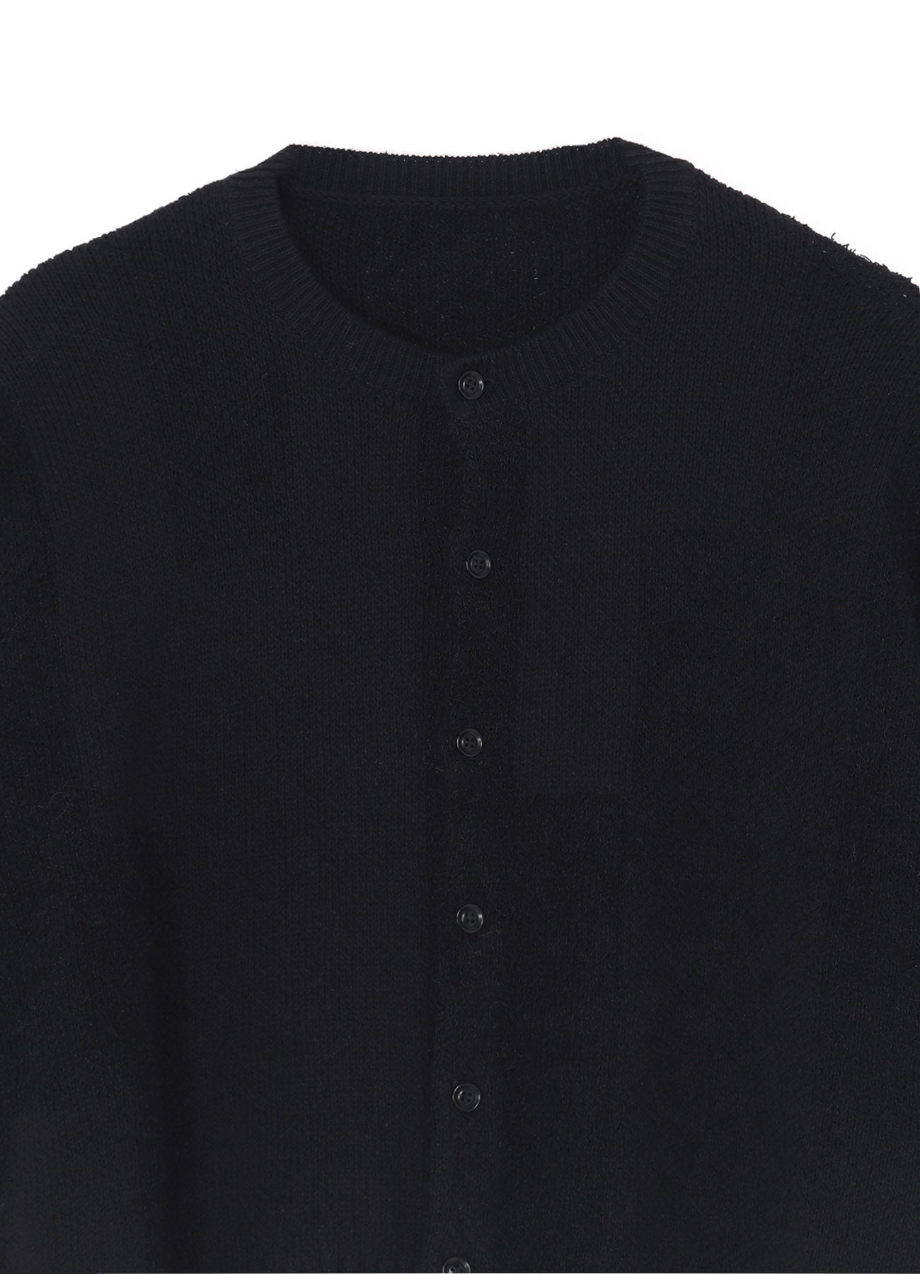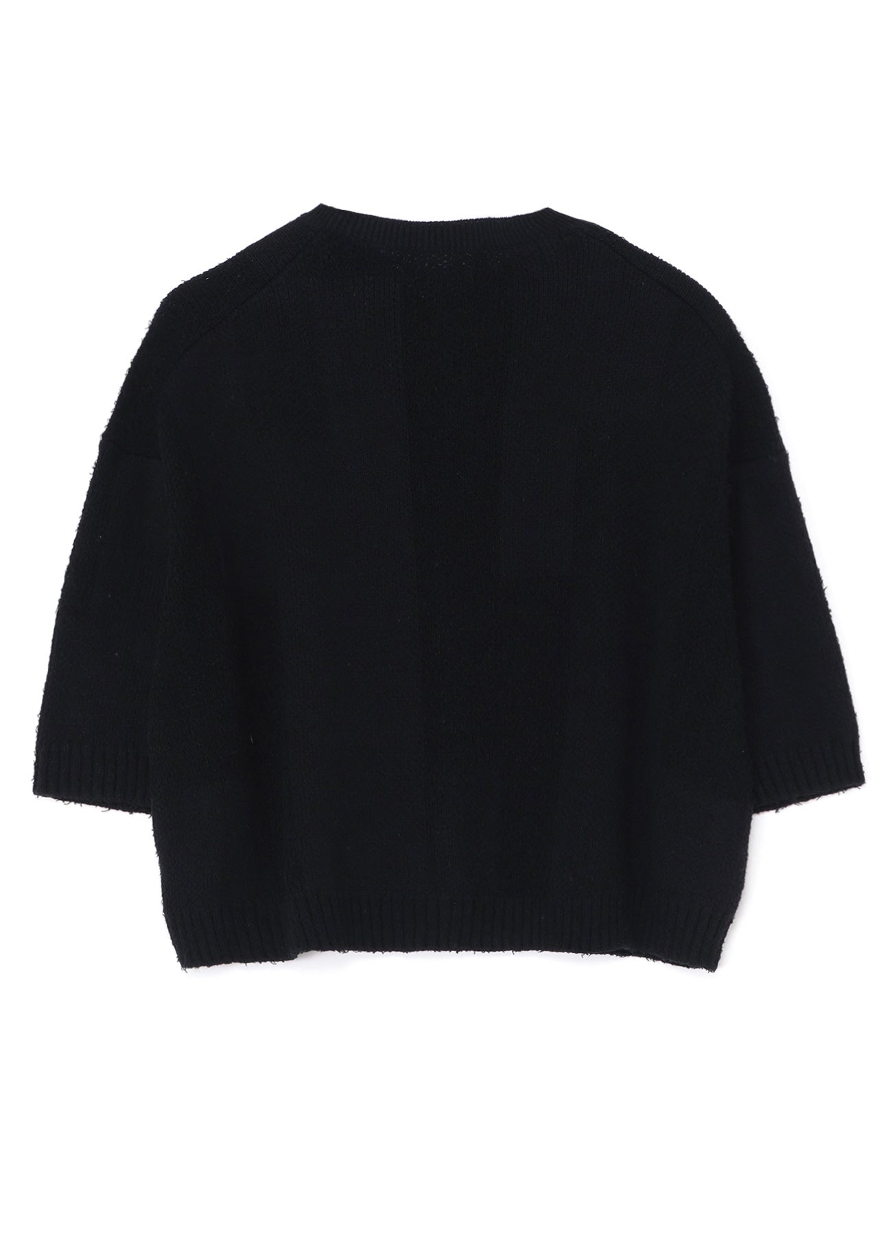 This short-sleeve knit cardigan features a unique block camouflage pattern and is crafted from a combination of cotton boucle thread and thick cord thread, resulting in varying textures and color expressions. Versatile, it can be worn buttoned as a top or as a light outer layer, suitable for various seasons.